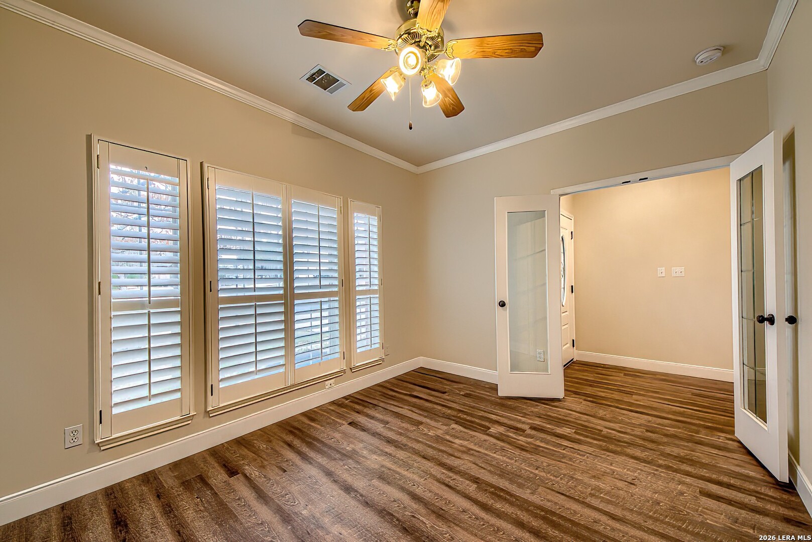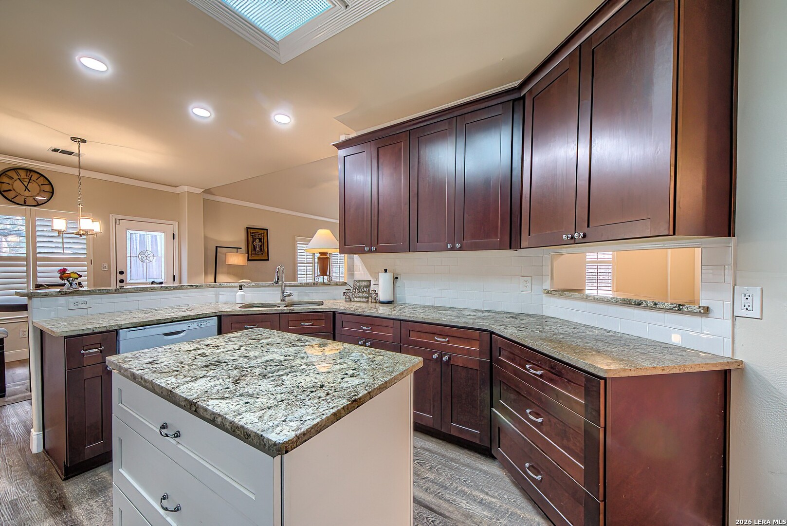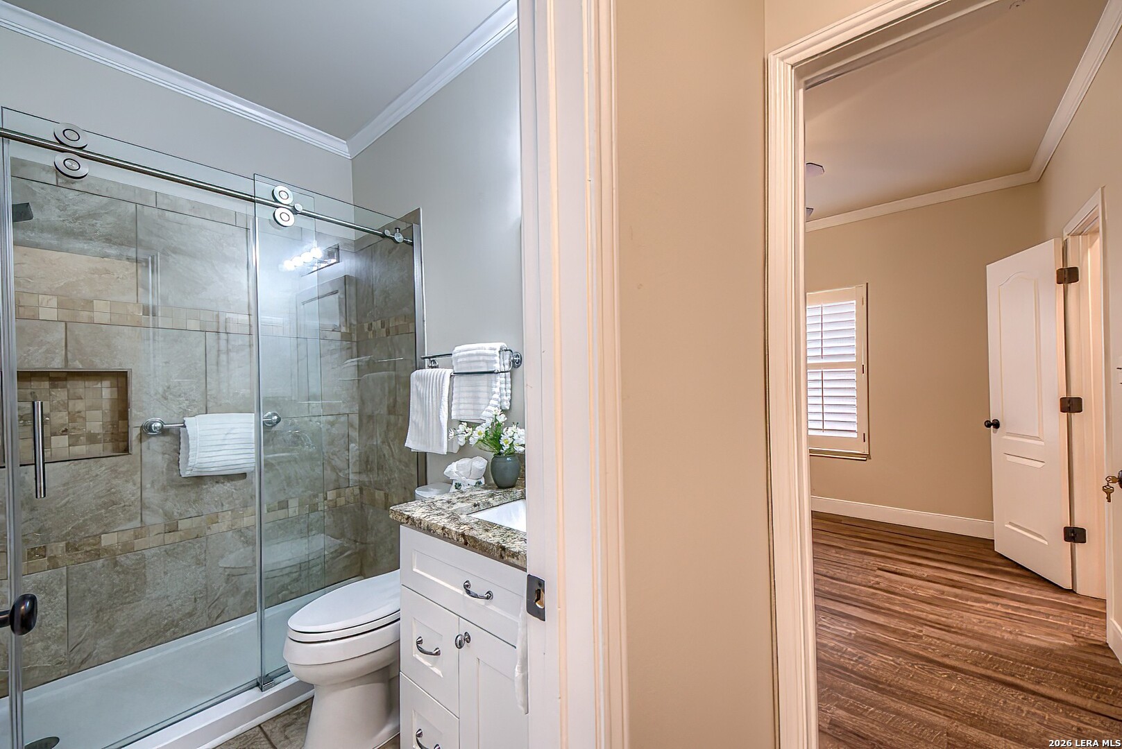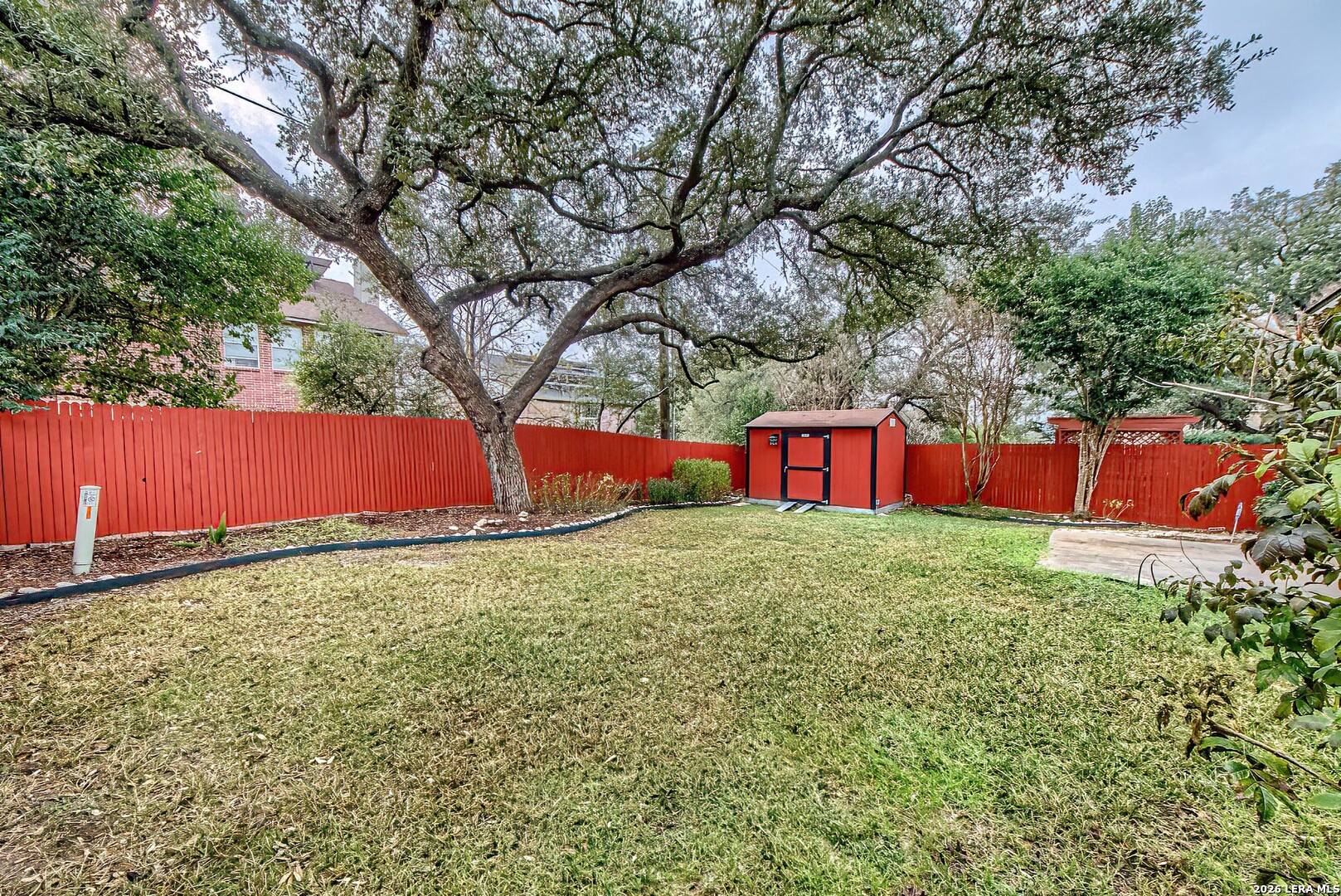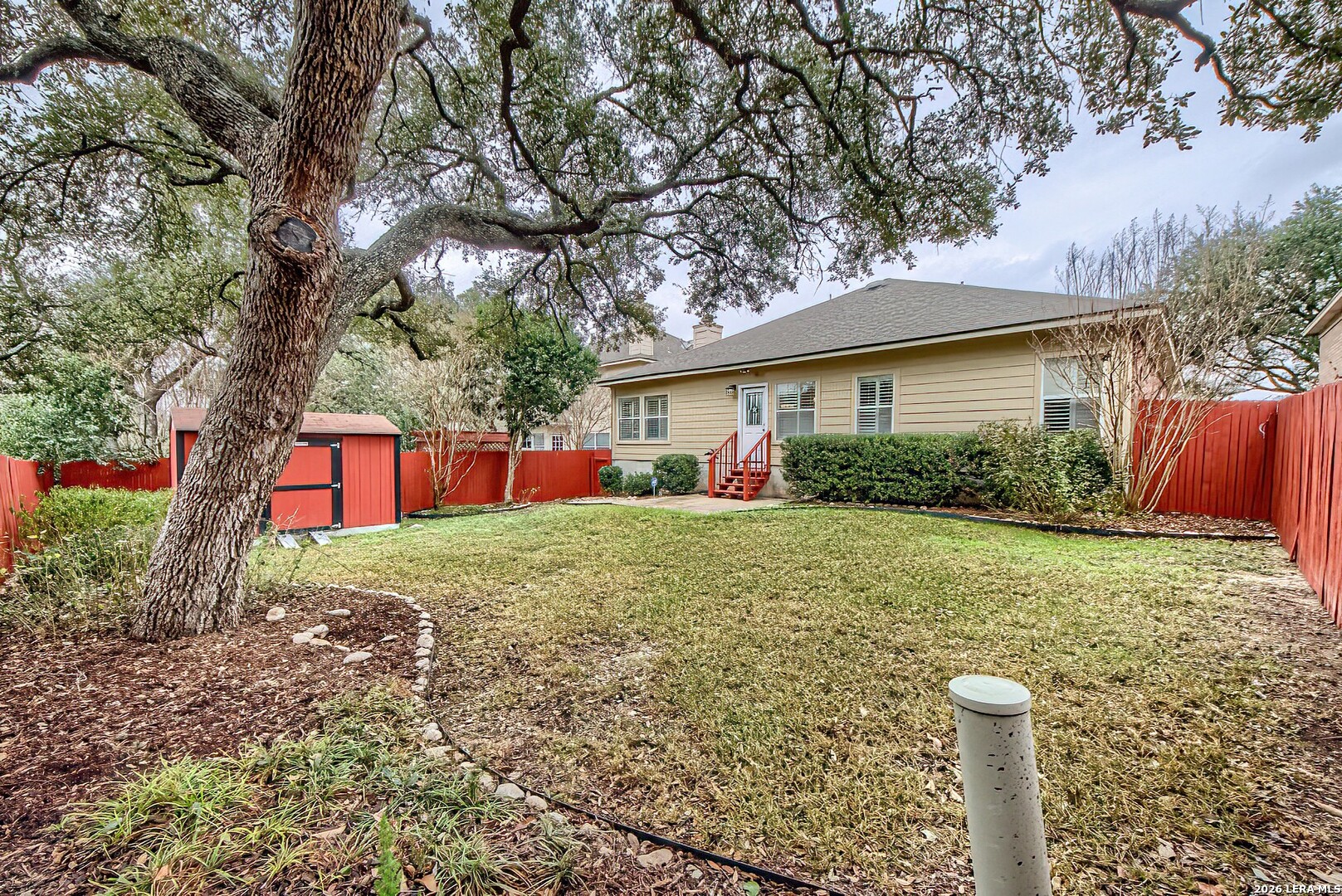 Welcome to this charming move-in ready one-story home in a gated Stone Oak community. Featuring 3 bedrooms and 2 bathrooms this home ideal for comfortable easy living. Interior features include vinyl plank flooring (no carpet), elegant crown molding, plantation shutters and updated lighting fixtures throughout the home. Nice touches to the kitchen include soft close cabinets and drawers, granite countertops, center island and pantry. All bedrooms have walk-in closets; both bathrooms have granite vanities, updated showers providing a fresh and modern feel. The 8x12 Texas Tuff storage shed in backyard is equipped with electricity and offers ample storage; 2 car garage features epoxy flooring, adding durability and a polished look. This delightful home is perfect for those seeking a nicely updated and inviting space in a convenient location.