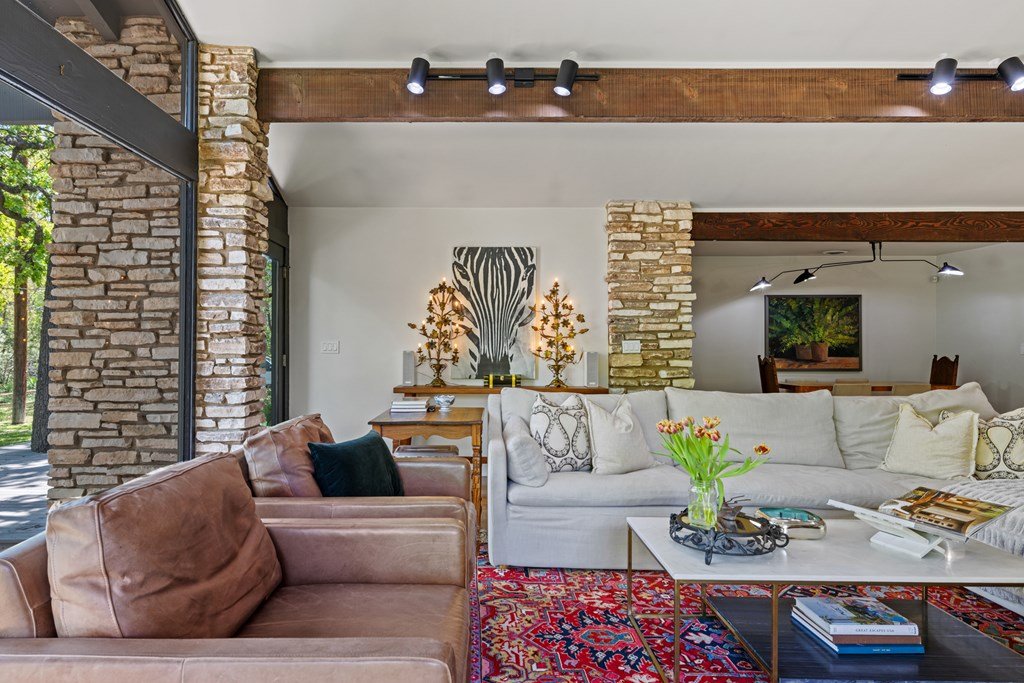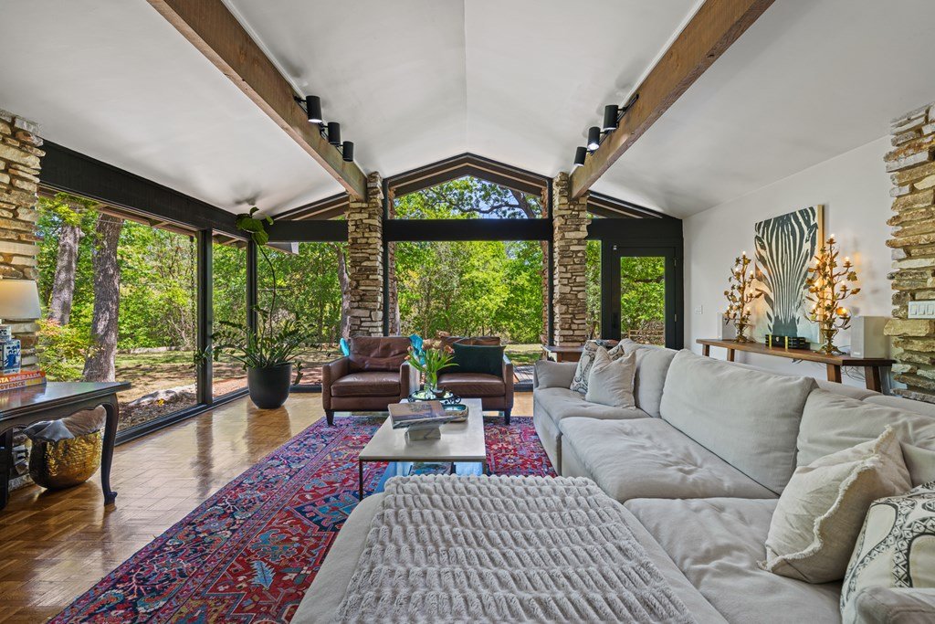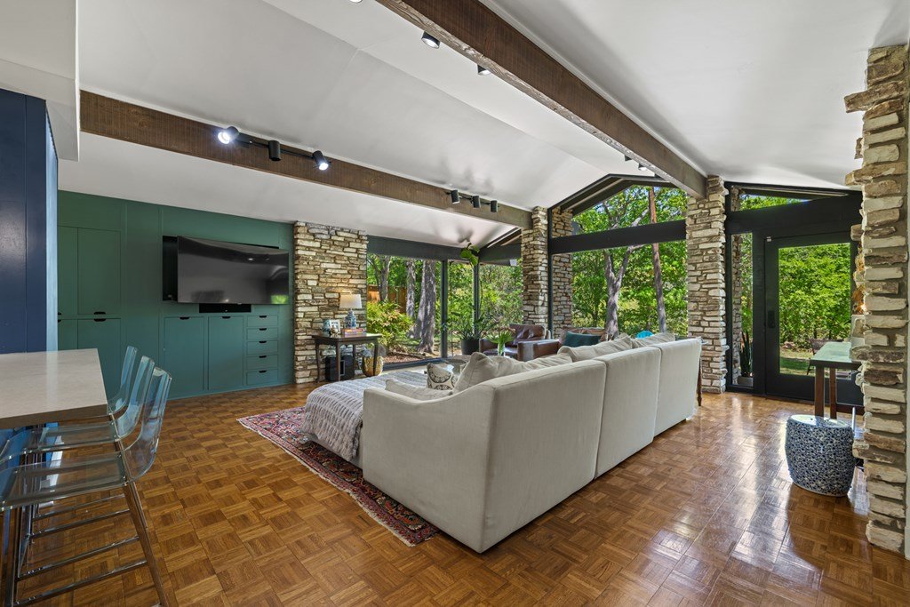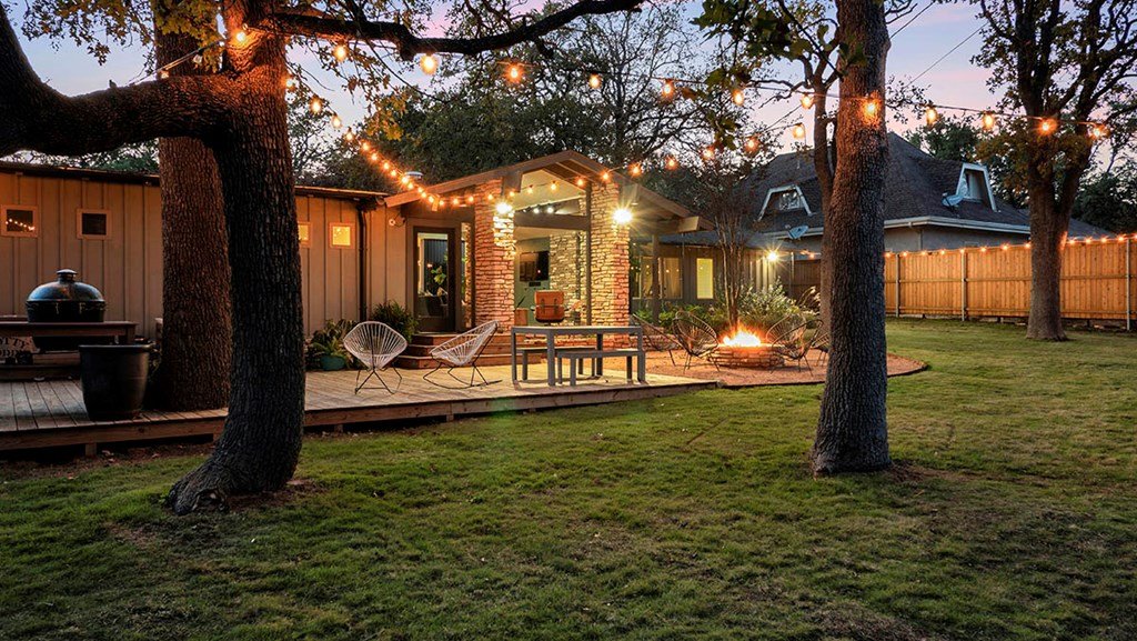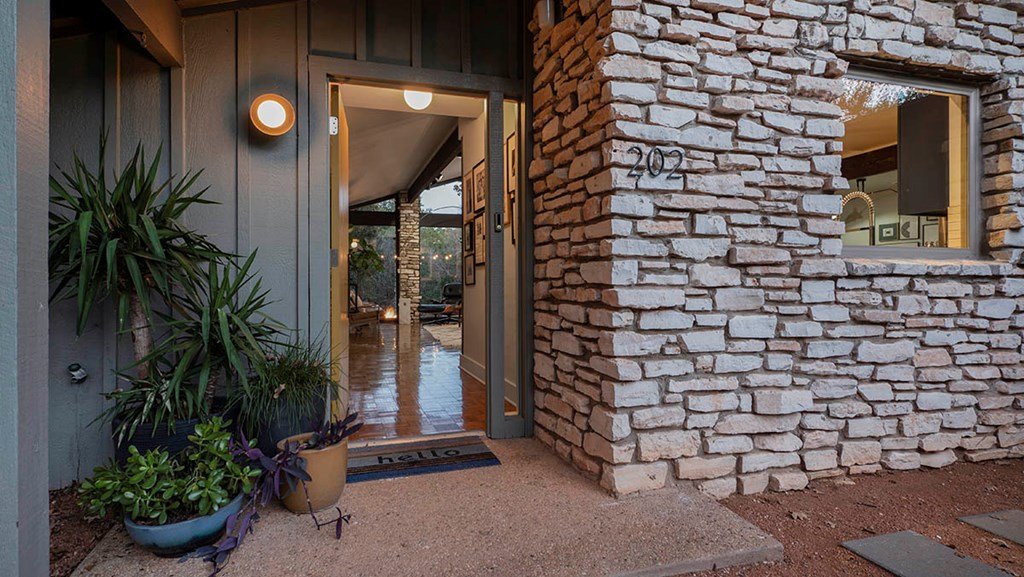 Tucked away just minutes from Fredericksburg's vibrant Main St. sits this beautifully renovated mid-century modern home. With 3 beds/3 baths, this home has been thoughtfully updated to meet modern standards while preserving its unique architectural charm. Step inside to an airy, open-concept living space where exposed wood beams and floor-to-ceiling windows frame serene views of the majestic post oaks. Natural light highlights the rich textures of the modern flooring and inviting design. The heart of the home is ideal for both quiet family evenings and lively gatherings, with seamless flow between the living, dining, and kitchen areas. The fully updated interior includes new plumbing, electrical, ductwork, fixtures, and flooring. Energy efficiency is top of mind, with an instant hot water system and icynene spray foam insulation that keeps the home comfortable year-round. The large yard is a private retreat. A spacious patio, state-of-the-art mosquito misting system, and built-in gas firepit create a tranquil outdoor living space. The tree-lined wet-weather creek provides natural privacy and yet you're just minutes from the heart of Fredericksburg.