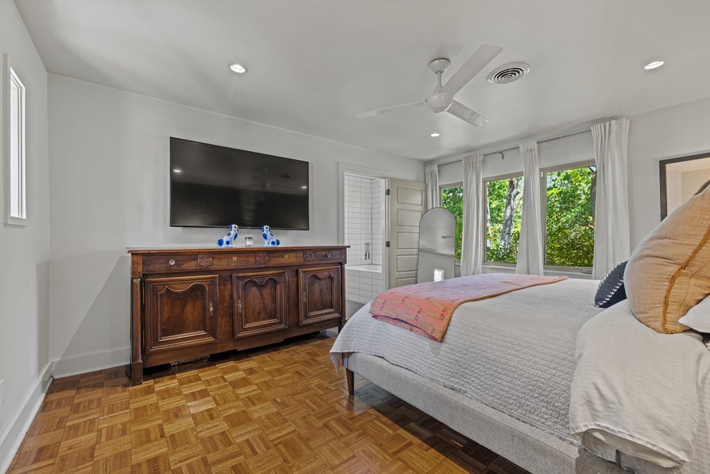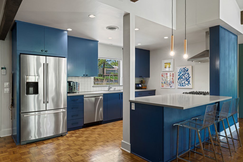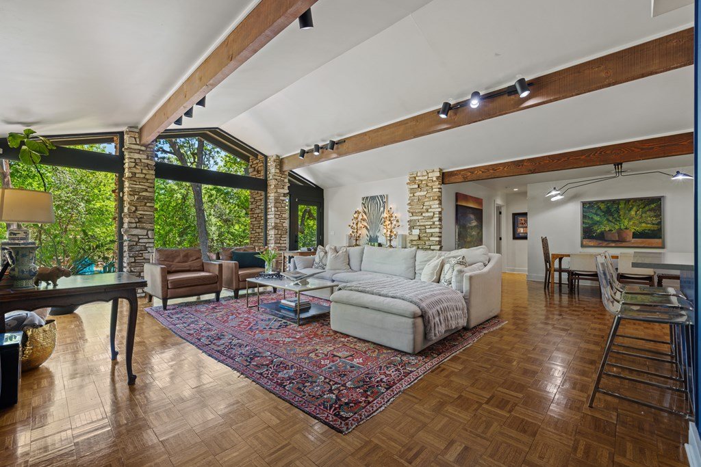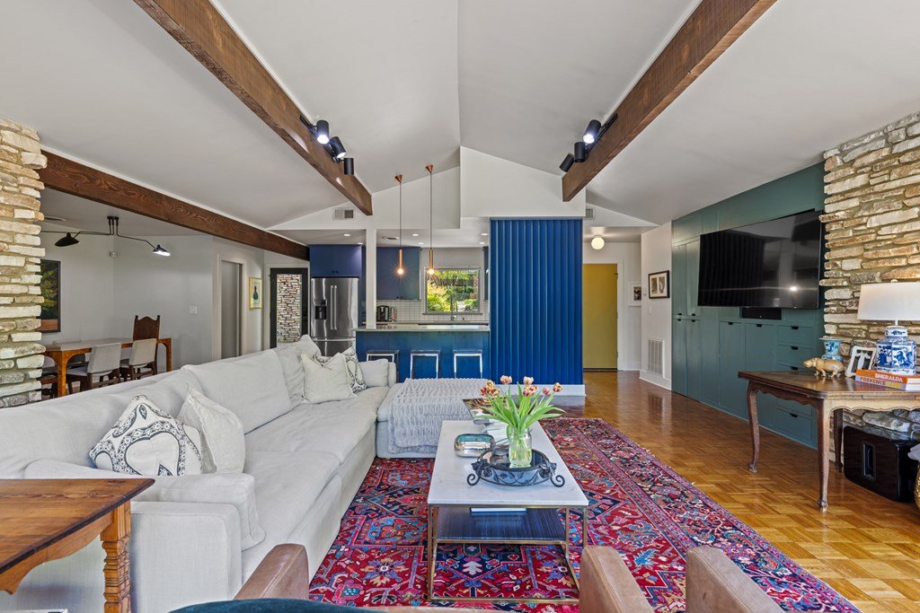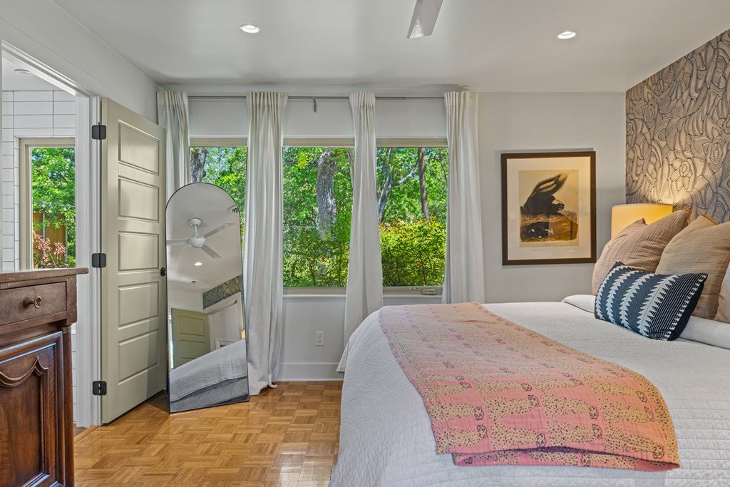 Tucked away just minutes from Fredericksburg's vibrant Main St. sits this beautifully renovated mid-century modern home. With 3 beds/3 baths, this home has been thoughtfully updated to meet modern standards while preserving its unique architectural charm. Step inside to an airy, open-concept living space where exposed wood beams and floor-to-ceiling windows frame serene views of the majestic post oaks. Natural light highlights the rich textures of the modern flooring and inviting design. The heart of the home is ideal for both quiet family evenings and lively gatherings, with seamless flow between the living, dining, and kitchen areas. The fully updated interior includes new plumbing, electrical, ductwork, fixtures, and flooring. Energy efficiency is top of mind, with an instant hot water system and icynene spray foam insulation that keeps the home comfortable year-round. The large yard is a private retreat. A spacious patio, state-of-the-art mosquito misting system, and built-in gas firepit create a tranquil outdoor living space. The tree-lined wet-weather creek provides natural privacy and yet you're just minutes from the heart of Fredericksburg.