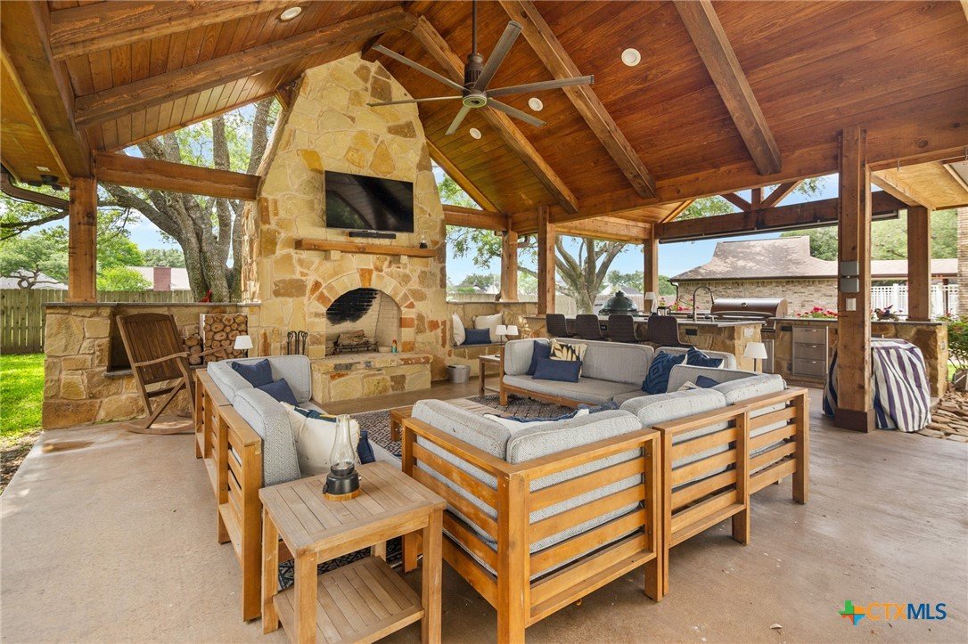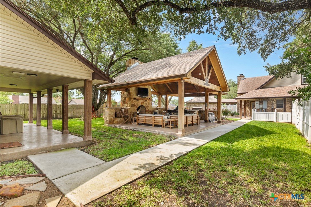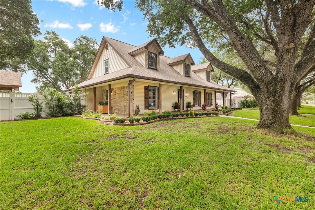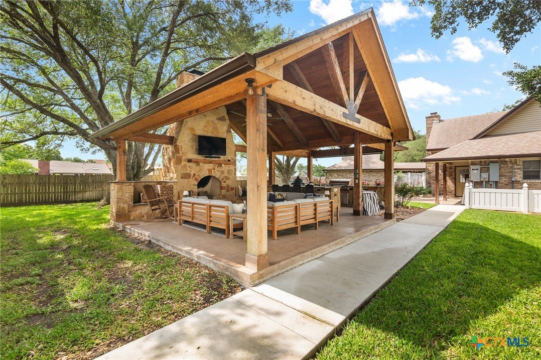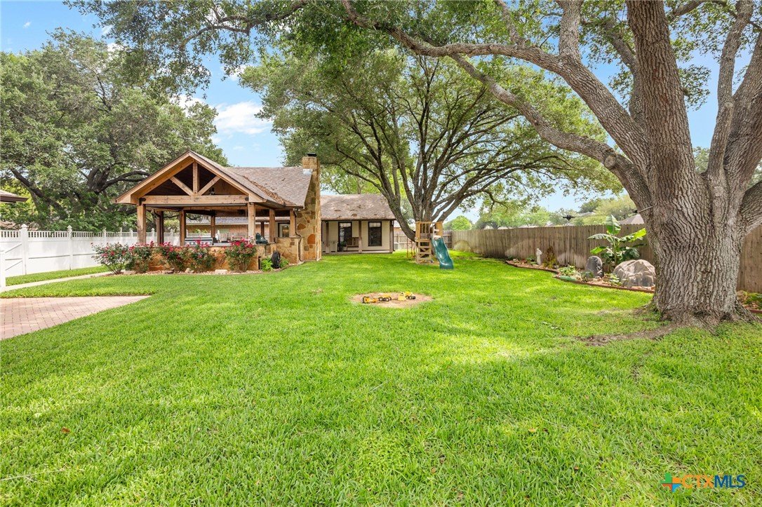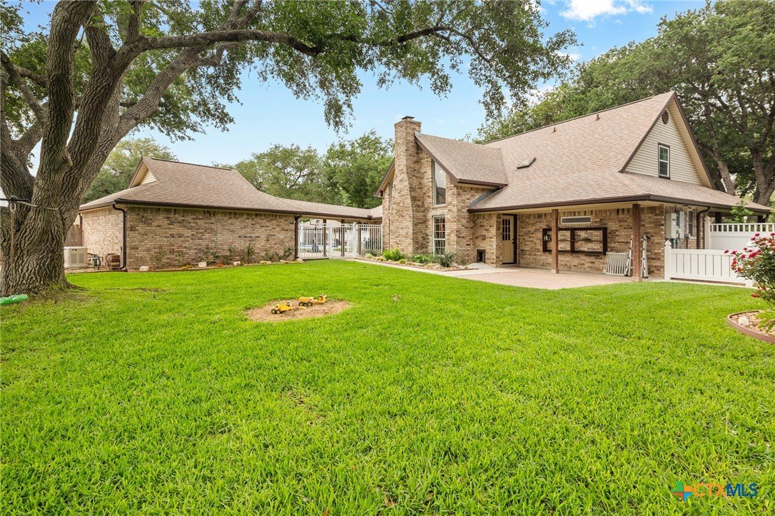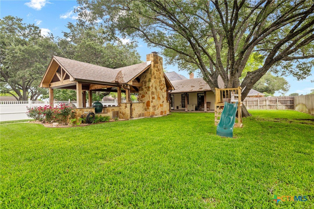 Welcome to 203 Champions Row, an exceptional property nestled in the heart of Country Club Village. Situated on three oversized, oak-shaded lots, this home offers the perfect blend of space, elegance, and comfort—inside and out. Step inside to a warm and inviting interior, where natural light fills the thoughtfully designed spaces. The show-stopping floor-to-ceiling rock fireplace serves as the dramatic centerpiece of the main living area, instantly drawing the eye and creating a cozy, welcoming atmosphere. The primary suite is conveniently located on the main floor, while upstairs features two spacious bedrooms and a flexible loft area, ideal as a game room, second living space, or reading nook. Outdoors, enjoy the ultimate in Texas-style living with a split-yard design offering two distinct outdoor spaces: One side features a custom-built pavilion with a stunning stone fireplace, built-in grill, and ample seating—perfect for entertaining year-round. Just beyond, you'll find a fully equipped mother-in-law suite, complete with a full bathroom, kitchenette, living/bedroom area, and a bonus room that can serve as a home office, storage space, or private guest room. The opposite side of the yard is a resort-style retreat with a refreshing pool, waterslide, and a pergola-covered lounge area for relaxing in the sun. From the storybook curb appeal to the thoughtfully upgraded features, this home is the definition of versatile luxury in a prime location. Don't miss your chance to tour this stunning property—schedule your private showing today!