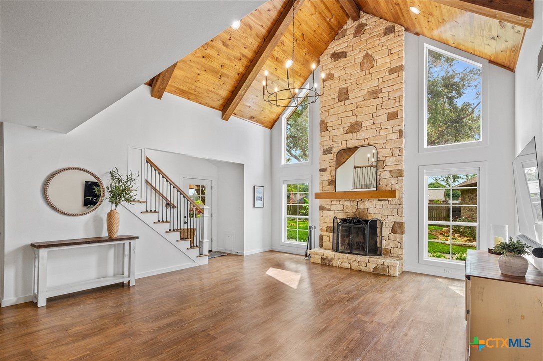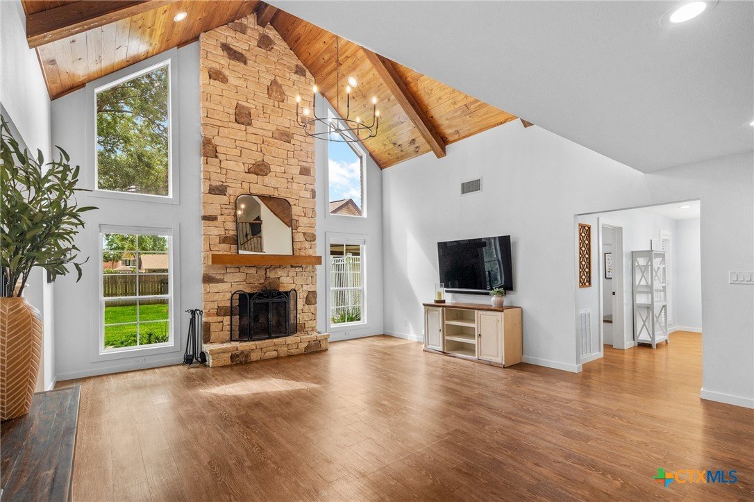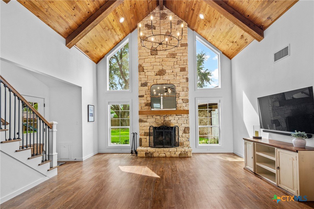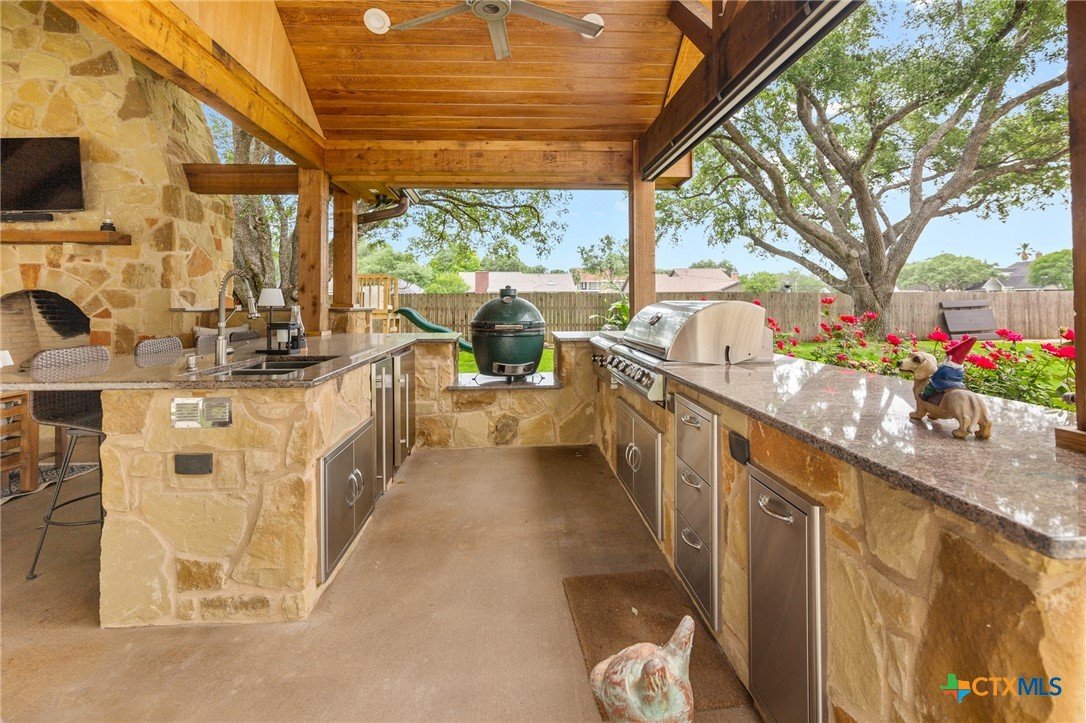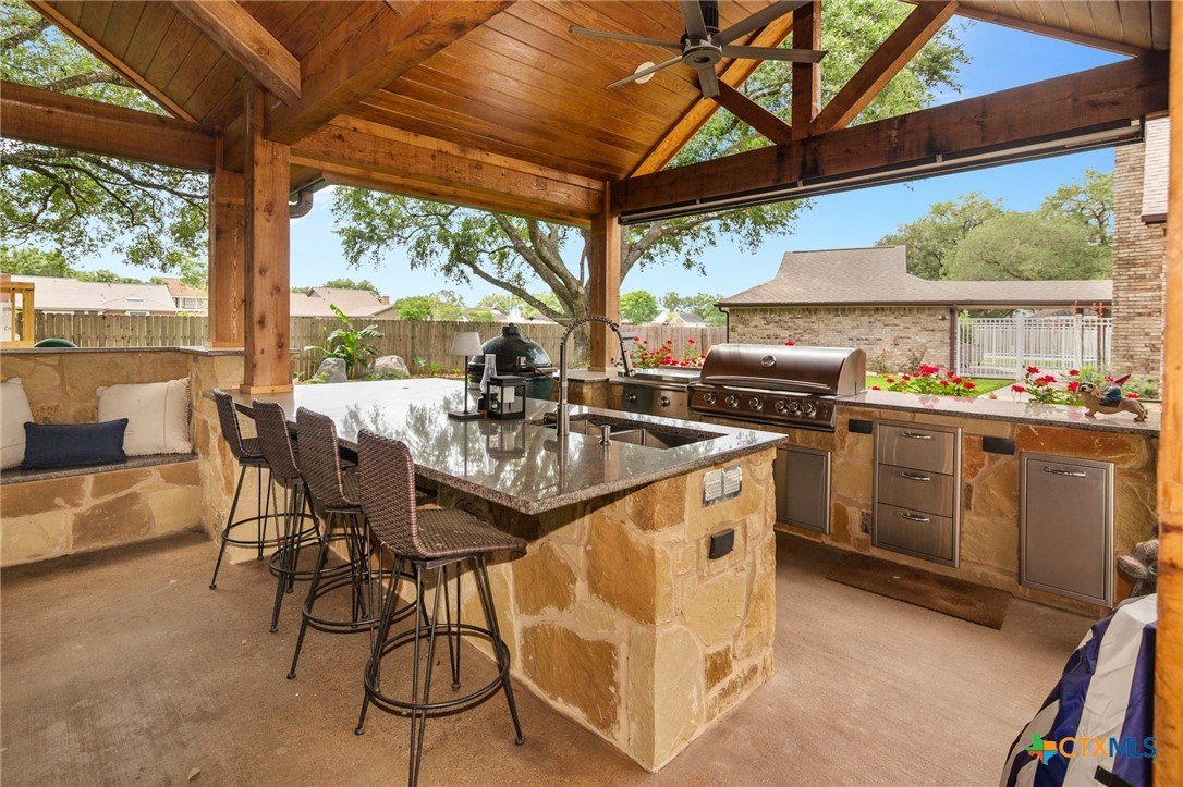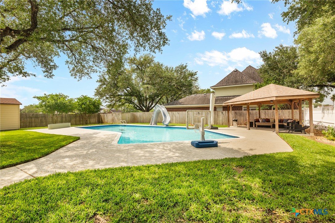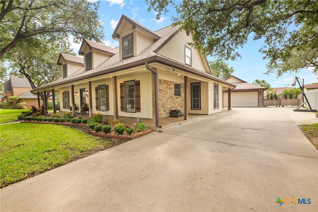 Welcome to 203 Champions Row, an exceptional property nestled in the heart of Country Club Village. Situated on three oversized, oak-shaded lots, this home offers the perfect blend of space, elegance, and comfort—inside and out. Step inside to a warm and inviting interior, where natural light fills the thoughtfully designed spaces. The show-stopping floor-to-ceiling rock fireplace serves as the dramatic centerpiece of the main living area, instantly drawing the eye and creating a cozy, welcoming atmosphere. The primary suite is conveniently located on the main floor, while upstairs features two spacious bedrooms and a flexible loft area, ideal as a game room, second living space, or reading nook. Outdoors, enjoy the ultimate in Texas-style living with a split-yard design offering two distinct outdoor spaces: One side features a custom-built pavilion with a stunning stone fireplace, built-in grill, and ample seating—perfect for entertaining year-round. Just beyond, you'll find a fully equipped mother-in-law suite, complete with a full bathroom, kitchenette, living/bedroom area, and a bonus room that can serve as a home office, storage space, or private guest room. The opposite side of the yard is a resort-style retreat with a refreshing pool, waterslide, and a pergola-covered lounge area for relaxing in the sun. From the storybook curb appeal to the thoughtfully upgraded features, this home is the definition of versatile luxury in a prime location. Don't miss your chance to tour this stunning property—schedule your private showing today!