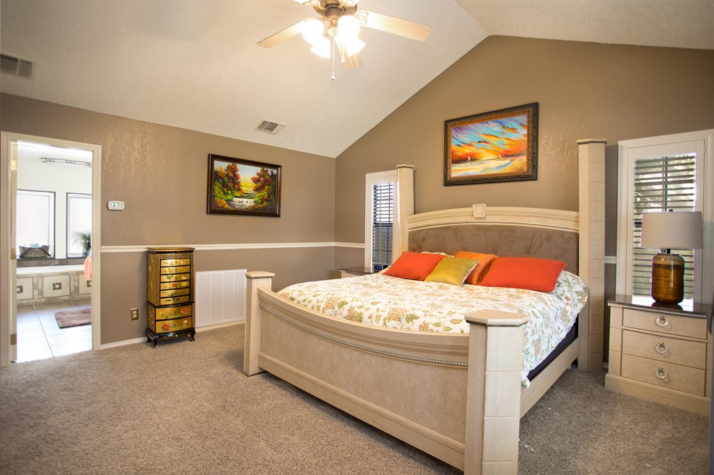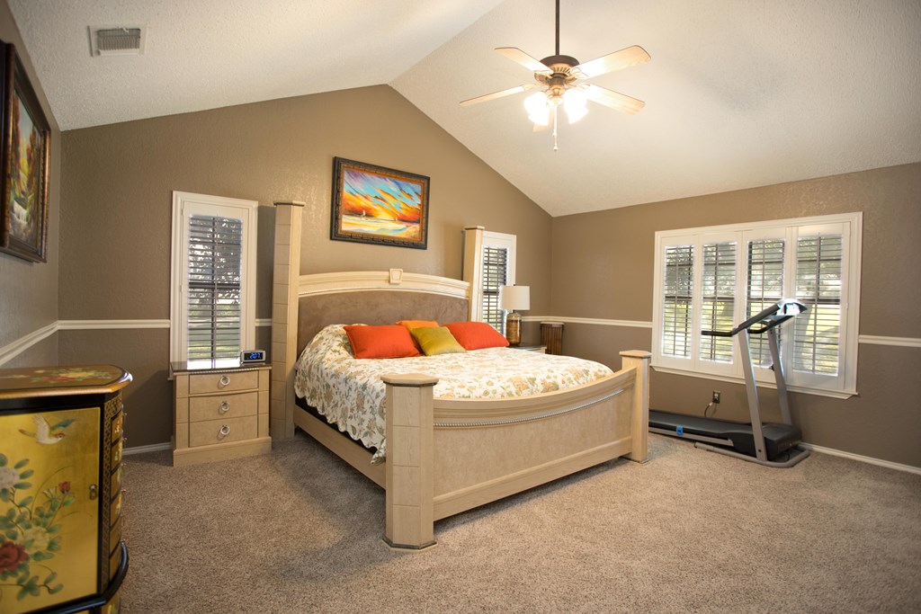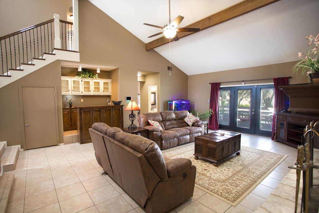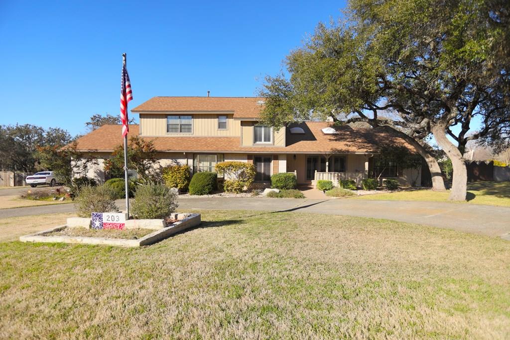 Large Upgraded Riverhill Home located on an approx. 1/2 acre corner lot. Home boasts a high ceiling, grand fireplace, and wet bar in the large living room. Kitchen includes upgraded counters and lots of cabinet space. Downstairs also has a dining room, office, and second seating area, plus utility room. Master bedroom is on the main floor and has vaulted ceiling, new carpet, new paint, and a newly upgraded master bath with separate shower and soaking tub. Upstairs are two large bedrooms with and bath. Many upgrades including new roof in 2016, 3 new energy efficient HVAC units, new paint inside and out, new carpet in bedrooms. Backyard is fenced and has a large deck. 2-car garage plus conditioned workshop. Lots of parking with a circular driveway plus second driveway to garage.