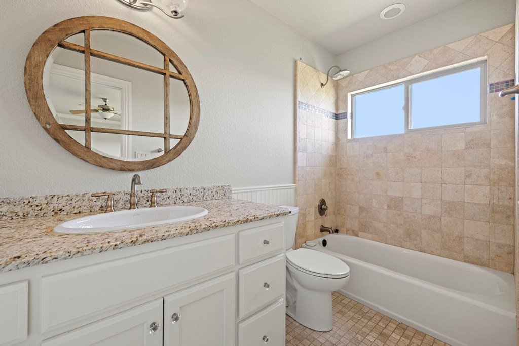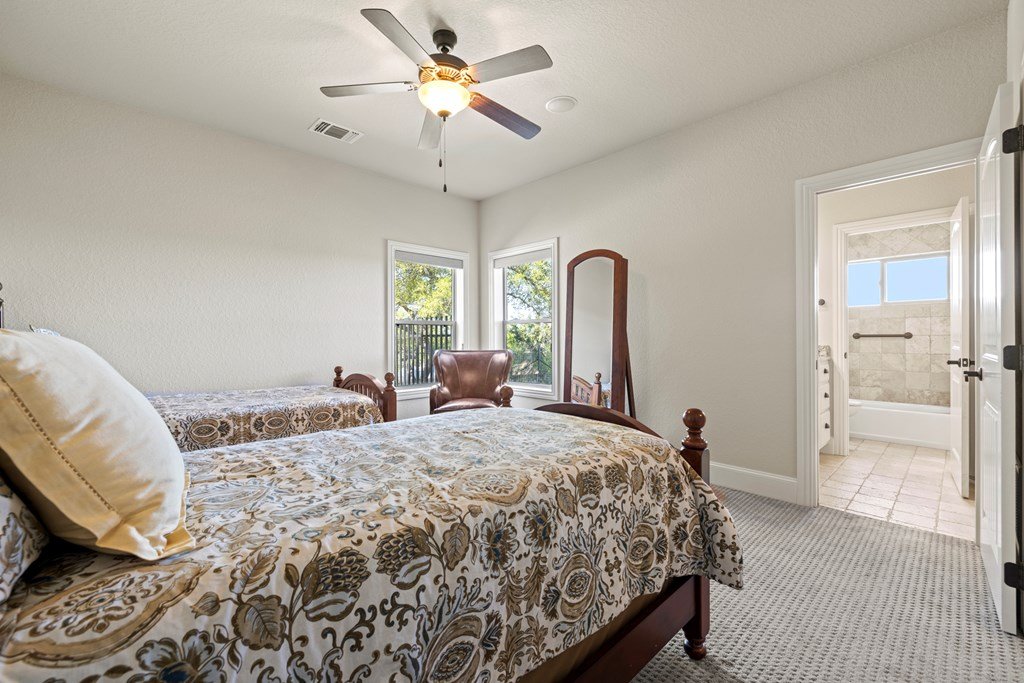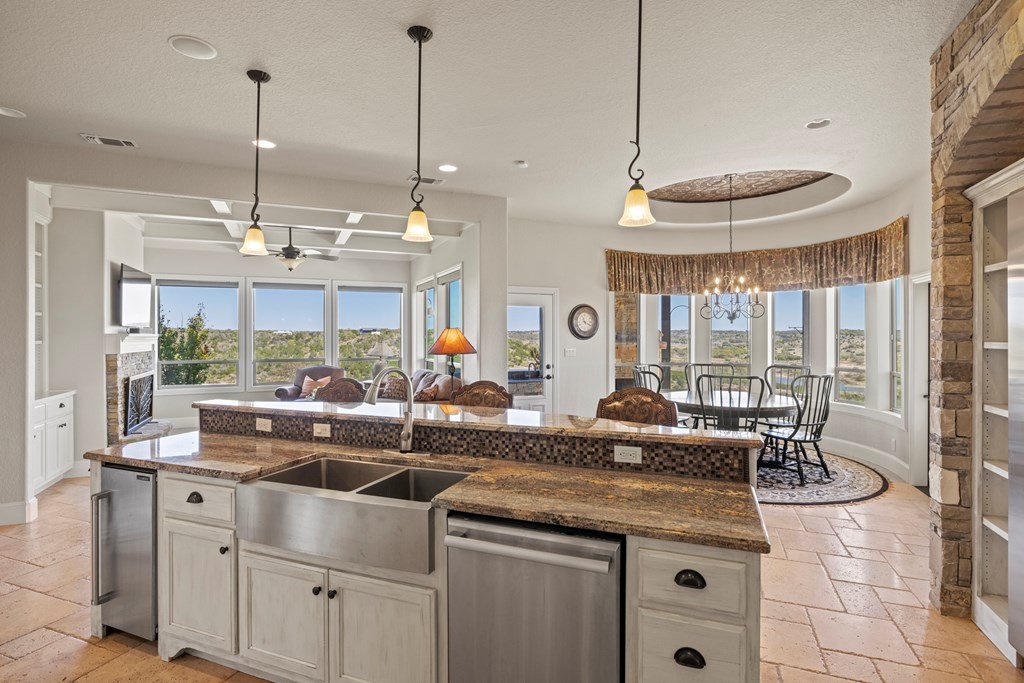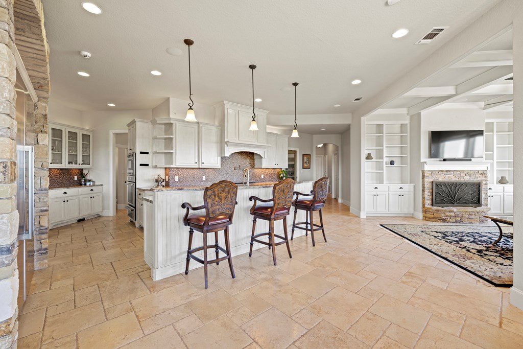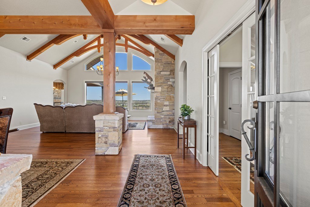 Stunning Hill Country Estate w/Breathtaking Views! Perched atop a scenic hill, this custom home offers unparalleled views & serene living within the gated Eagles Crests. Spanning 4000 + sf, the 4B/3.5B residence provides ample space & privacy on 7+ acres only 7 mi. from Fredericksburg Tx. Located at end of a quiet cul-de-sac, the home boasts eye-catching curb appeal w/custom fencing & simple yet elegant landscaped grounds. At the heart of the home is the Great Room, featuring a grand rock fireplace, exposed beams & soaring cathedral ceiling w/wood & Travertine flooring that exudes warmth & elegance. Adjacent to this inviting space is a study & formal dining area, ideal for hosting gatherings & special occasions. The chef's kitchen is equipped w/top-of-the-line Thermador stainless steel appliances, custom cabinetry, lg walk in pantry, bar/island area & ice maker. The adjoining breakfast area & den w/FP offers stunning views, making it a delightful place to start the day. The main bedroom suite is a private oasis, w/back & a secluded side patio access & outdoor shower. Includes outdoor kitchen, rock FP, exceptional views & much more! A truly exceptional place to call home.