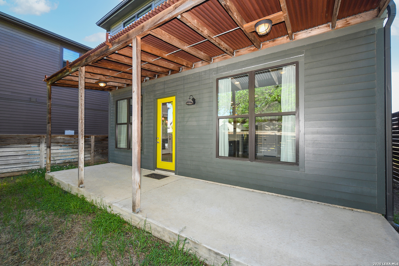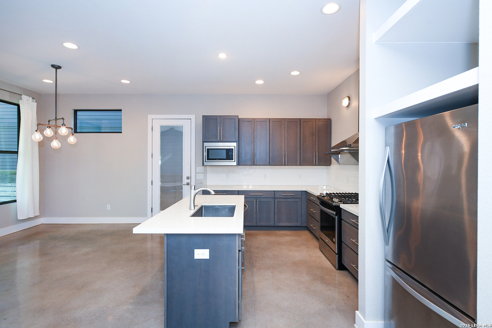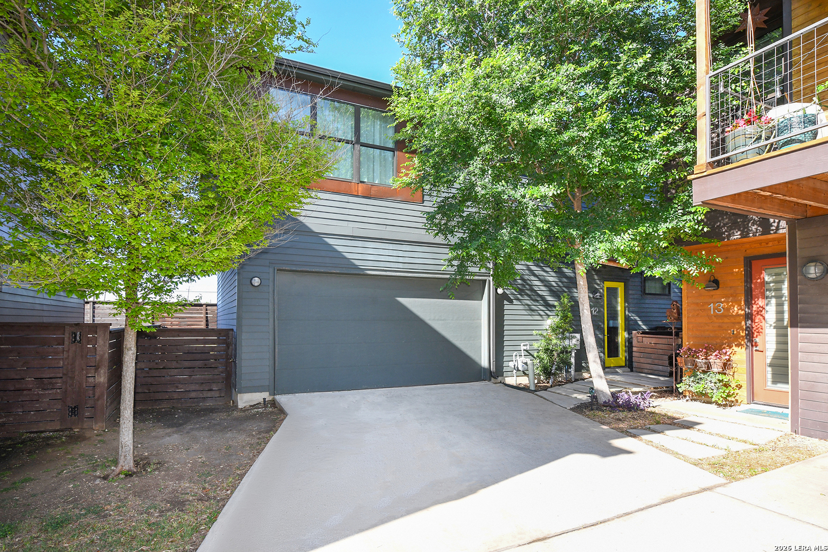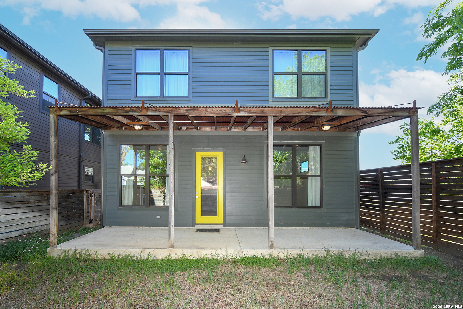 Stunning 3-bedroom, 2.5-bath home featuring a spacious open-concept design. The kitchen and living area showcase custom cabinetry, a large quartz island, concrete floors, and stainless steel appliances, including a refrigerator, perfect for both everyday living and entertaining. All bedrooms and the utility room are conveniently located upstairs. The primary suite offers a private ensuite bath and an expansive walk-in closet. Enjoy a private backyard with a covered patio, ideal for relaxing or hosting guests. Located just minutes from Blue Star Arts Complex and close to the Mission Reach, this home provides easy access to dining, entertainment, and outdoor recreation.