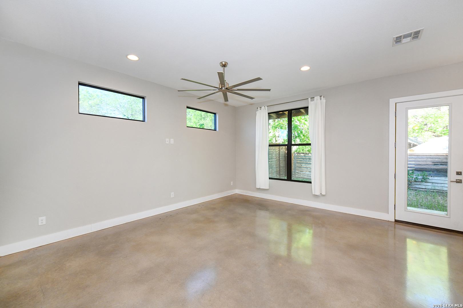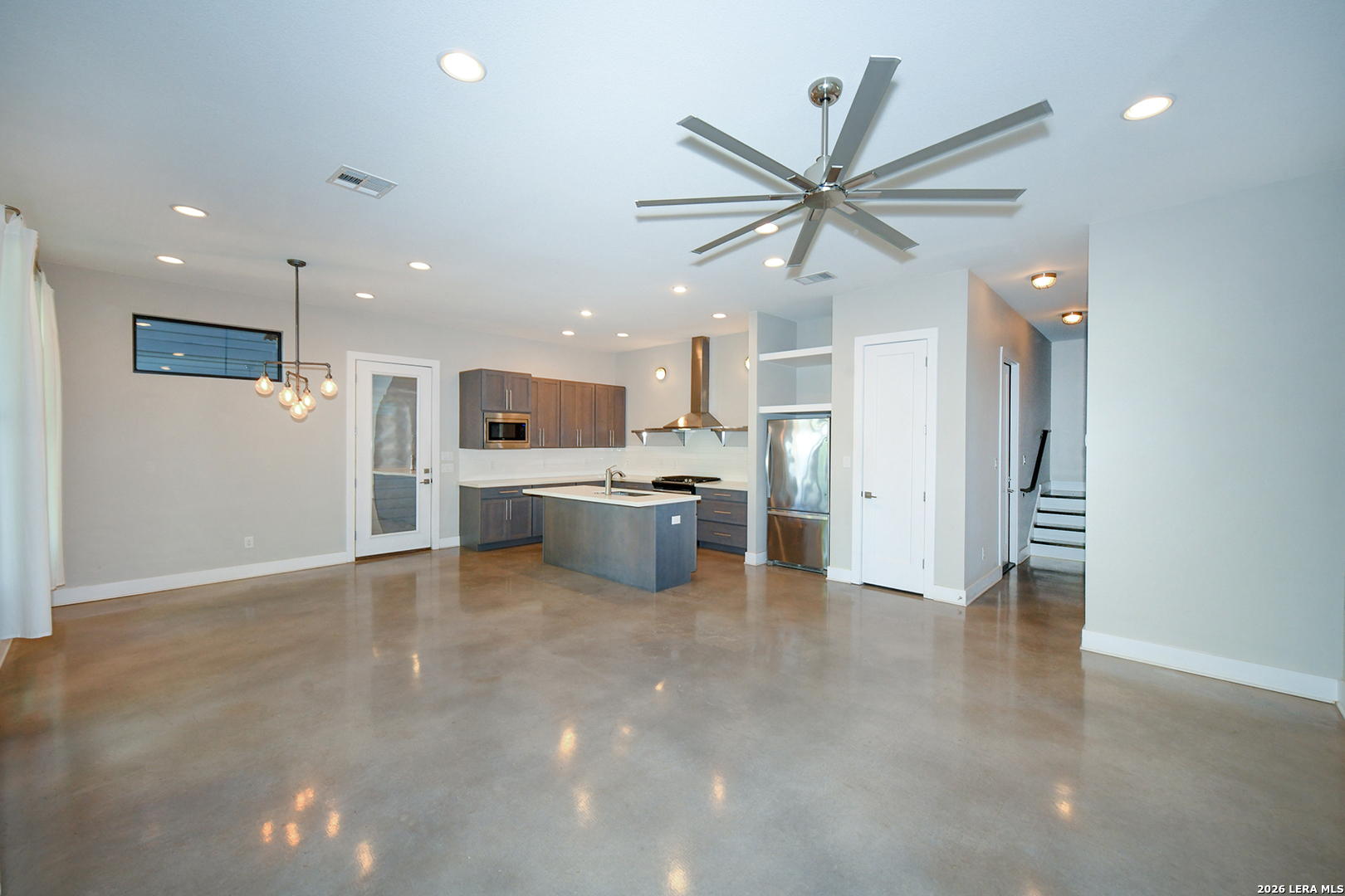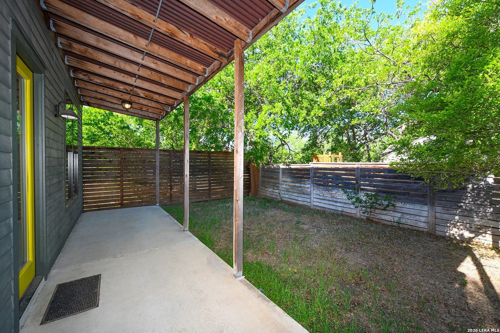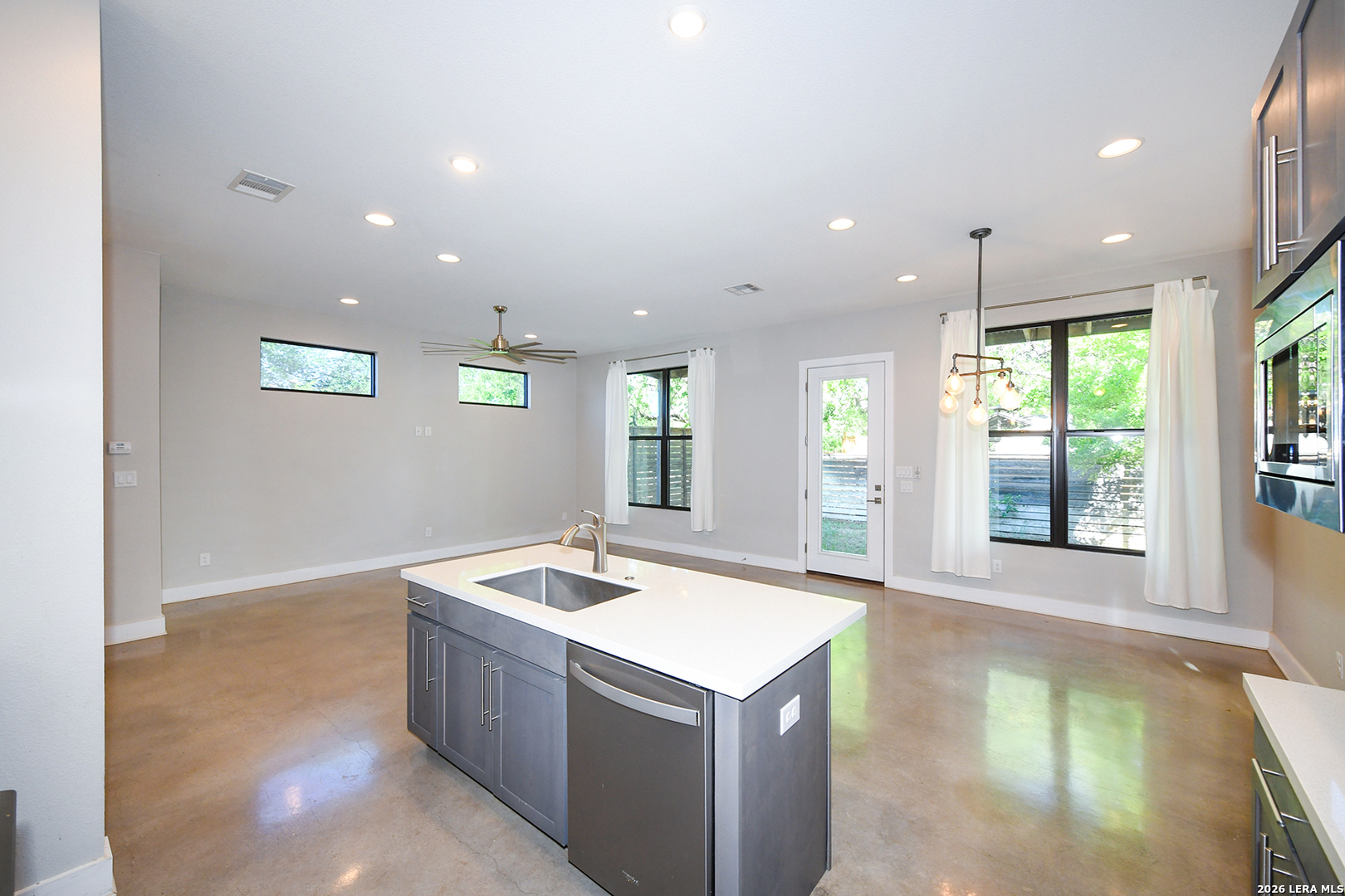 Stunning 3-bedroom, 2.5-bath home featuring a spacious open-concept design. The kitchen and living area showcase custom cabinetry, a large quartz island, concrete floors, and stainless steel appliances, including a refrigerator, perfect for both everyday living and entertaining. All bedrooms and the utility room are conveniently located upstairs. The primary suite offers a private ensuite bath and an expansive walk-in closet. Enjoy a private backyard with a covered patio, ideal for relaxing or hosting guests. Located just minutes from Blue Star Arts Complex and close to the Mission Reach, this home provides easy access to dining, entertainment, and outdoor recreation.