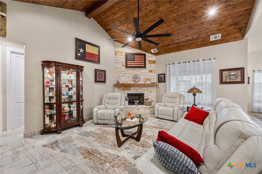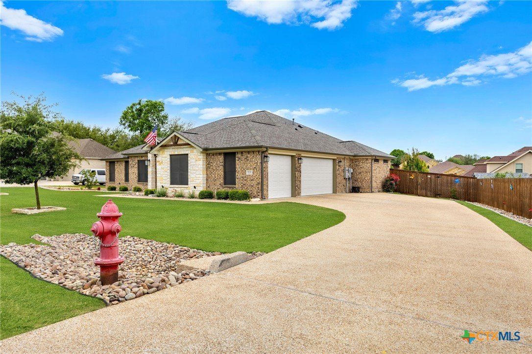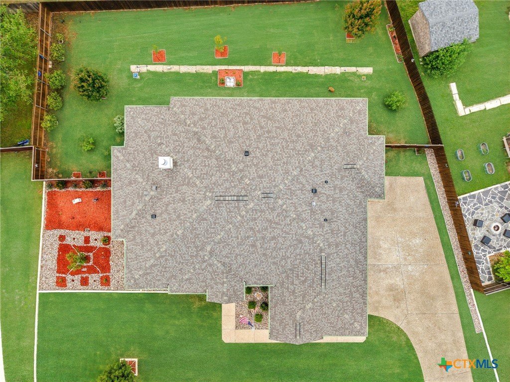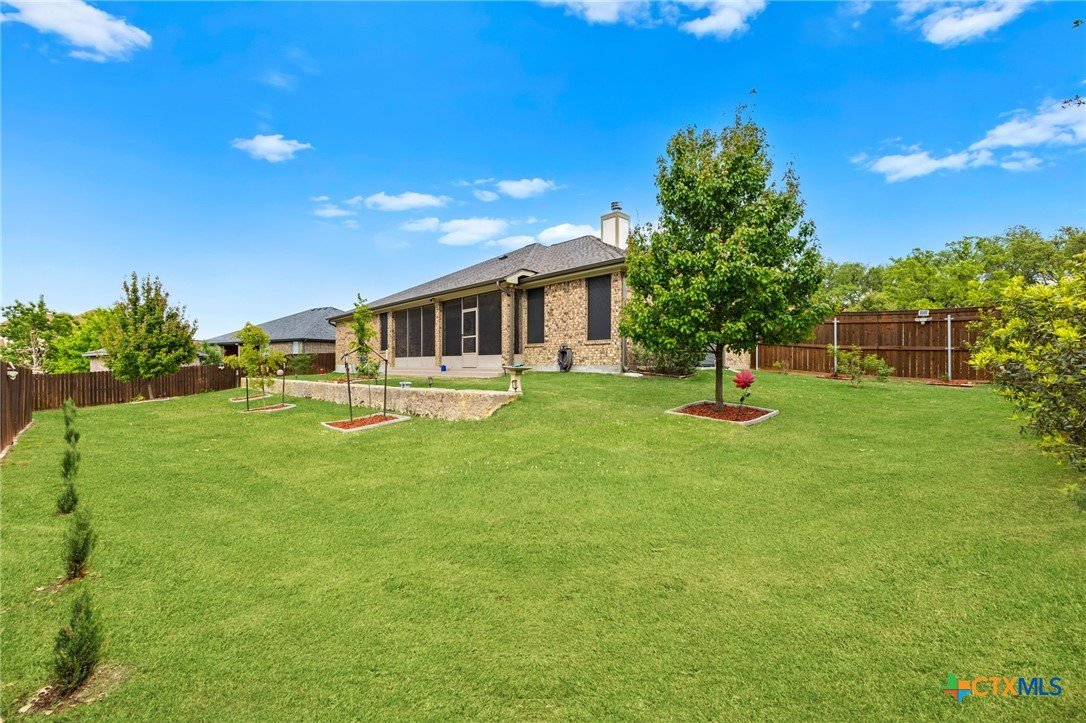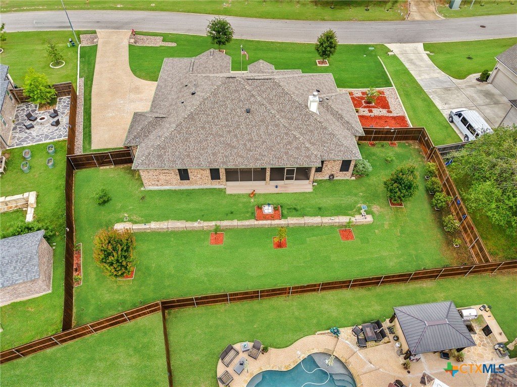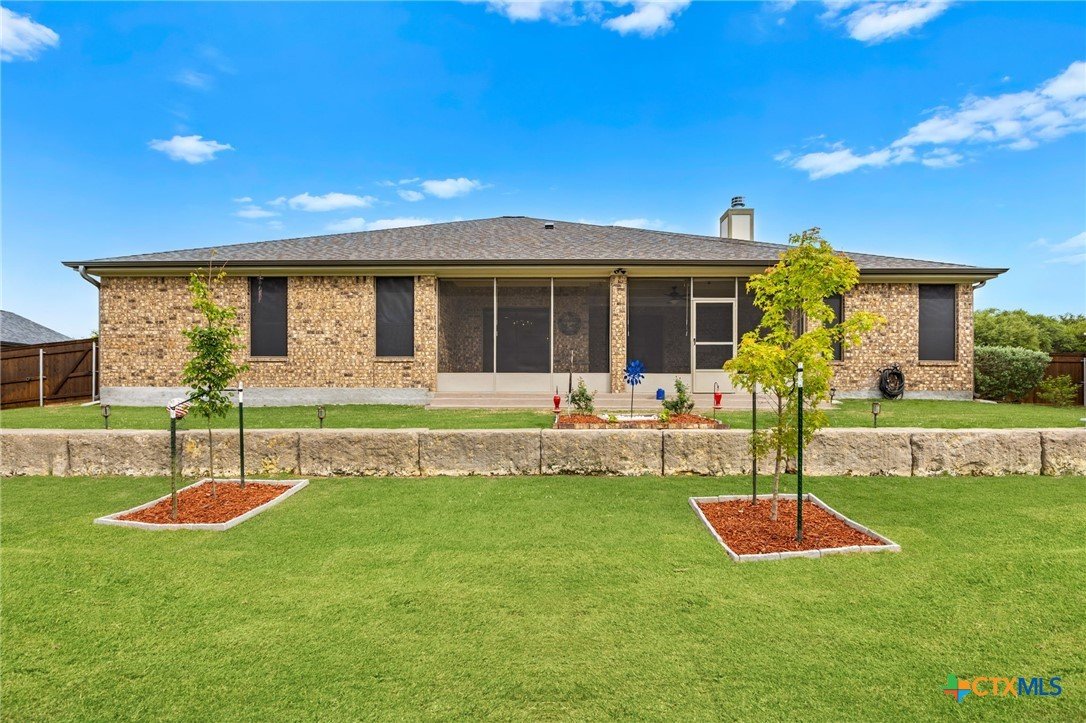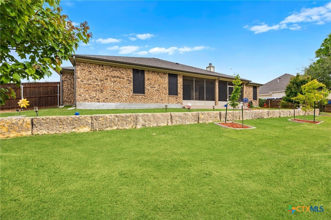 This stunning Ben Atkinson built single owner home in the highly sought after Bella Charca subdivision sits on a generous .39 acre lot and offers nearly 2,700 square feet of beautifully designed single story living. From the moment you walk in, you’re greeted by a spacious foyer with a private office to the left and a formal dining room to the right. The main living area opens into a beautiful living room featuring a corner gas fireplace and a vaulted ceiling with rich woodwork that adds warmth and character. The kitchen offers custom multi level wood cabinetry, a large island, gas cooktop, separate oven and microwave, brand new refrigerator, and a bright breakfast area perfect for everyday living or entertaining. The primary suite is tucked away and oversized at 24 x 18.7 with a sitting area, and the en suite bath features a soaker tub, double vanities, a massive walk around shower with dual entrances and a built in seat, and a spacious walk in closet. On this side you’ll also find a guest bathroom and a laundry room with a sink, folding space, and cabinetry. On the opposite side are three additional bedrooms with ceiling fans and large closets, along with a full bathroom featuring double vanities and a tiled shower. The only carpet in the home is in two bedrooms and all closets. Step outside into a 27 x 16 screened porch overlooking a beautifully landscaped yard with 2 live oaks in the front and 3 maple trees, 2 frontier elms, and 2 purple flowering trees in the backyard, creating a peaceful and private setting. Additional upgrades include a KitchenAid dishwasher, solar screens, a wood front door with speakeasy detail, full gutters, and a Generac 24KW whole home generator. The oversized side entry three car garage measures 24.2 x 32.7 and offers plenty of space for vehicles, storage, or a workshop. This home offers space, upgrades, and character in one of the area’s most desirable communities.