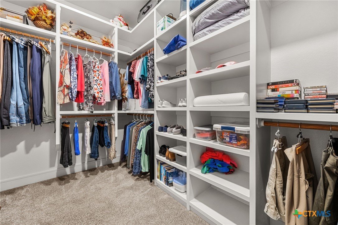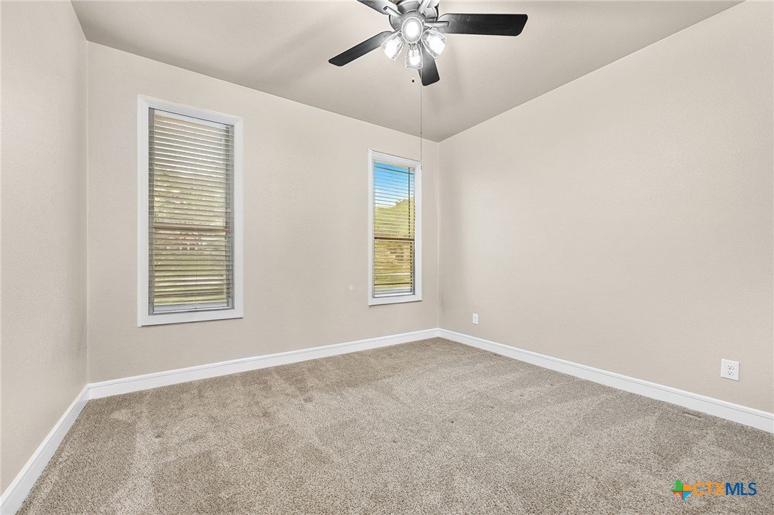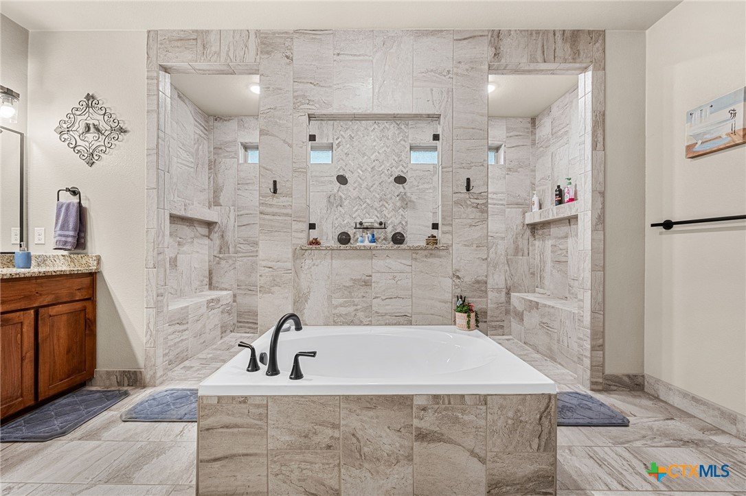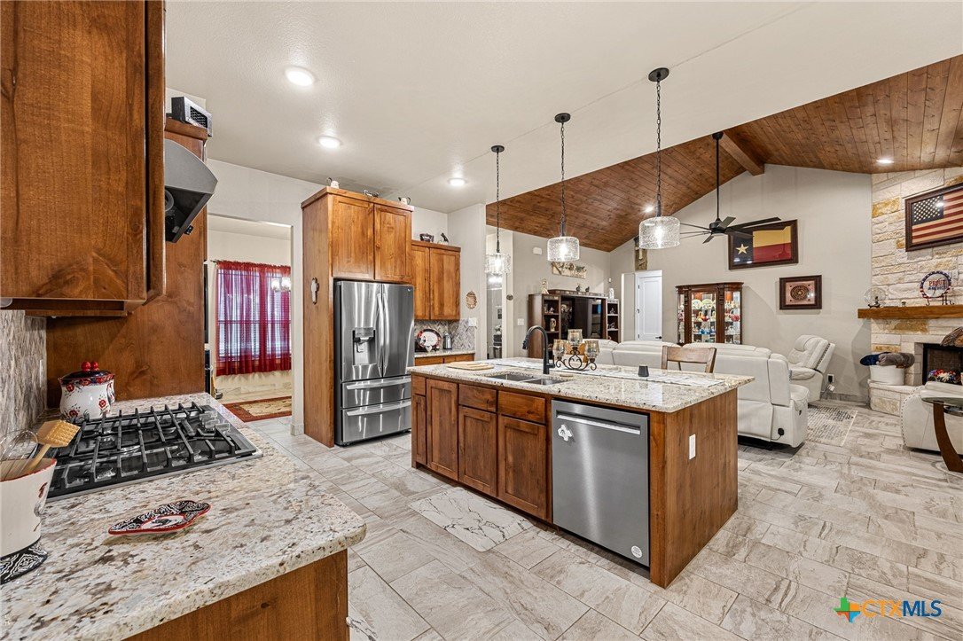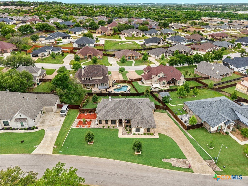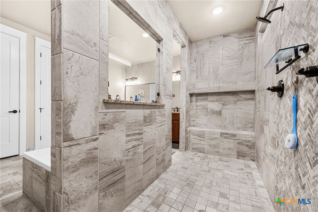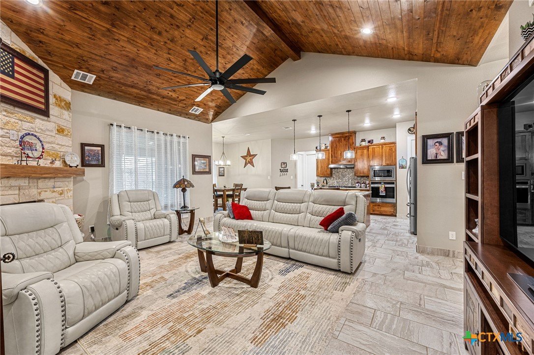 This stunning Ben Atkinson built single owner home in the highly sought after Bella Charca subdivision sits on a generous .39 acre lot and offers nearly 2,700 square feet of beautifully designed single story living. From the moment you walk in, you’re greeted by a spacious foyer with a private office to the left and a formal dining room to the right. The main living area opens into a beautiful living room featuring a corner gas fireplace and a vaulted ceiling with rich woodwork that adds warmth and character. The kitchen offers custom multi level wood cabinetry, a large island, gas cooktop, separate oven and microwave, brand new refrigerator, and a bright breakfast area perfect for everyday living or entertaining. The primary suite is tucked away and oversized at 24 x 18.7 with a sitting area, and the en suite bath features a soaker tub, double vanities, a massive walk around shower with dual entrances and a built in seat, and a spacious walk in closet. On this side you’ll also find a guest bathroom and a laundry room with a sink, folding space, and cabinetry. On the opposite side are three additional bedrooms with ceiling fans and large closets, along with a full bathroom featuring double vanities and a tiled shower. The only carpet in the home is in two bedrooms and all closets. Step outside into a 27 x 16 screened porch overlooking a beautifully landscaped yard with 2 live oaks in the front and 3 maple trees, 2 frontier elms, and 2 purple flowering trees in the backyard, creating a peaceful and private setting. Additional upgrades include a KitchenAid dishwasher, solar screens, a wood front door with speakeasy detail, full gutters, and a Generac 24KW whole home generator. The oversized side entry three car garage measures 24.2 x 32.7 and offers plenty of space for vehicles, storage, or a workshop. This home offers space, upgrades, and character in one of the area’s most desirable communities.