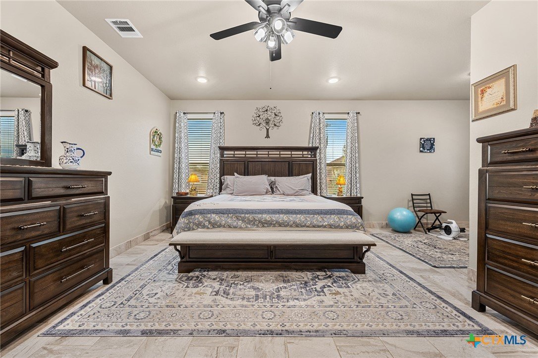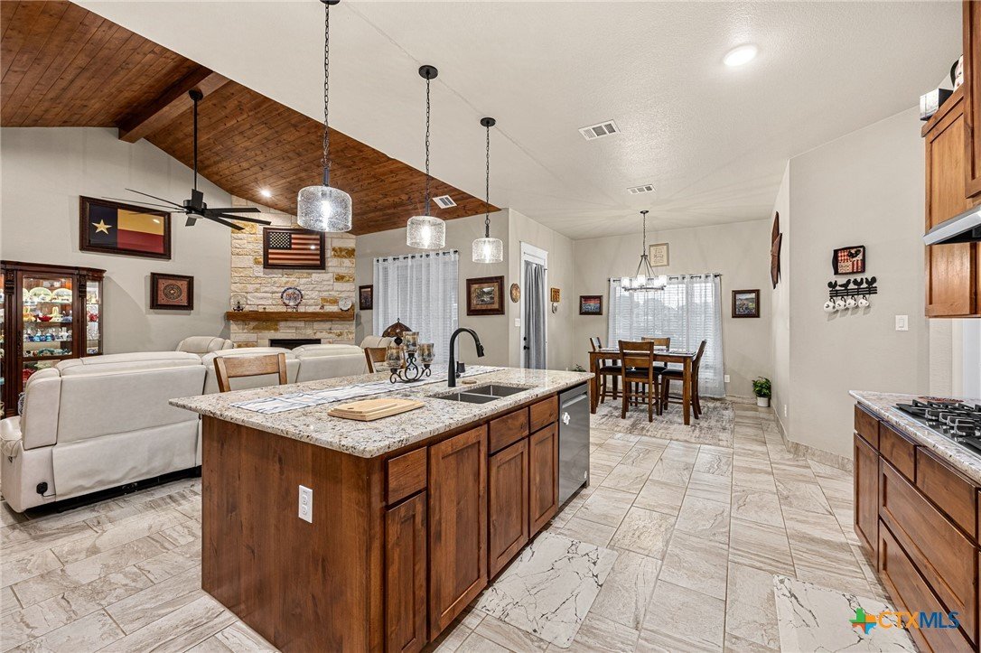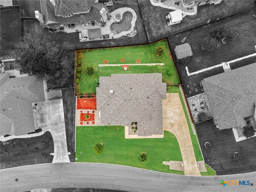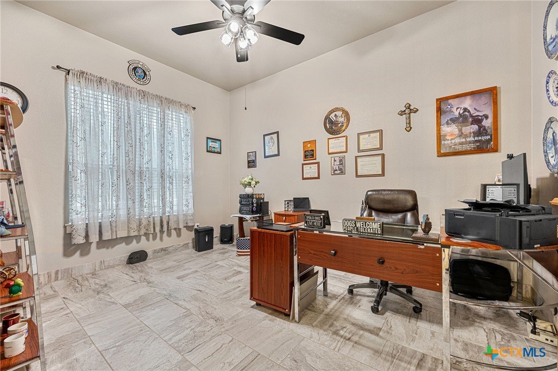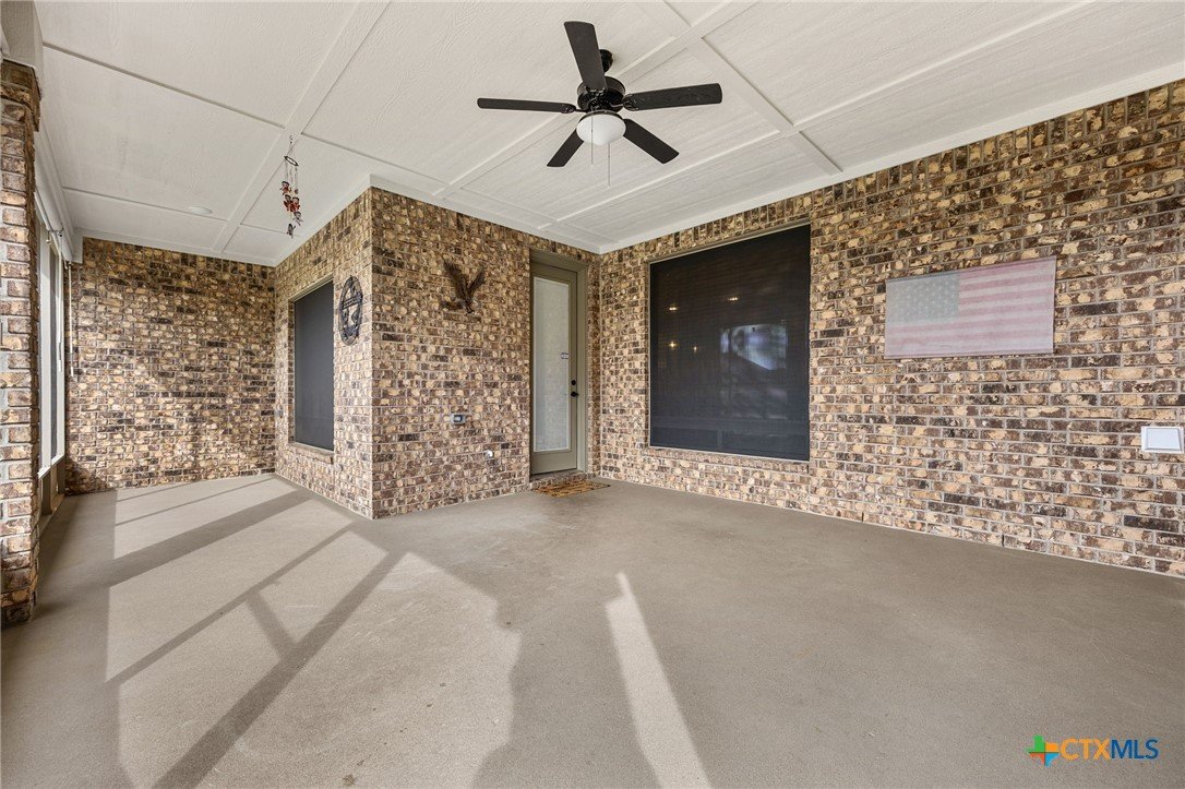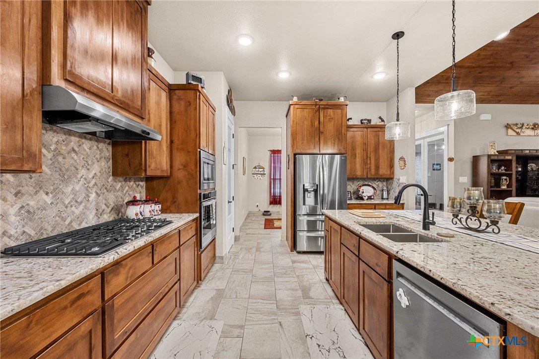 This stunning Ben Atkinson built single owner home in the highly sought after Bella Charca subdivision sits on a generous .39 acre lot and offers nearly 2,700 square feet of beautifully designed single story living. From the moment you walk in, you’re greeted by a spacious foyer with a private office to the left and a formal dining room to the right. The main living area opens into a beautiful living room featuring a corner gas fireplace and a vaulted ceiling with rich woodwork that adds warmth and character. The kitchen offers custom multi level wood cabinetry, a large island, gas cooktop, separate oven and microwave, brand new refrigerator, and a bright breakfast area perfect for everyday living or entertaining. The primary suite is tucked away and oversized at 24 x 18.7 with a sitting area, and the en suite bath features a soaker tub, double vanities, a massive walk around shower with dual entrances and a built in seat, and a spacious walk in closet. On this side you’ll also find a guest bathroom and a laundry room with a sink, folding space, and cabinetry. On the opposite side are three additional bedrooms with ceiling fans and large closets, along with a full bathroom featuring double vanities and a tiled shower. The only carpet in the home is in two bedrooms and all closets. Step outside into a 27 x 16 screened porch overlooking a beautifully landscaped yard with 2 live oaks in the front and 3 maple trees, 2 frontier elms, and 2 purple flowering trees in the backyard, creating a peaceful and private setting. Additional upgrades include a KitchenAid dishwasher, solar screens, a wood front door with speakeasy detail, full gutters, and a Generac 24KW whole home generator. The oversized side entry three car garage measures 24.2 x 32.7 and offers plenty of space for vehicles, storage, or a workshop. This home offers space, upgrades, and character in one of the area’s most desirable communities.