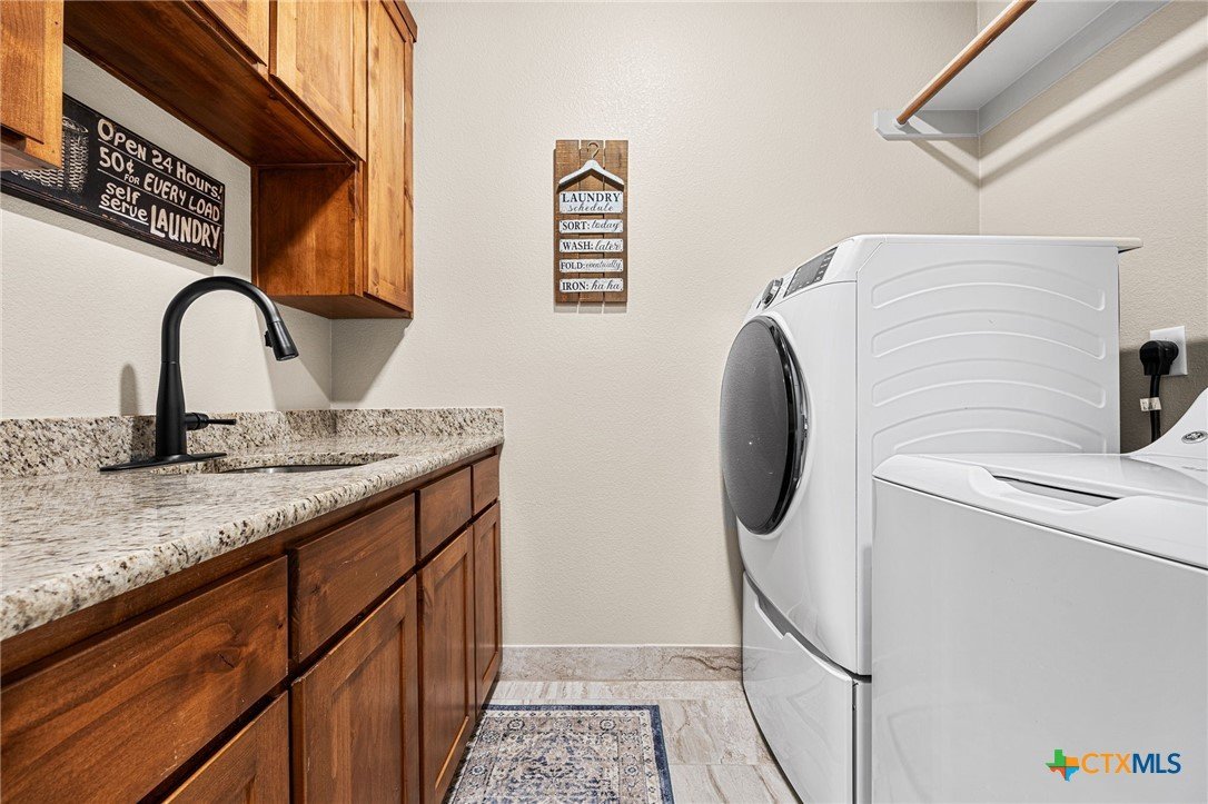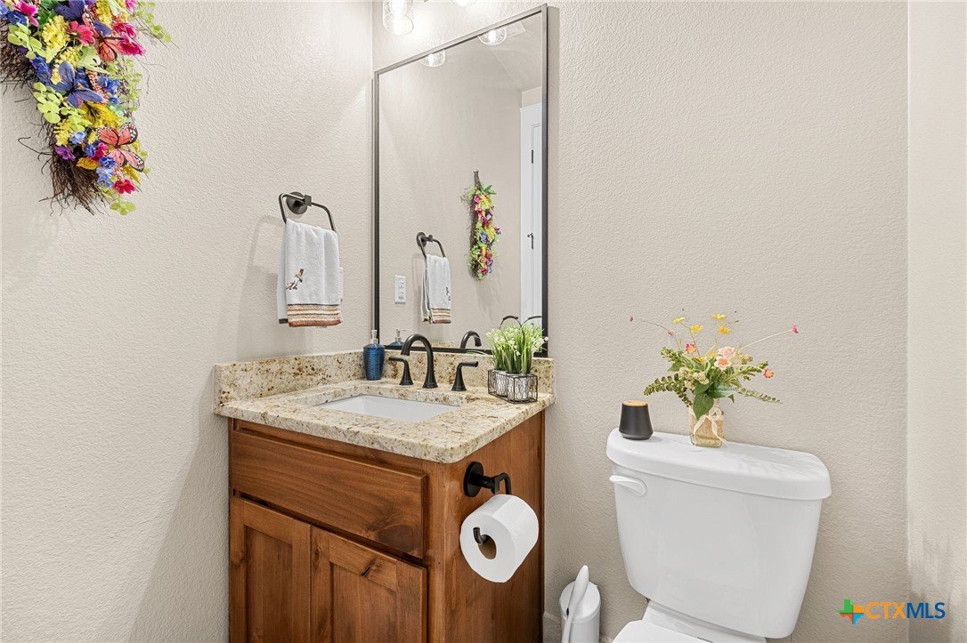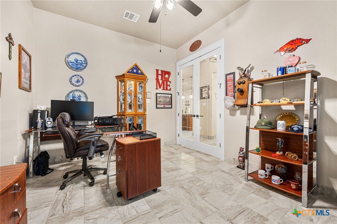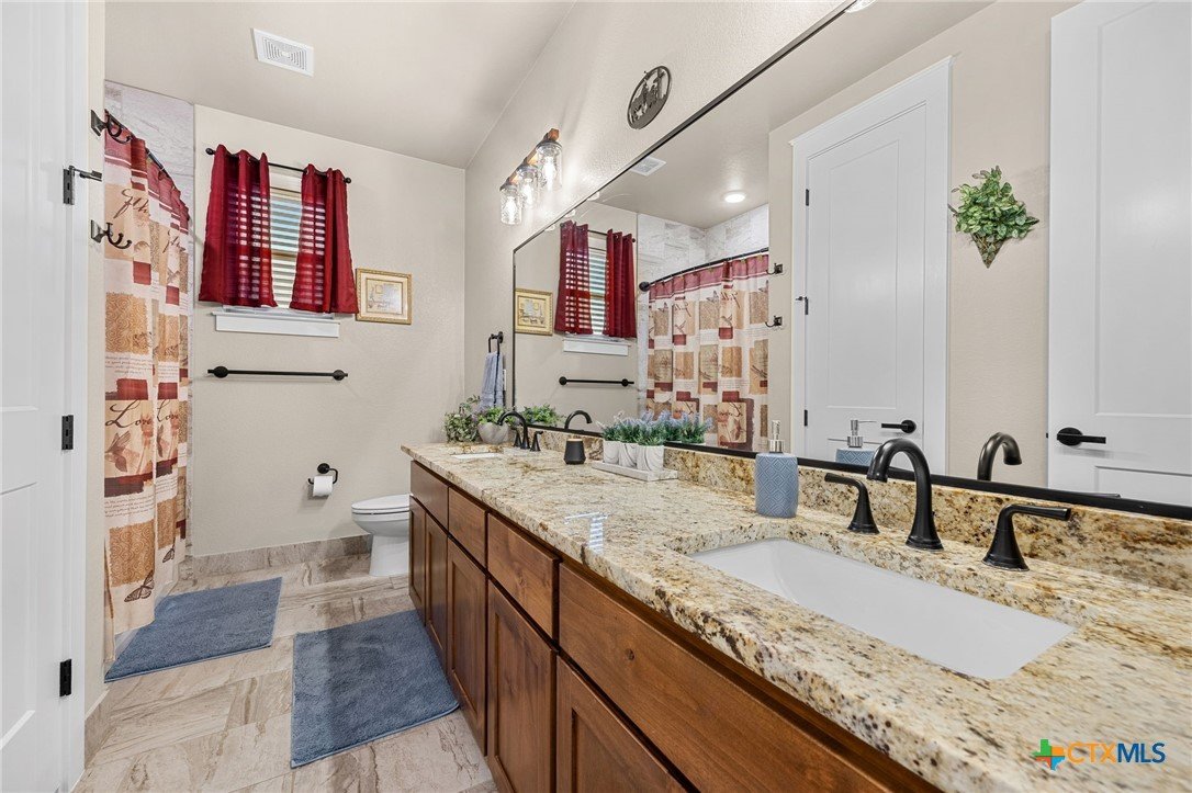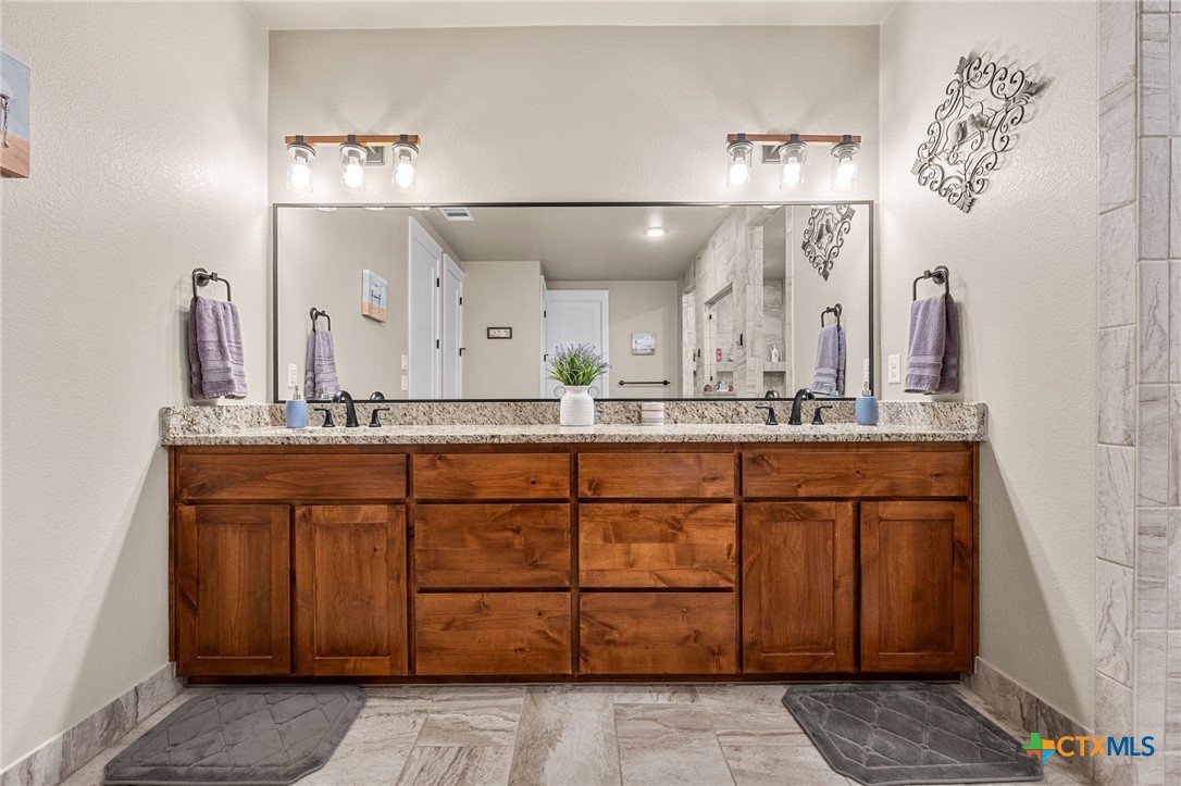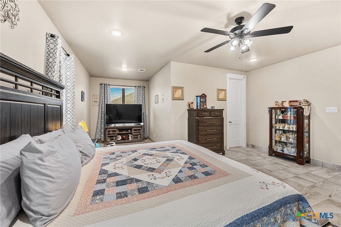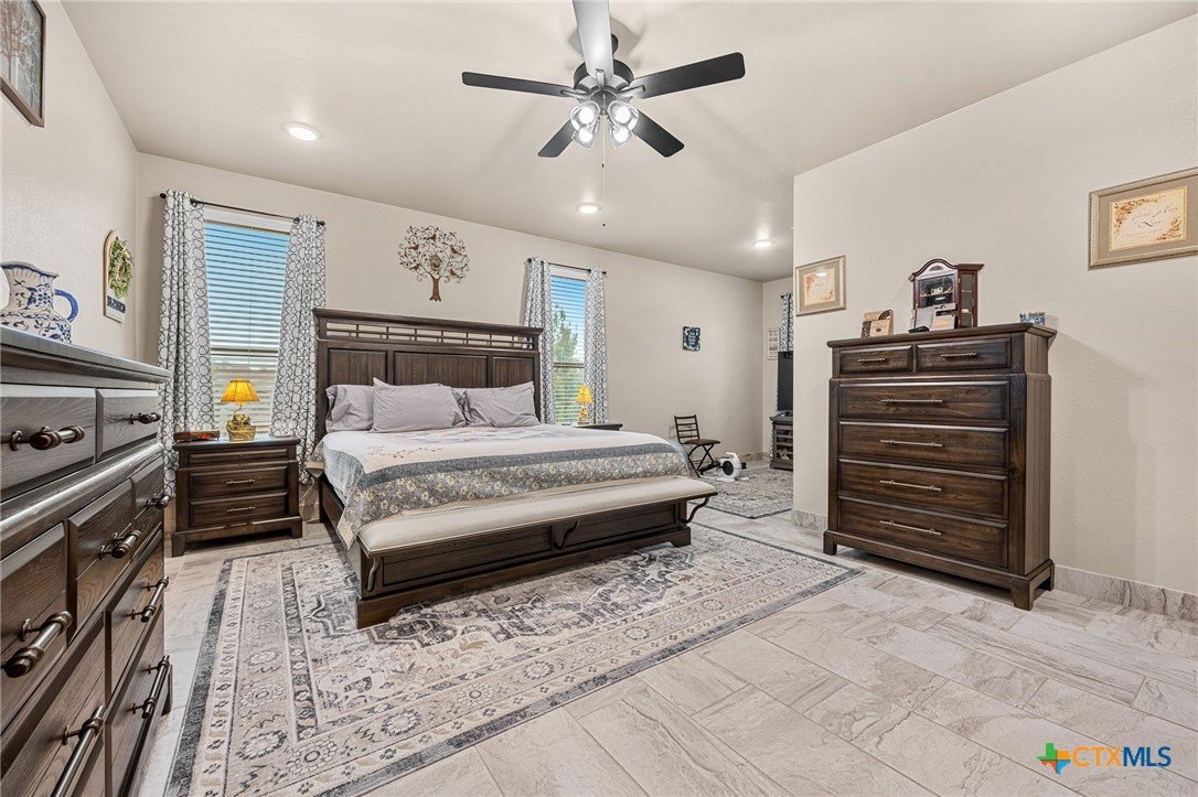 This stunning Ben Atkinson built single owner home in the highly sought after Bella Charca subdivision sits on a generous .39 acre lot and offers nearly 2,700 square feet of beautifully designed single story living. From the moment you walk in, you’re greeted by a spacious foyer with a private office to the left and a formal dining room to the right. The main living area opens into a beautiful living room featuring a corner gas fireplace and a vaulted ceiling with rich woodwork that adds warmth and character. The kitchen offers custom multi level wood cabinetry, a large island, gas cooktop, separate oven and microwave, brand new refrigerator, and a bright breakfast area perfect for everyday living or entertaining. The primary suite is tucked away and oversized at 24 x 18.7 with a sitting area, and the en suite bath features a soaker tub, double vanities, a massive walk around shower with dual entrances and a built in seat, and a spacious walk in closet. On this side you’ll also find a guest bathroom and a laundry room with a sink, folding space, and cabinetry. On the opposite side are three additional bedrooms with ceiling fans and large closets, along with a full bathroom featuring double vanities and a tiled shower. The only carpet in the home is in two bedrooms and all closets. Step outside into a 27 x 16 screened porch overlooking a beautifully landscaped yard with 2 live oaks in the front and 3 maple trees, 2 frontier elms, and 2 purple flowering trees in the backyard, creating a peaceful and private setting. Additional upgrades include a KitchenAid dishwasher, solar screens, a wood front door with speakeasy detail, full gutters, and a Generac 24KW whole home generator. The oversized side entry three car garage measures 24.2 x 32.7 and offers plenty of space for vehicles, storage, or a workshop. This home offers space, upgrades, and character in one of the area’s most desirable communities.