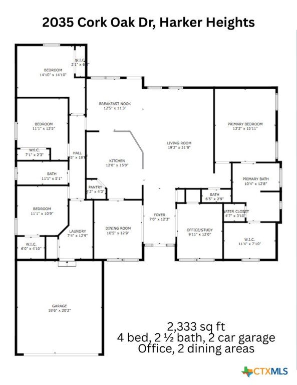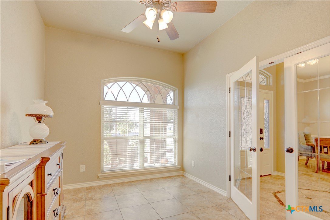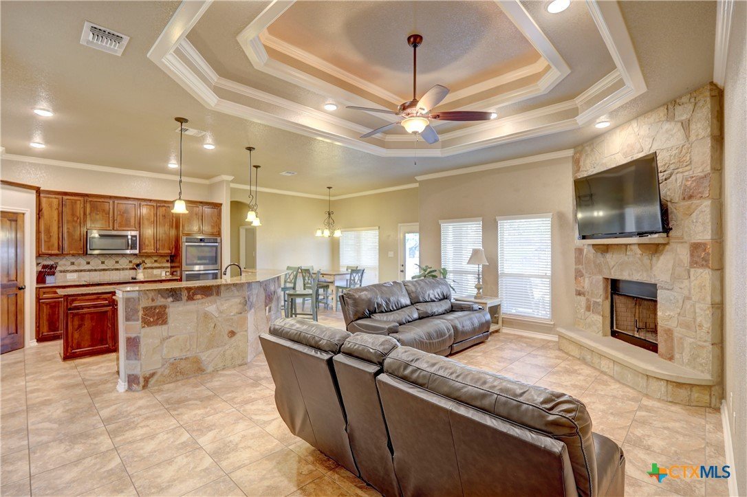 Welcome home to this beautifully maintained residence where thoughtful design meets comfortable living. Step through the elegant entryway into an open-concept layout featuring a spacious living room with a stone fireplace, tray ceilings, and natural light that flows seamlessly into the kitchen and breakfast nook. The kitchen is the heart of the home, offering granite countertops, custom cabinetry, a breakfast bar, and a cozy dining nook perfect for morning coffee or weeknight dinners. A formal dining room adds versatility for hosting gatherings or holiday meals. The private primary suite is a relaxing retreat with a spa-inspired bath showcasing a jetted tub, separate shower, and dual vanities. The oversized walk-in closet includes a convenient third-row hanging system—perfect for seasonal wardrobe rotation and extra storage. Three additional bedrooms and a dedicated office provide flexible space for work, guests, or hobbies. Step outside to the extended covered patio designed for entertaining, complete with ceiling fans, string lights, and a built-in outdoor kitchen. The backyard features an extra-tall privacy fence, creating the ideal setting for relaxation, play, or quiet evenings under the Texas sky. Additional highlights include a large laundry room with sink and cabinetry, ample storage throughout, and a full brick exterior for timeless appeal. Conveniently located near top-rated schools, shopping, and dining, this Harker Heights gem offers comfort, space, and style—all ready to welcome you home.