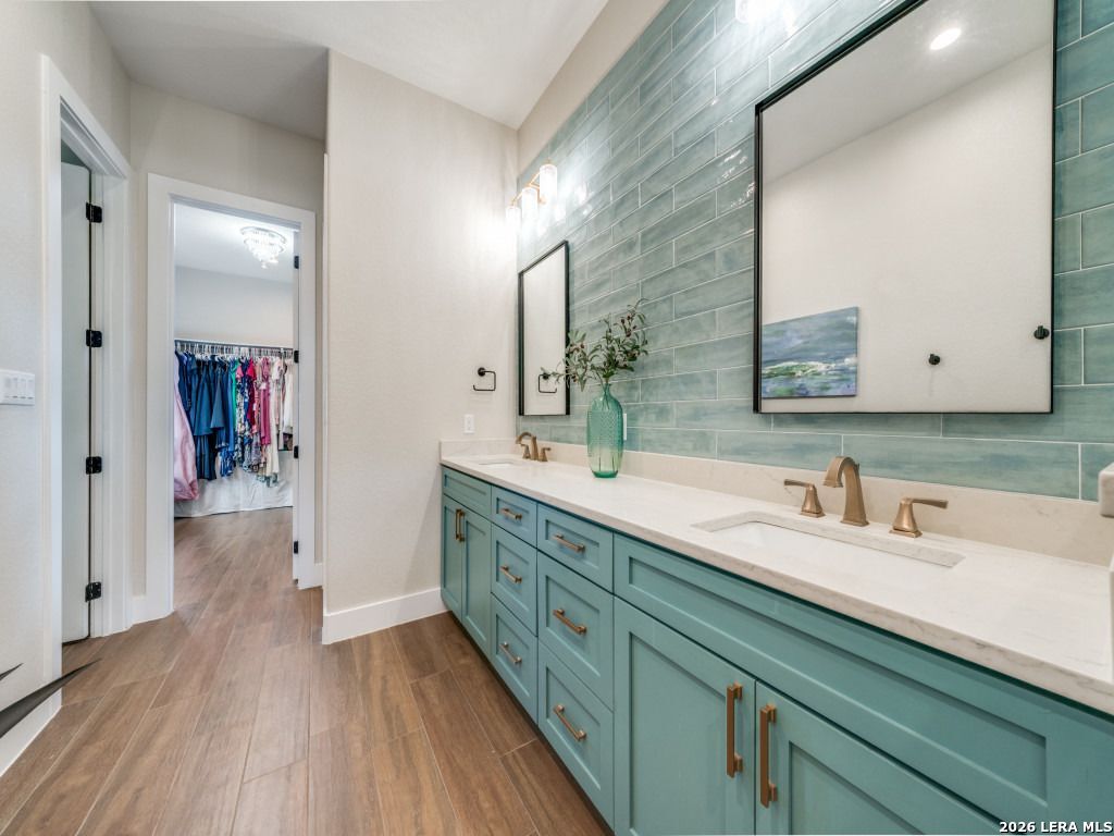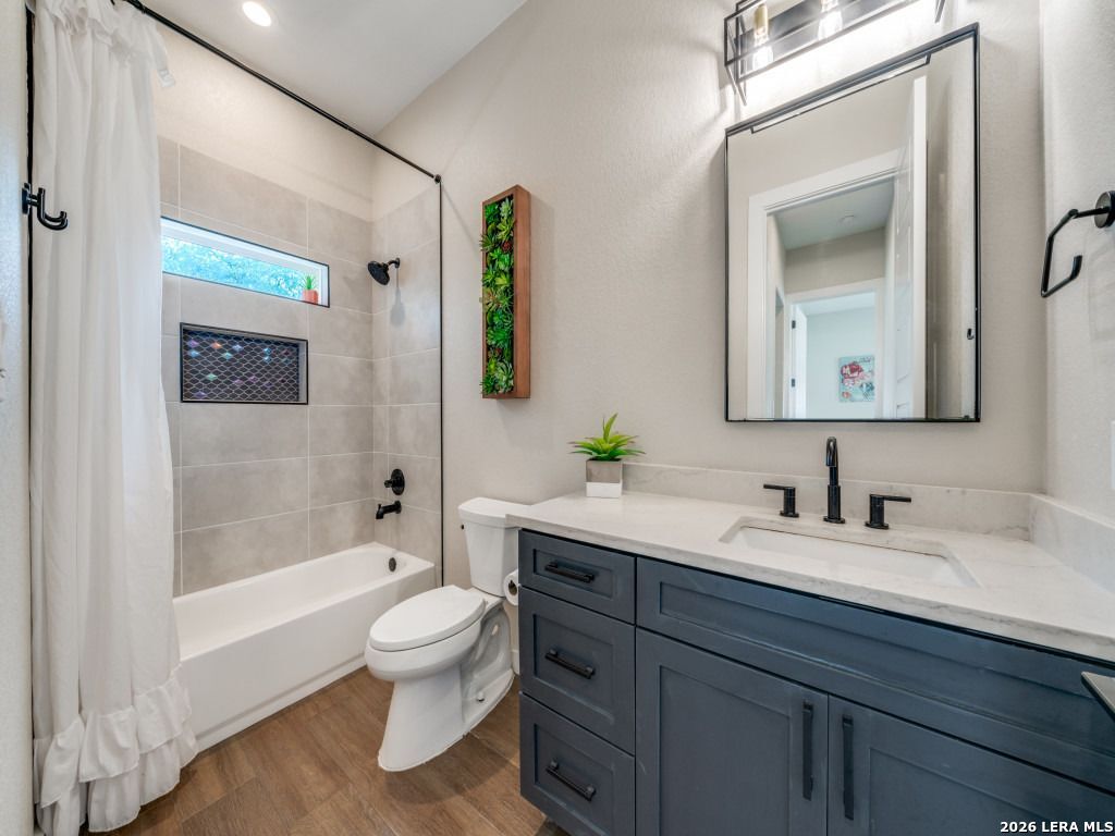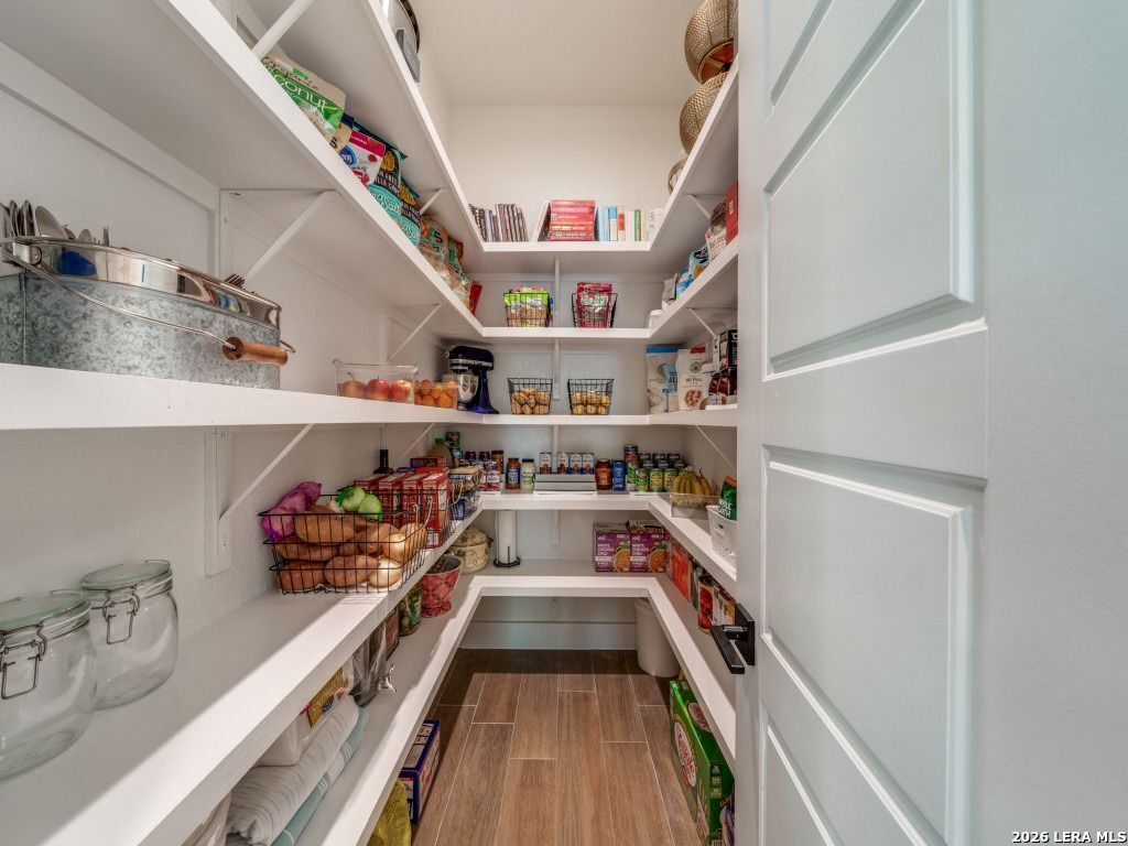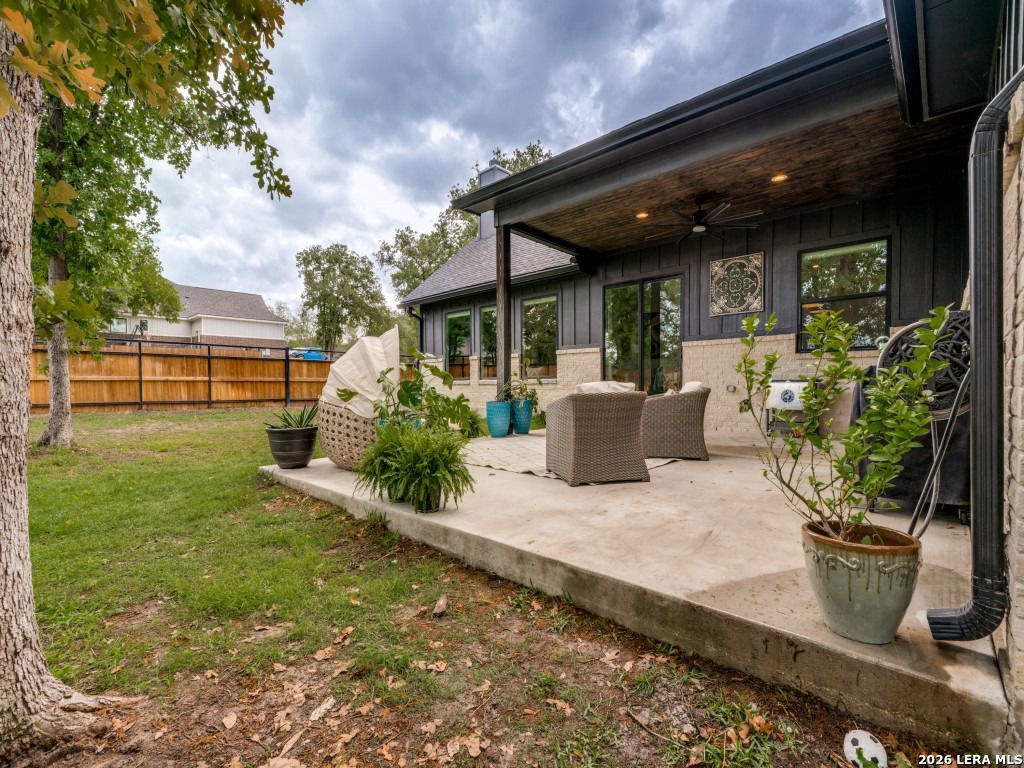 Step into your dream home in the gated community of Woodbridge Farms, where neighborhood amenities include, a splash pad, two playgrounds, a basketball court, event pavilion and sidewalks throughout -all within La Vernia ISD. This custom-built, one-story home offers a thoughtfully designed split floor plan perfect for both entertaining and everyday living. Luxury tile flooring flows seamlessly throughout the entire home, leading you into a spacious living area highlighted by vaulted ceilings, a striking accent wall, and a stunning floor-to-ceiling fireplace that serves as the heart of the home. The open-concept kitchen is designed to impress, featuring stainless steel appliances, a large modern sink, hand-selected tile, an oversized island perfect for gathering, and an expansive walk-in pantry with abundant storage for food and appliances. The private owner's suite is a true retreat, complete with a massive walk-in closet and a spa-like en-suite bathroom showcasing custom tile work, double vanities, and a large walk-in shower. Two additional generously sized bedrooms each include their own walk-in closets, while an office with a closet offers flexibility as a fourth bedroom. Additional highlights include a spacious laundry room and a two-car garage with an insulated door and epoxy flooring-perfect for your organizational and storage needs. Energy-efficient spray foam insulation enhances comfort while helping reduce utility costs year-round. This home is loaded with upgrades, including automated blinds throughout, a whole-home water softener and charcoal filter, a reverse osmosis system in the kitchen. The backyard is thoughtfully designed with a newly seeded lawn, and dividing fence-ideal for gardening, projects, or pets. Finally, step outside to your private outdoor retreat featuring front and back sprinkler systems and an extended covered patio, perfect for entertaining or simply unwinding. Don't miss your chance to own this stunning move-in-ready property. Schedule a private tour today and see it for yourself!