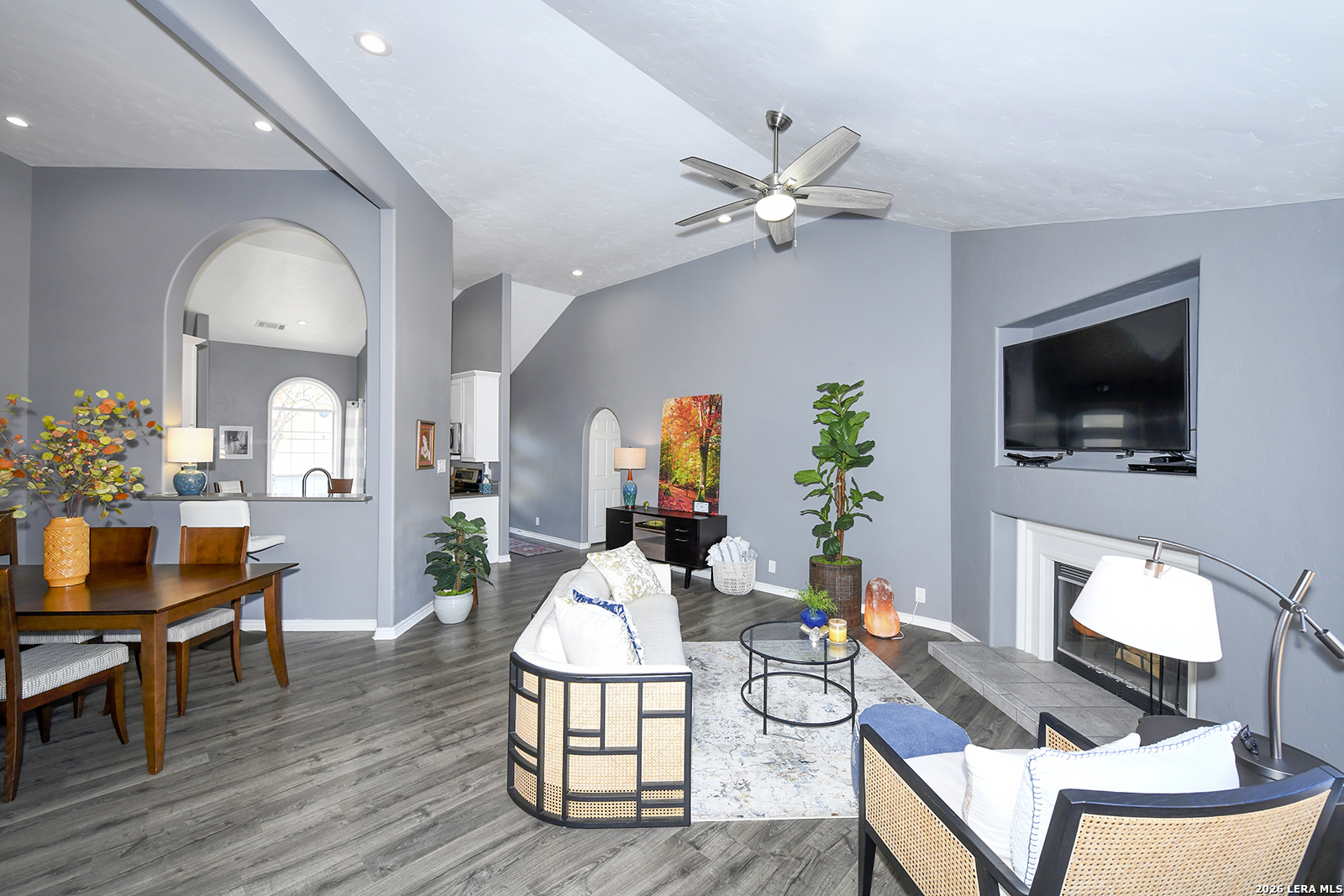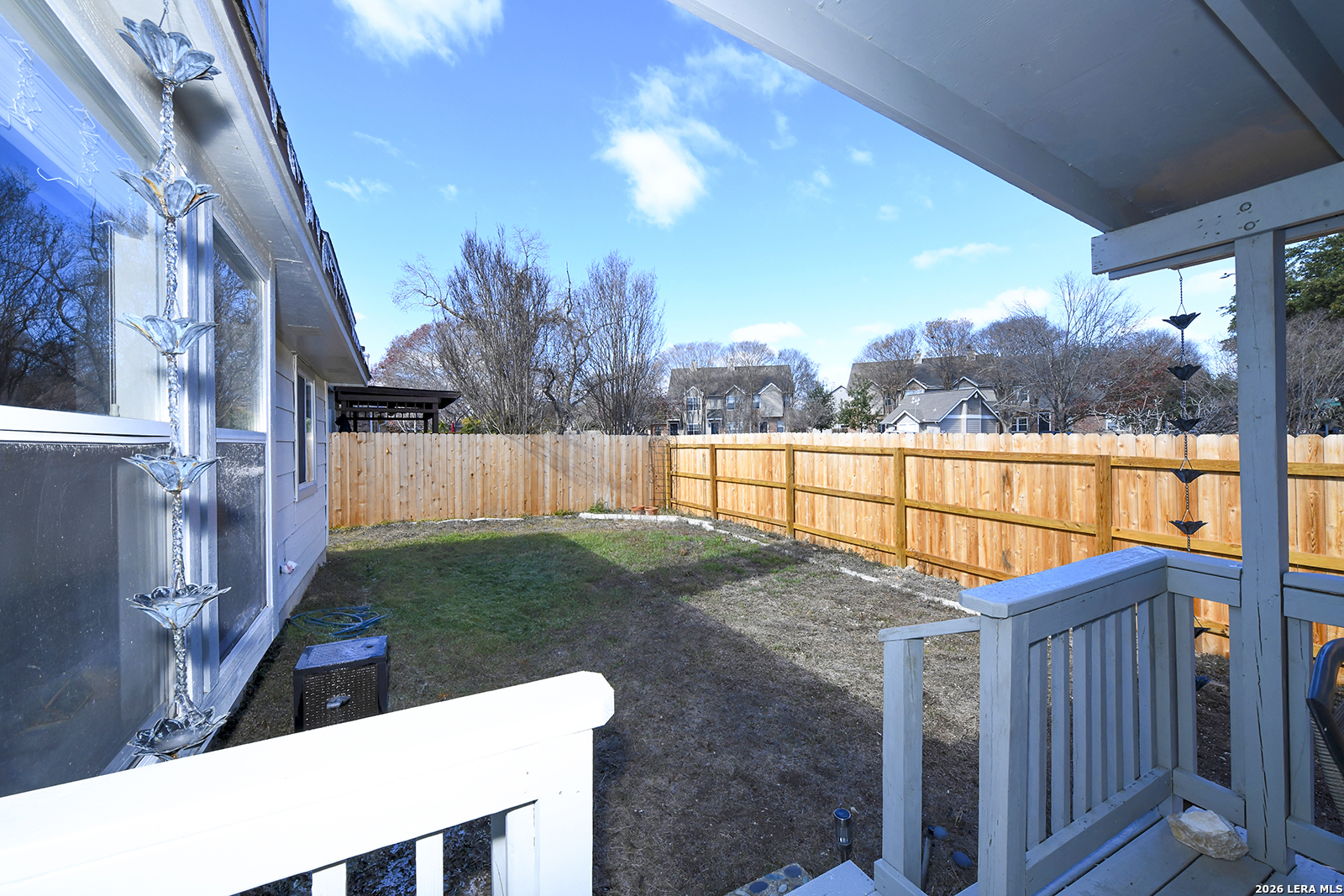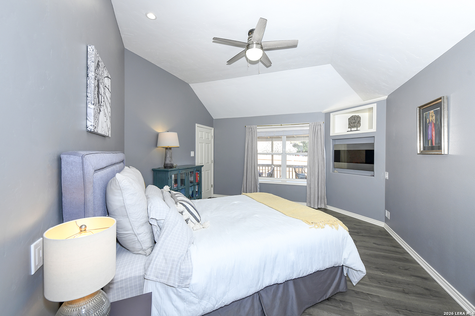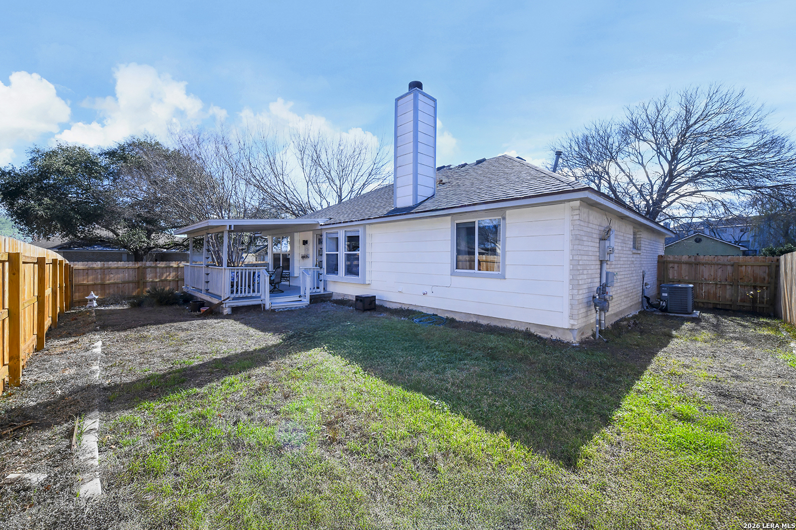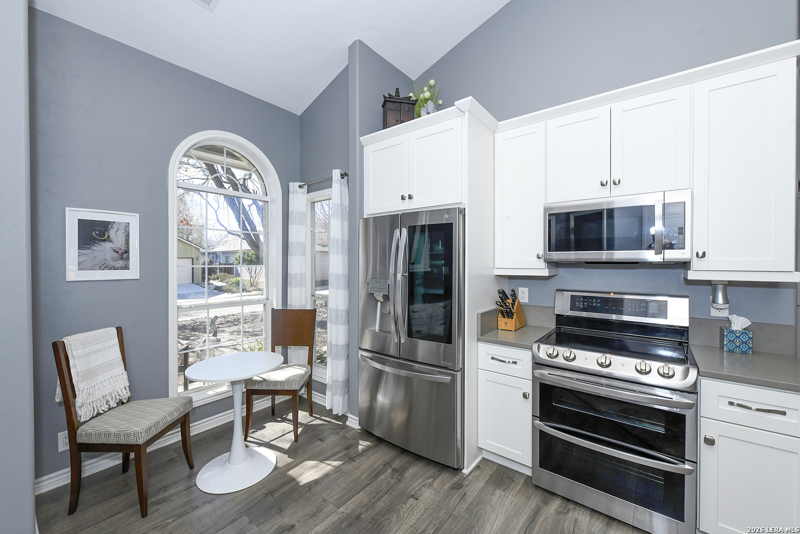 Come home to this beautifully updated 2-owner brick home in highly desirable and gated Parkside Estates. Fantastic location near Wurzbach Pkwy, Hwy 281, the airport, library, and HEB! Situated on a corner lot with mature trees and a maintained green space behind. This beauty underwent a complete interior renovation (2020-21), including replacing all the old plumbing with PEX. It features 13' vaulted ceilings, updated LED lighting and Pergo laminate flooring throughout, Daltile ceramic tile flooring in bathrooms and a custom wood-burning fireplace. The kitchen offers Malibu White shaker cabinetry (soft-close), quartz countertops & backsplash, LED cabinet lighting, Kraus undermount sink, Kohler pull-down faucet, and stainless steel appliances (2020). Primary suite includes electric fireplace, spa-style bathroom with custom glass walk-in shower, dual undermount sinks, quartz countertops, garden window, and a walk-in closet with custom built-ins. All this plus more major upgrades such as a newer roof (2021), Rheem high-efficiency water heater (2021), a professionally maintained water softener, custom exterior doors, and double garage door (2025). Plus a finished 2-car garage with mud sink and storage. Covered 19'x11' porch, xeriscaped yard, and shed and much. much, more! For the right offer, Refrigerator and washer and dryer will be included! Hurry! This one won't last!