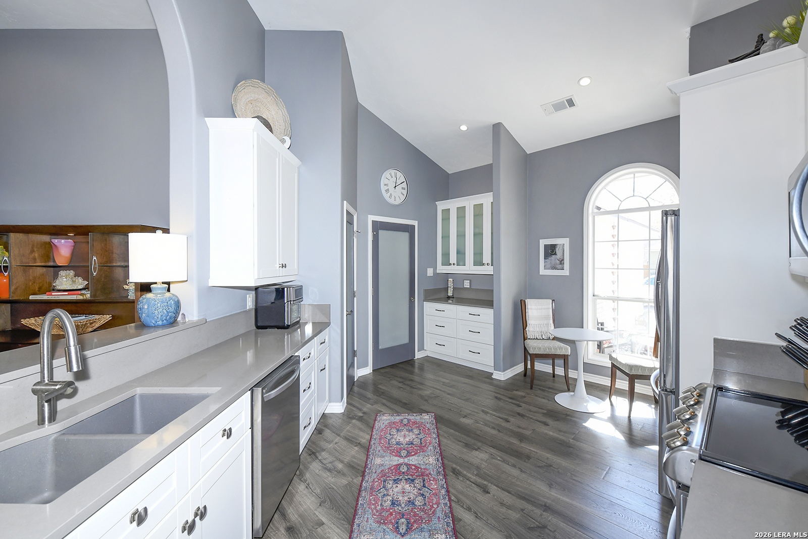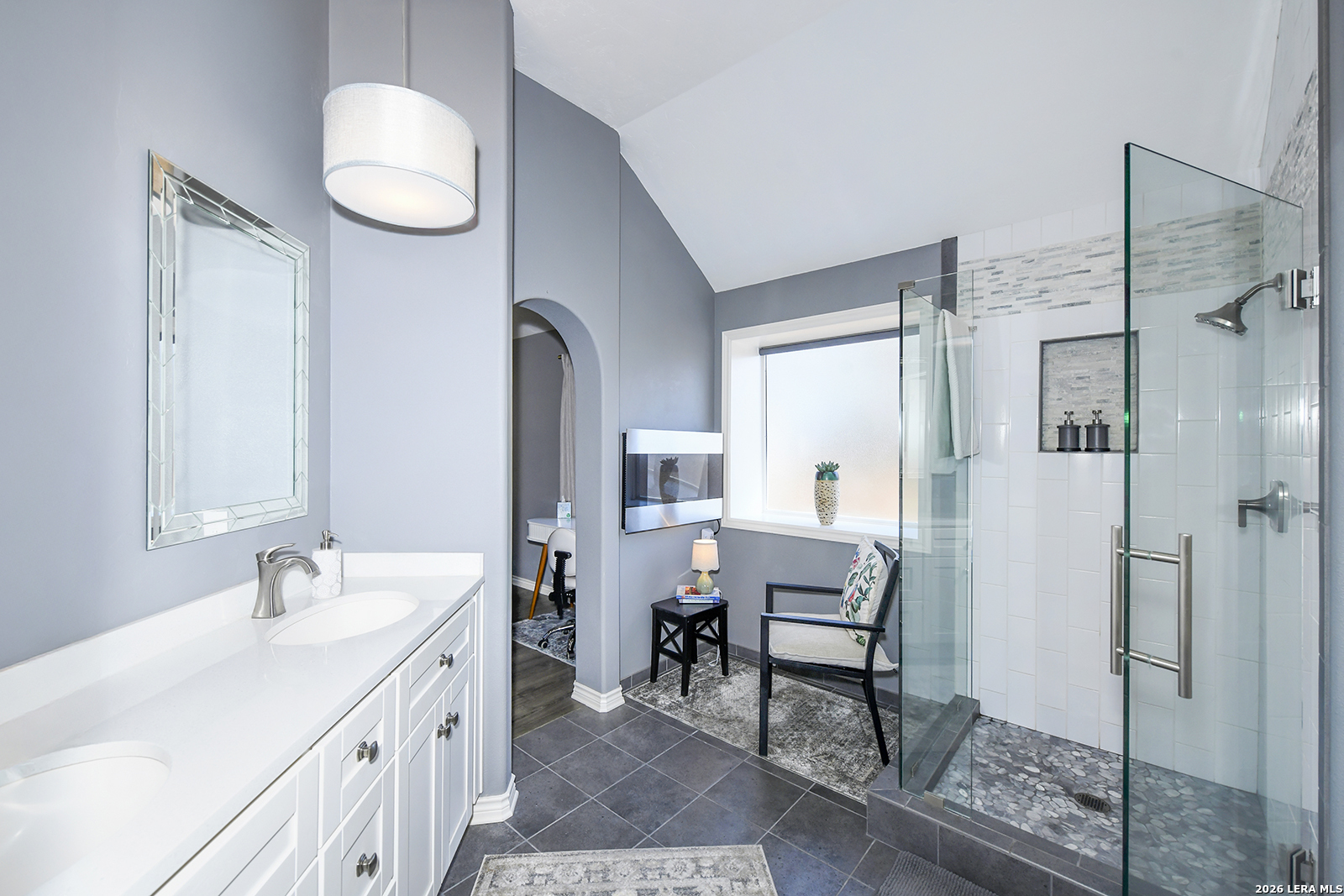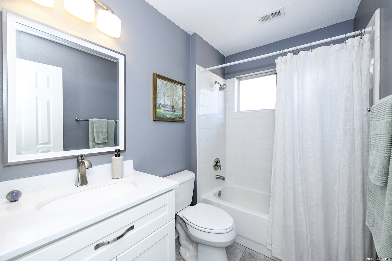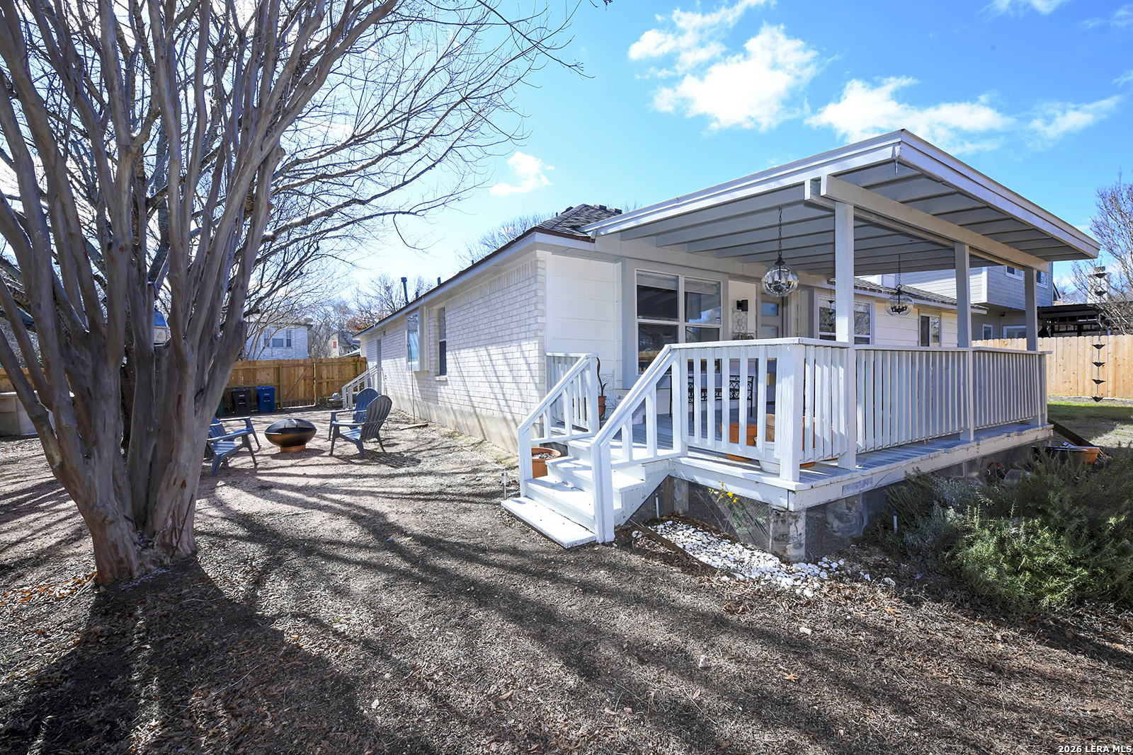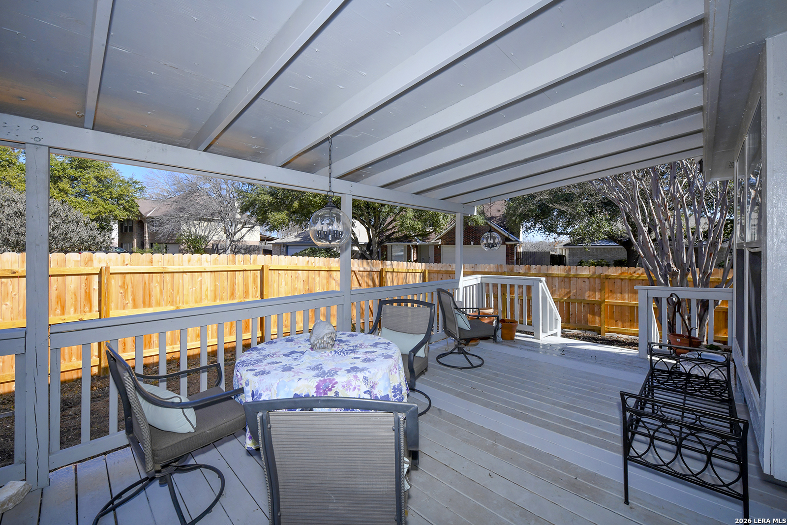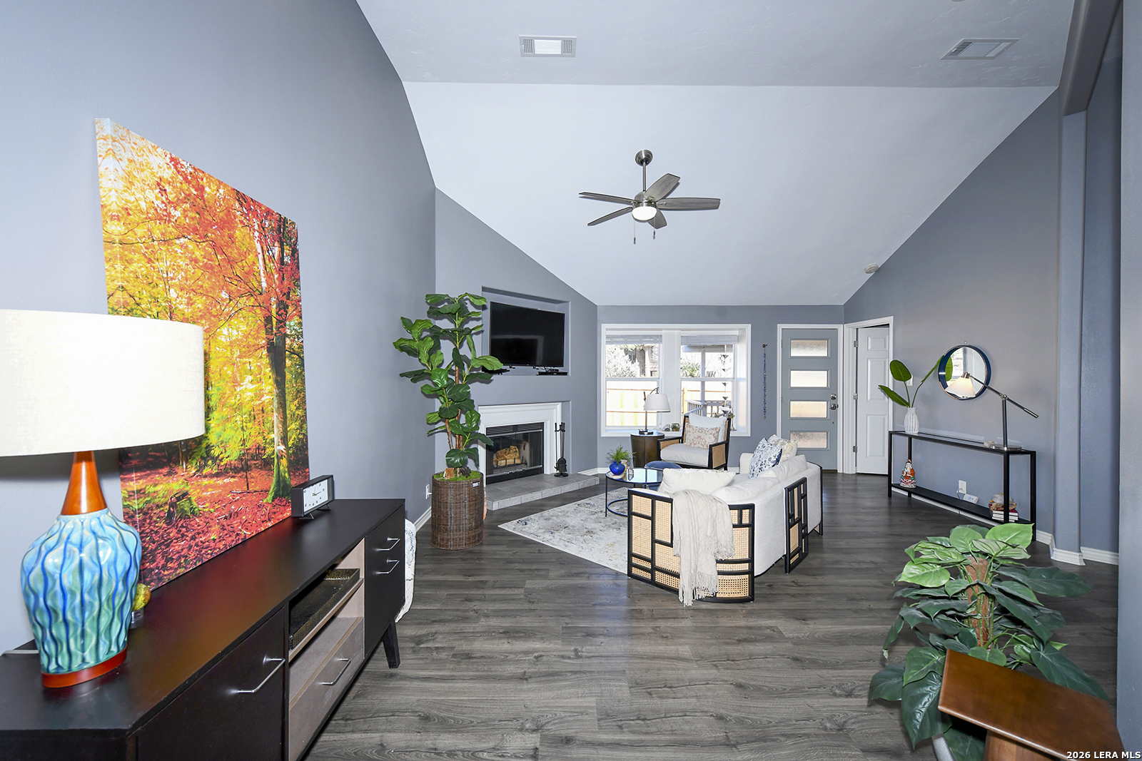 Come home to this beautifully updated 2-owner brick home in highly desirable and gated Parkside Estates. Fantastic location near Wurzbach Pkwy, Hwy 281, the airport, library, and HEB! Situated on a corner lot with mature trees and a maintained green space behind. This beauty underwent a complete interior renovation (2020-21), including replacing all the old plumbing with PEX. It features 13' vaulted ceilings, updated LED lighting and Pergo laminate flooring throughout, Daltile ceramic tile flooring in bathrooms and a custom wood-burning fireplace. The kitchen offers Malibu White shaker cabinetry (soft-close), quartz countertops & backsplash, LED cabinet lighting, Kraus undermount sink, Kohler pull-down faucet, and stainless steel appliances (2020). Primary suite includes electric fireplace, spa-style bathroom with custom glass walk-in shower, dual undermount sinks, quartz countertops, garden window, and a walk-in closet with custom built-ins. All this plus more major upgrades such as a newer roof (2021), Rheem high-efficiency water heater (2021), a professionally maintained water softener, custom exterior doors, and double garage door (2025). Plus a finished 2-car garage with mud sink and storage. Covered 19'x11' porch, xeriscaped yard, and shed and much. much, more! For the right offer, Refrigerator and washer and dryer will be included! Hurry! This one won't last!