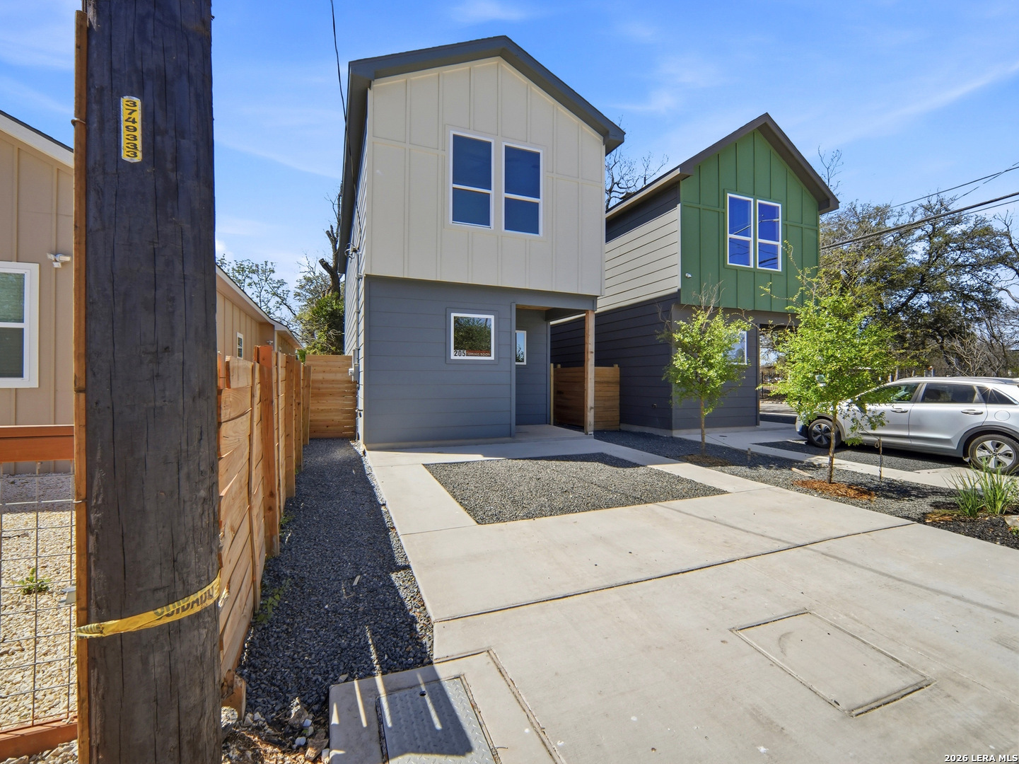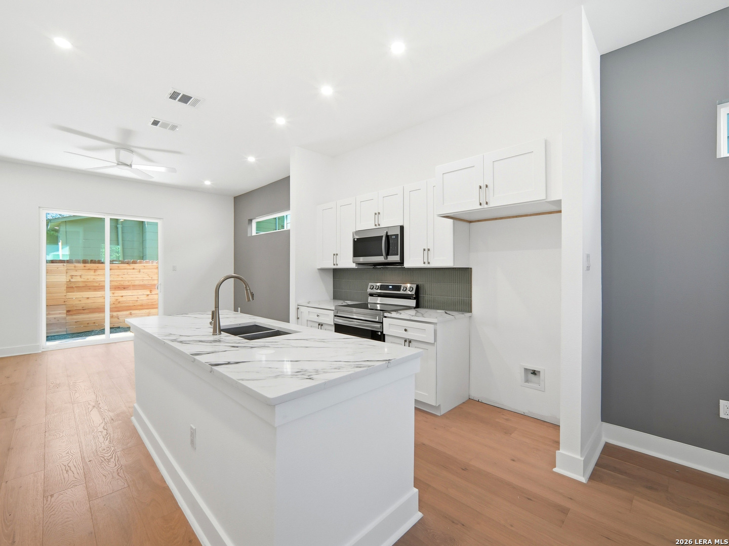 Beautiful new construction showcasing clean modern design, warm natural finishes, and an open-concept layout filled with natural light. The thoughtfully designed kitchen features quartz countertops, custom cabinetry with designer hardware, stainless steel appliances, and a sleek vertical tile backsplash. A large center island with seating provides the perfect space for cooking, gathering, and entertaining. Wide-plank wood flooring, high ceilings, recessed lighting, and modern fixtures create a bright and inviting atmosphere throughout the main living areas. The open living and dining spaces flow seamlessly and extend to the backyard through sliding glass doors, offering a comfortable indoor-outdoor connection. Clean architectural lines, large windows, and carefully selected finishes give the home a timeless yet contemporary feel. Conveniently located just minutes from downtown San Antonio, The Pearl, Fort Sam Houston, and some of the city's best restaurants and entertainment, this home offers both style and accessibility in one of the city's most dynamic areas. Photos are of a comparable home built by the same builder and are used for marketing purposes only; variations in floor plan, design, and finishes will exist.