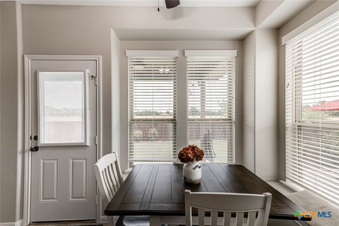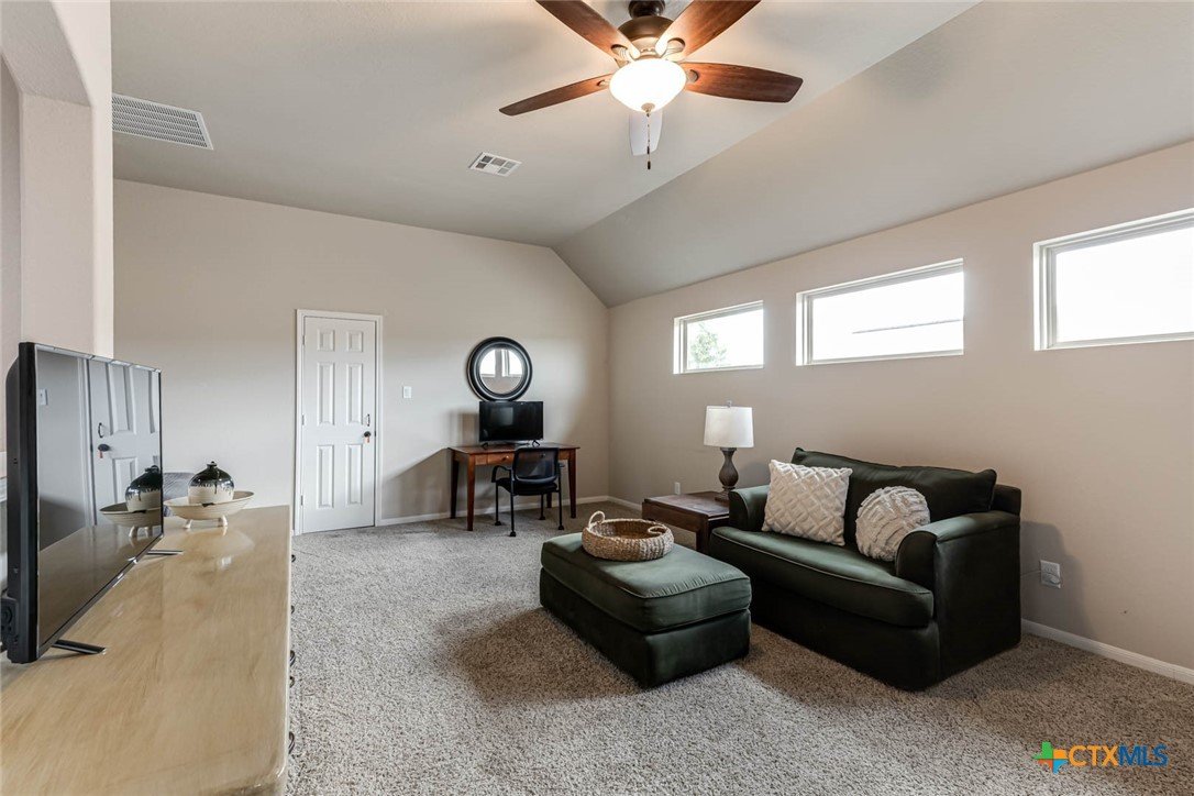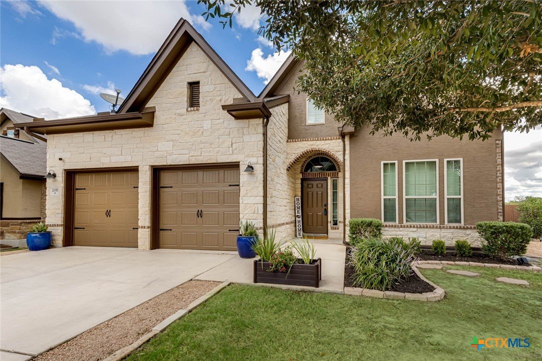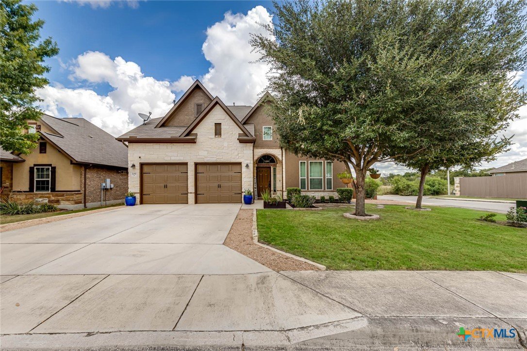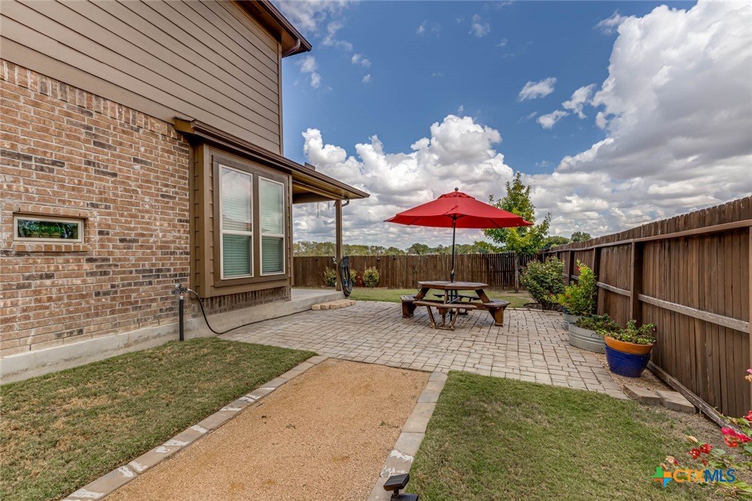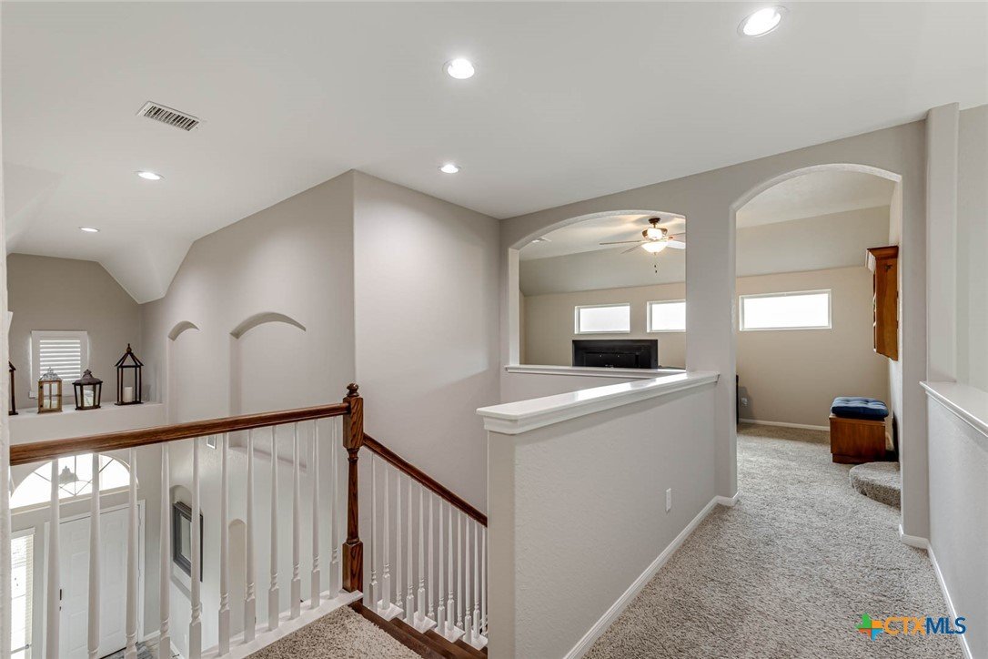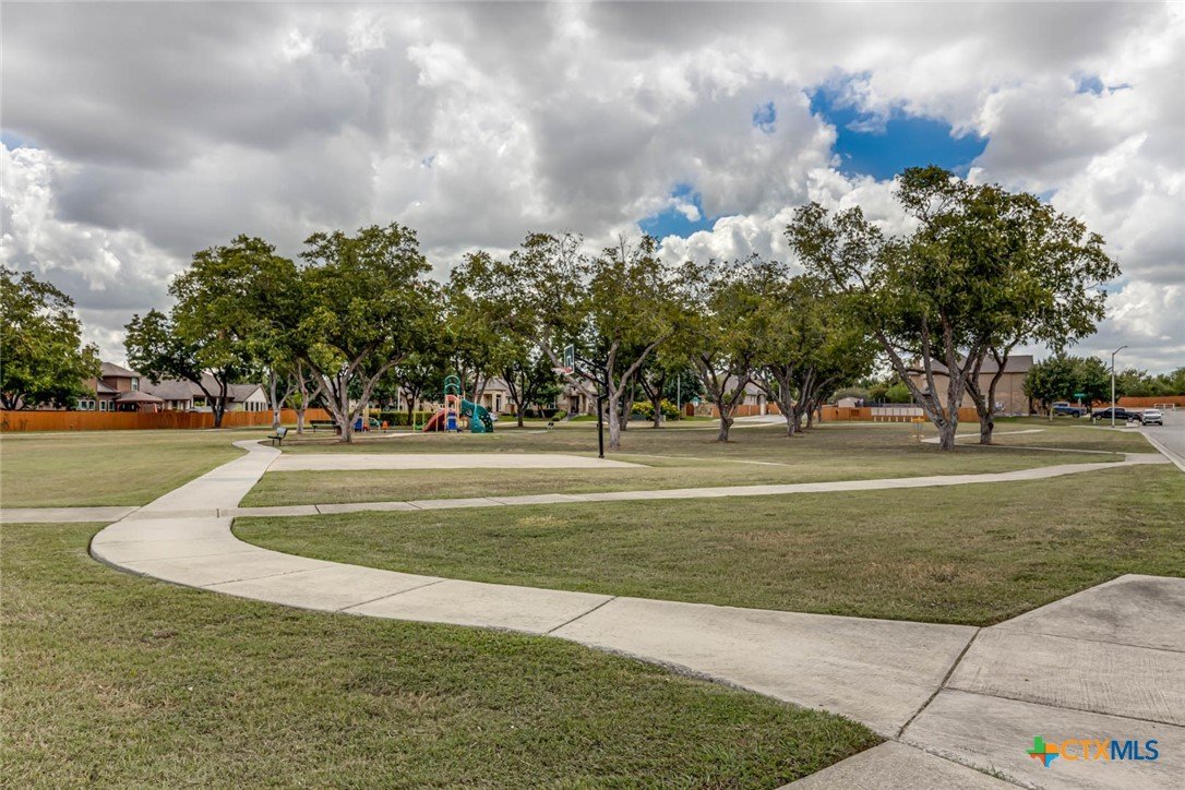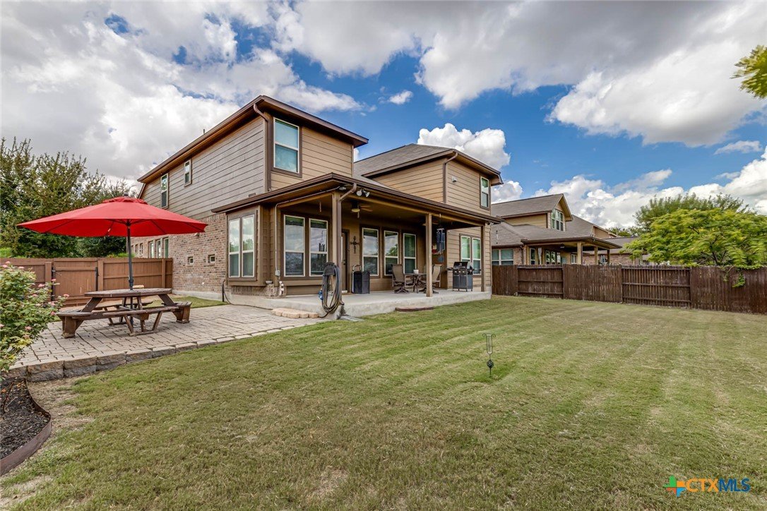 NO BACKYARD NEIGHBORS!!! This stunning 4 bedrooms 3.5 bathrooms home features elegant window treatments, including stylish blinds, and has been thoughtfully enhanced with upgraded ceiling fans and lighting fixtures that illuminate the fresh interior paint throughout. The upgraded flooring complements the spacious layout, which includes four generously sized bedrooms and four beautifully appointed bathrooms. The open-concept kitchen seamlessly integrates with the eat-in area and the formal dining room, providing ample space for entertaining. Additionally, there is a designated office and a versatile upstairs flex space, perfect for a variety of uses. Step outside to discover a Texas-sized patio nestled on a corner lot, offering full privacy in the backyard with a welcoming sitting area. Moreover, this home is ideally located across from a neighborhood park featuring frisbee golf, a playscape, a basketball court, and walking trails, making it perfect for outdoor enthusiasts. With vaulted ceilings that add to the grandeur of the space and proximity to downtown restaurants, entertainment, and shopping, as well as easy access to Highway 35 & I10, this property truly embodies the best of both comfort and convenience.