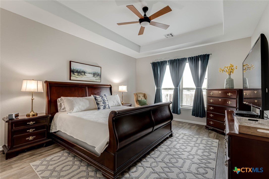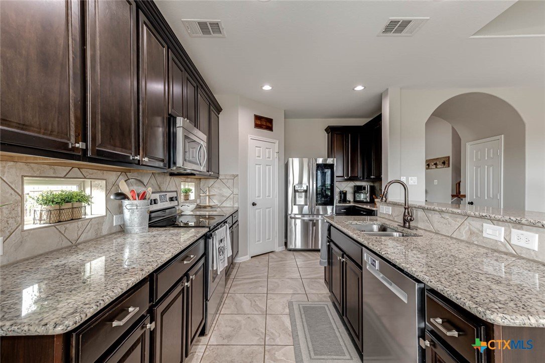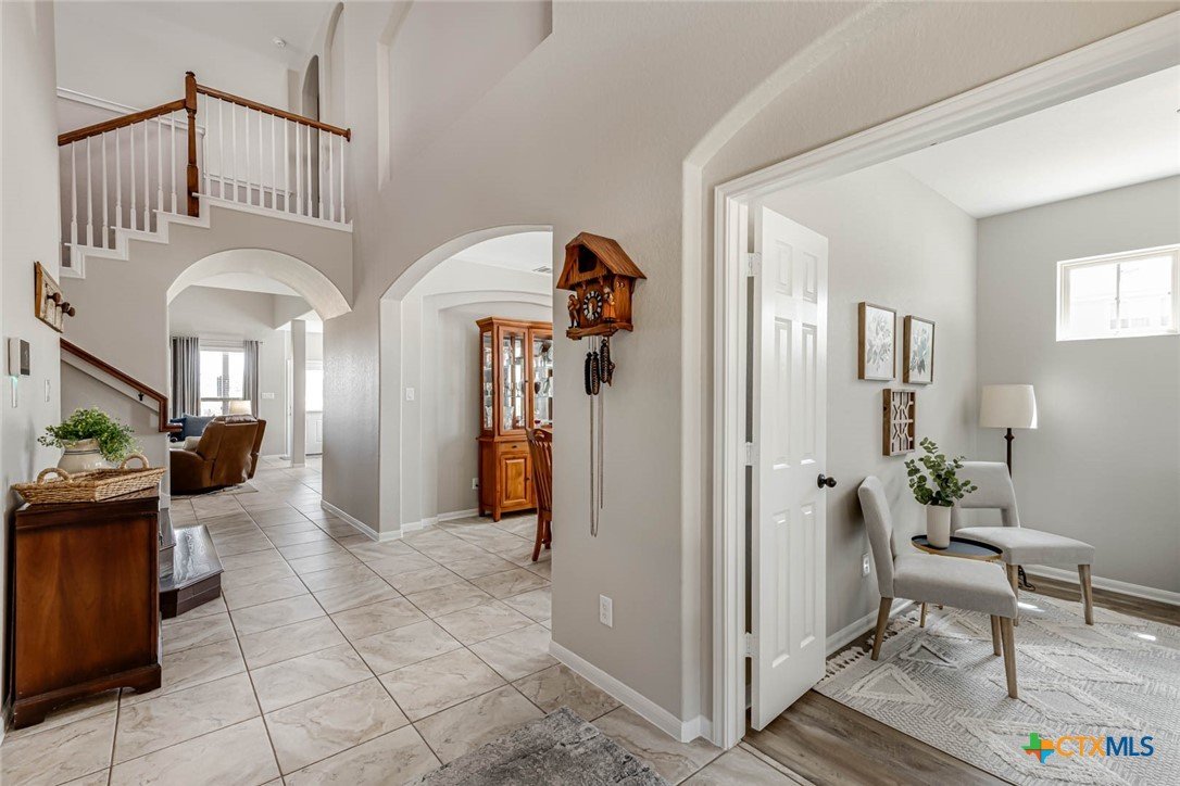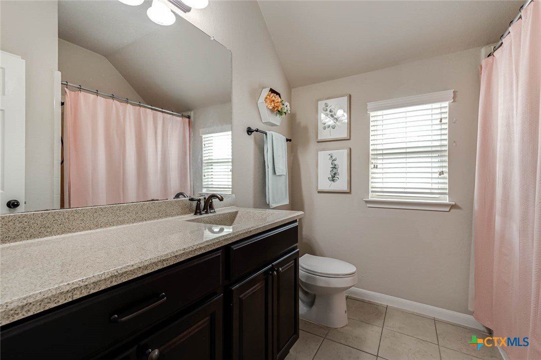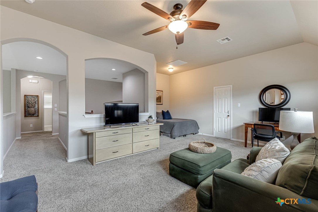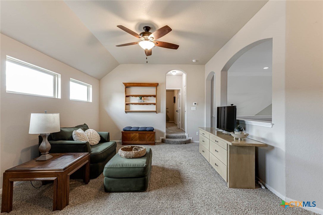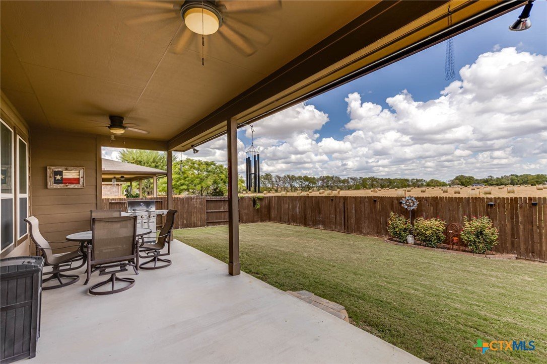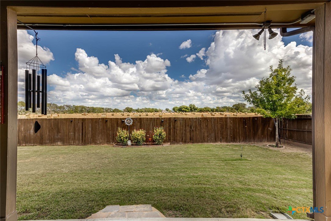 NO BACKYARD NEIGHBORS!!! This stunning 4 bedrooms 3.5 bathrooms home features elegant window treatments, including stylish blinds, and has been thoughtfully enhanced with upgraded ceiling fans and lighting fixtures that illuminate the fresh interior paint throughout. The upgraded flooring complements the spacious layout, which includes four generously sized bedrooms and four beautifully appointed bathrooms. The open-concept kitchen seamlessly integrates with the eat-in area and the formal dining room, providing ample space for entertaining. Additionally, there is a designated office and a versatile upstairs flex space, perfect for a variety of uses. Step outside to discover a Texas-sized patio nestled on a corner lot, offering full privacy in the backyard with a welcoming sitting area. Moreover, this home is ideally located across from a neighborhood park featuring frisbee golf, a playscape, a basketball court, and walking trails, making it perfect for outdoor enthusiasts. With vaulted ceilings that add to the grandeur of the space and proximity to downtown restaurants, entertainment, and shopping, as well as easy access to Highway 35 & I10, this property truly embodies the best of both comfort and convenience.