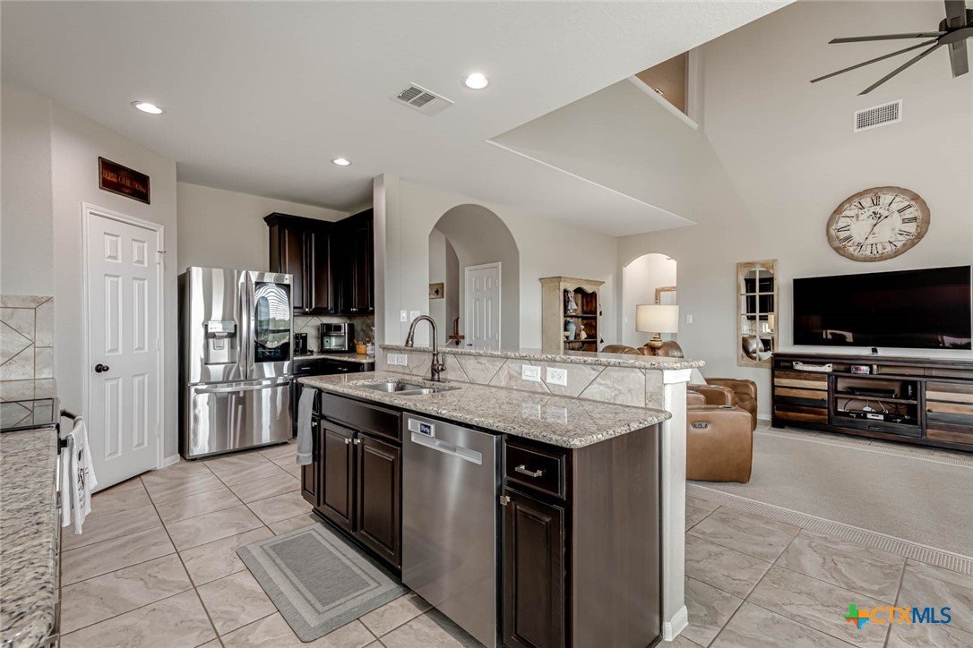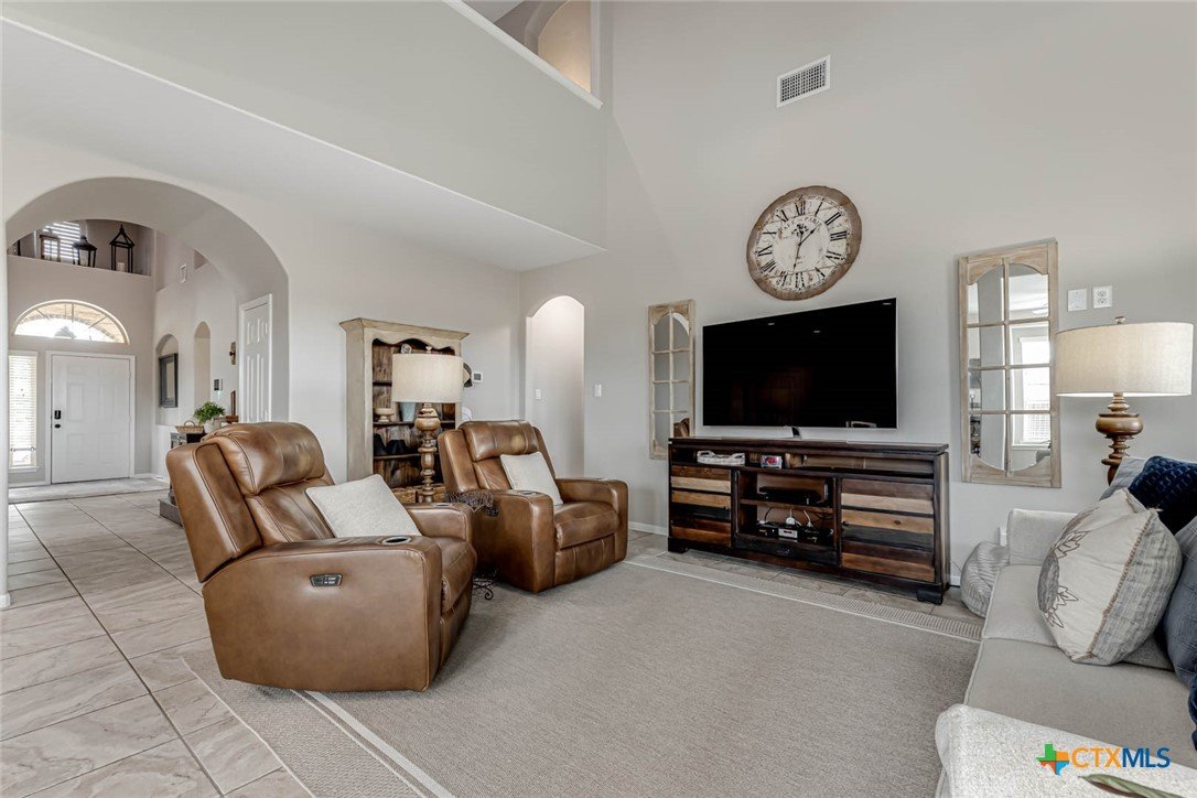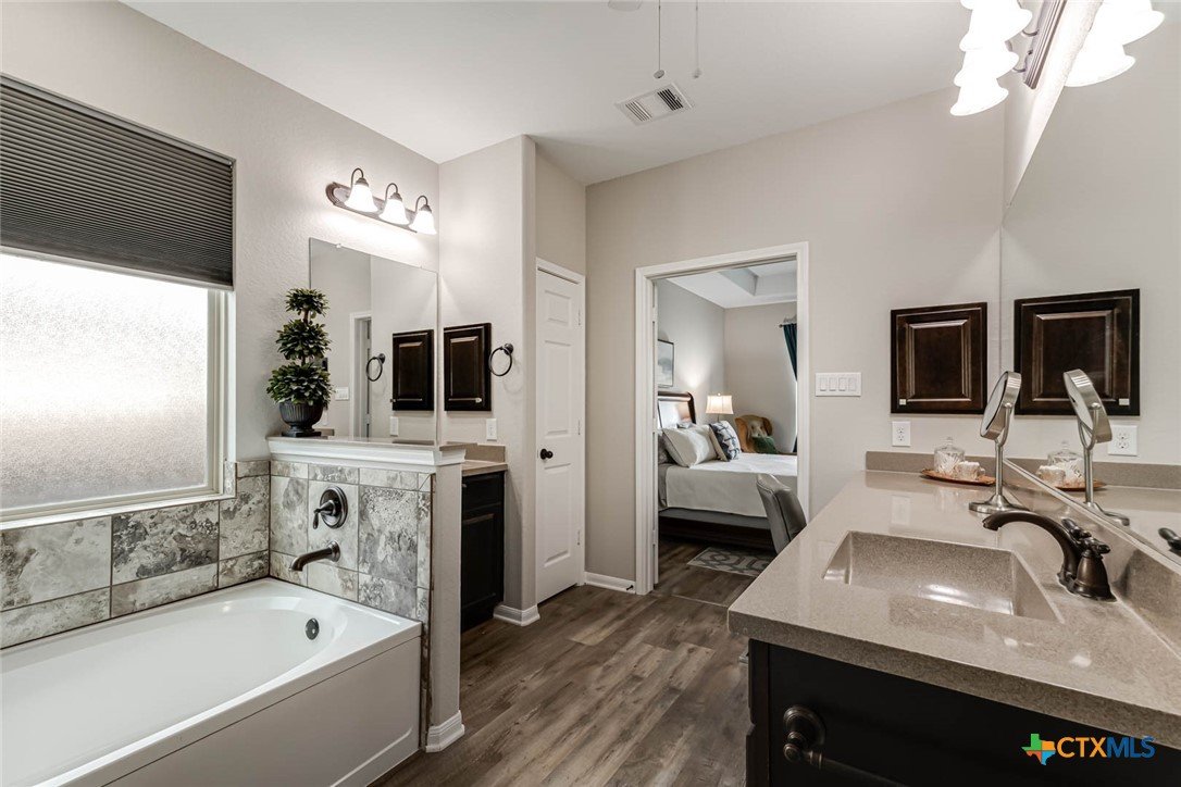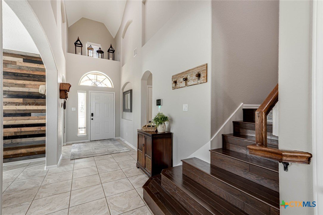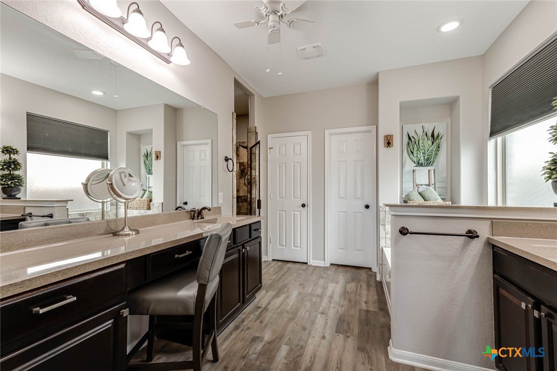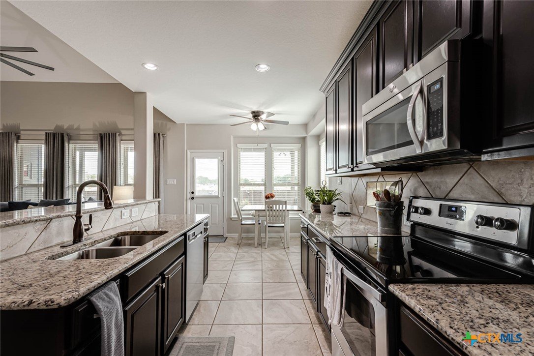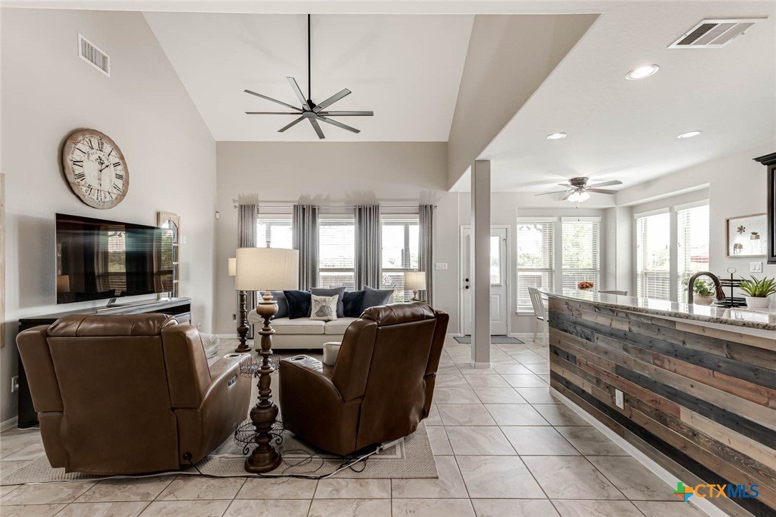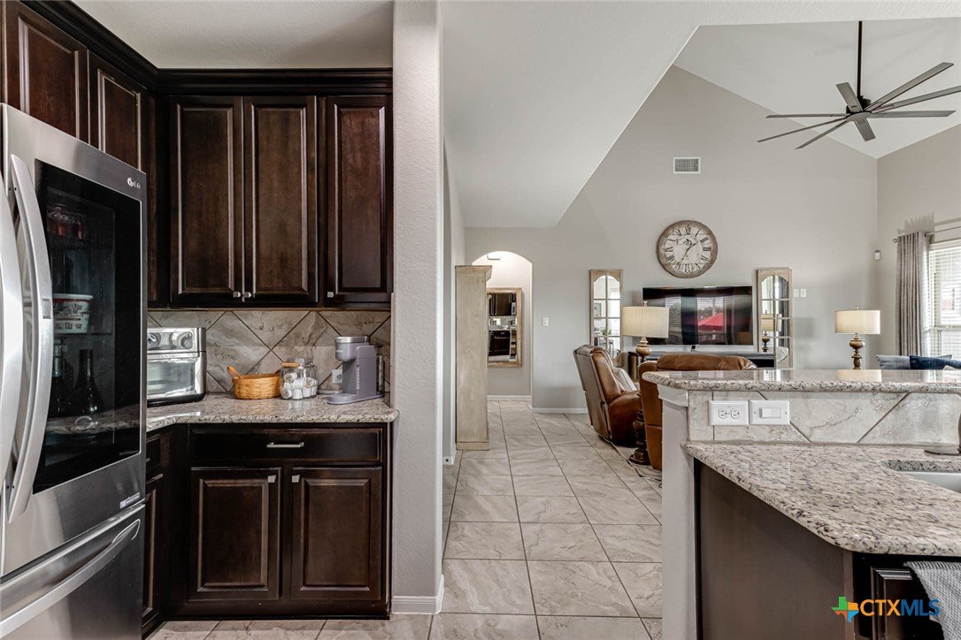 NO BACKYARD NEIGHBORS!!! This stunning 4 bedrooms 3.5 bathrooms home features elegant window treatments, including stylish blinds, and has been thoughtfully enhanced with upgraded ceiling fans and lighting fixtures that illuminate the fresh interior paint throughout. The upgraded flooring complements the spacious layout, which includes four generously sized bedrooms and four beautifully appointed bathrooms. The open-concept kitchen seamlessly integrates with the eat-in area and the formal dining room, providing ample space for entertaining. Additionally, there is a designated office and a versatile upstairs flex space, perfect for a variety of uses. Step outside to discover a Texas-sized patio nestled on a corner lot, offering full privacy in the backyard with a welcoming sitting area. Moreover, this home is ideally located across from a neighborhood park featuring frisbee golf, a playscape, a basketball court, and walking trails, making it perfect for outdoor enthusiasts. With vaulted ceilings that add to the grandeur of the space and proximity to downtown restaurants, entertainment, and shopping, as well as easy access to Highway 35 & I10, this property truly embodies the best of both comfort and convenience.