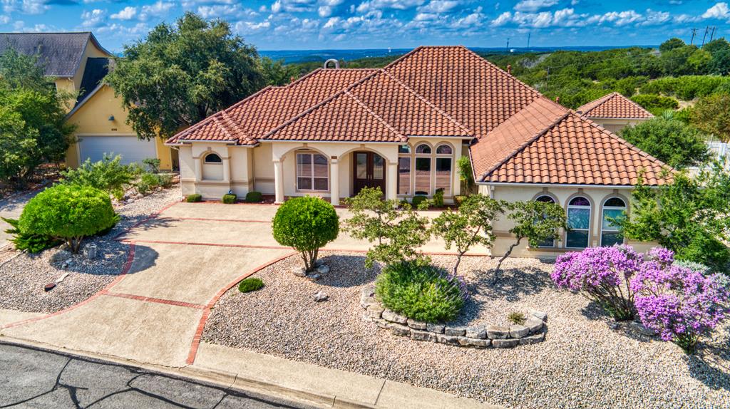 Magnificent Mediterranean 3 bedroom, 3 bath, on a hilltop with 2 living areas, pool & workshop & excellent views of the Hill Country. This home is elegance at its best. From the moment you enter the stunning great room with its multi-layered crown molding adorned tray ceiling, large picture windows & wood burning fireplace, you know its high quality. Outside, there is almost a full length covered patio perfect for entertaining. The landscaping is beautifully done & there is a detached shop hidden out of view. The great room is equally matched by the large kitchen complete with eating bar, breakfast area & large island. The master suite features a private sitting area & a spacious master bath with walk-in shower, jetted tub & double vanities. Lg 2 car garage, stairs to attic for easy access