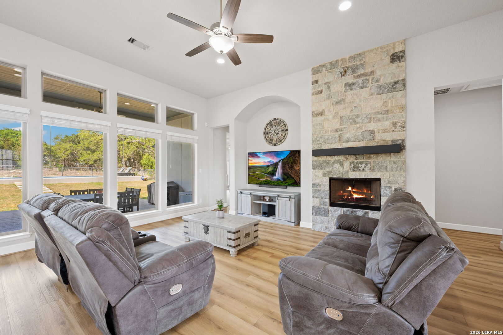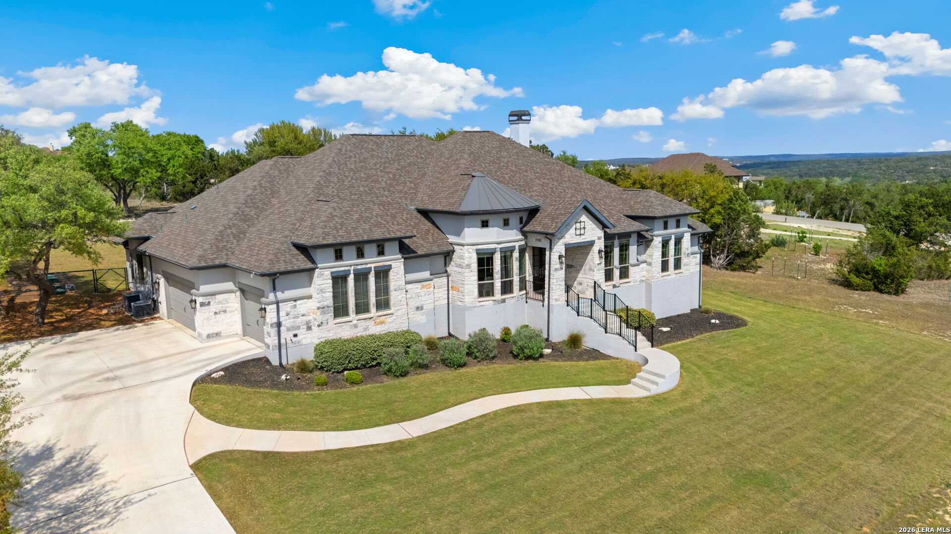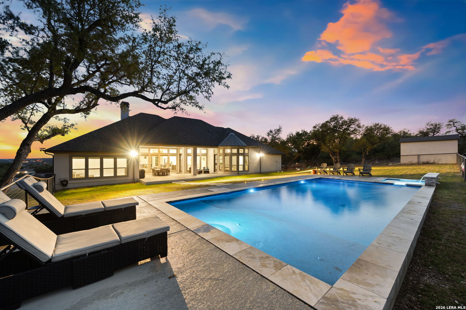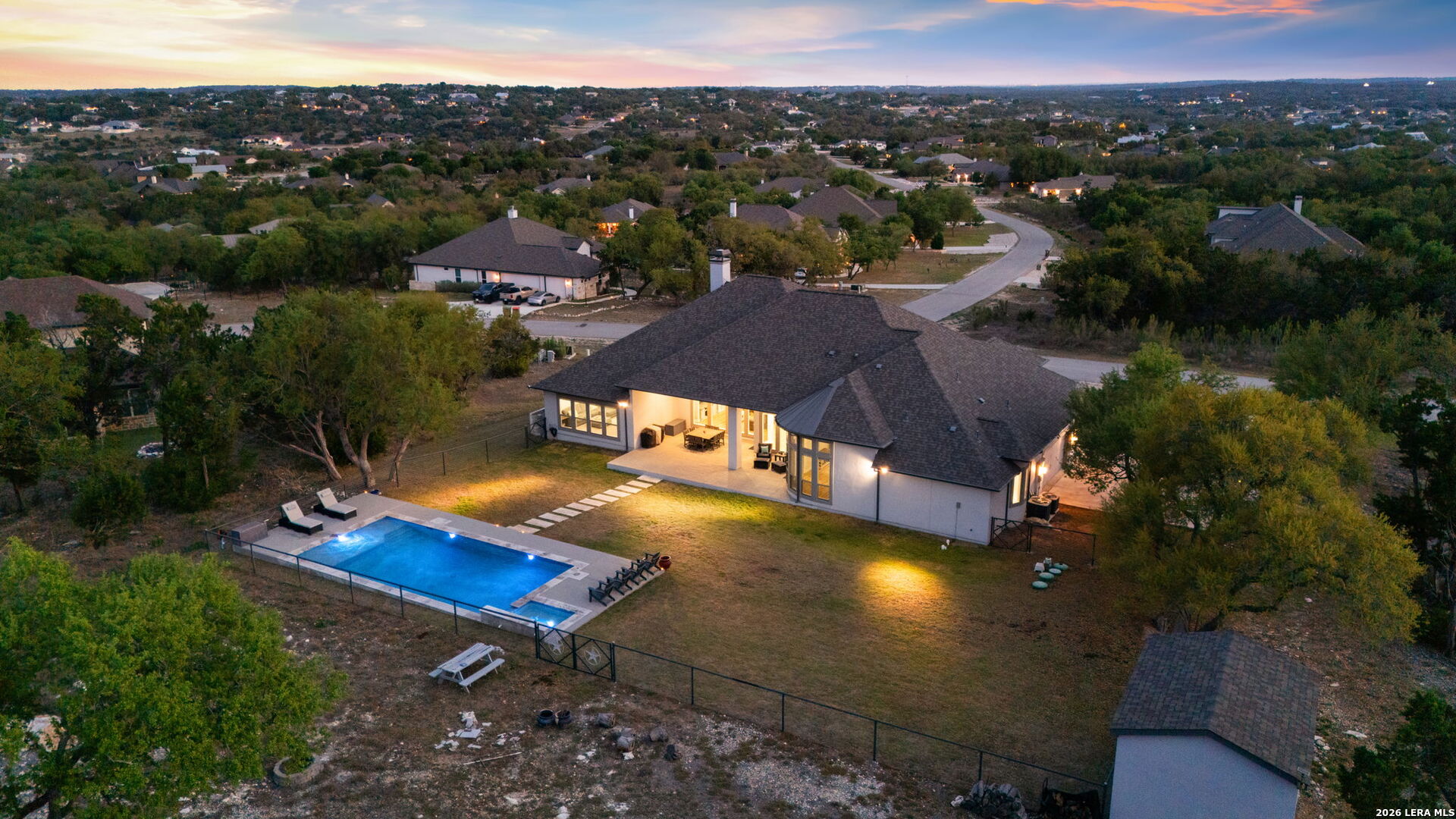 Welcome to an exceptional expression of Hill Country luxury in the highly coveted community of Vintage Oaks. Built in 2021 by Perry Homes, this 3,478 square foot residence is privately positioned on a premier cul-de-sac homesite, capturing sweeping panoramic views that set a new standard for elevated living in New Braunfels. From the moment you arrive, the home exudes a sense of presence and refinement, with intentional design, clean architectural lines, and a layout that seamlessly blends sophistication with livability. Inside, expansive living spaces are framed by natural light and curated finishes, creating an atmosphere that feels both elevated and inviting. At the heart of the home, the chef's kitchen is thoughtfully designed for both function and statement, featuring quartz countertops, double ovens, an oversized island, and a seamless transition into both formal and casual dining spaces. This central gathering space flows effortlessly into the main living area, where walls of windows showcase uninterrupted views of the resort-style backyard. Step outside to a private outdoor retreat designed for both relaxation and entertaining. The custom pool and spa serve as the focal point, surrounded by expansive patio space and a backdrop of rolling Hill Country views, delivering a true sense of privacy and escape. The primary suite is a secluded sanctuary, offering a spa-inspired bath complete with a garden tub, walk-in shower, and multiple oversized walk-in closets. Secondary bedrooms are thoughtfully positioned, connected by a well-appointed Jack and Jill bath, while a dedicated office and spacious game room provide flexibility for both work and lifestyle. Every element of this home has been carefully considered to deliver a balance of luxury, comfort, and functionality. Residents of Vintage Oaks enjoy access to one of the most sought-after amenity centers in the region, including resort-style pools, a lazy river, state-of-the-art fitness center, scenic walking trails, and a vibrant, community-driven atmosphere. This is more than a home, it is a statement. A rare opportunity to own a newer construction property with commanding views, luxury outdoor living, and timeless design in one of the Texas Hill Country's premier communities.