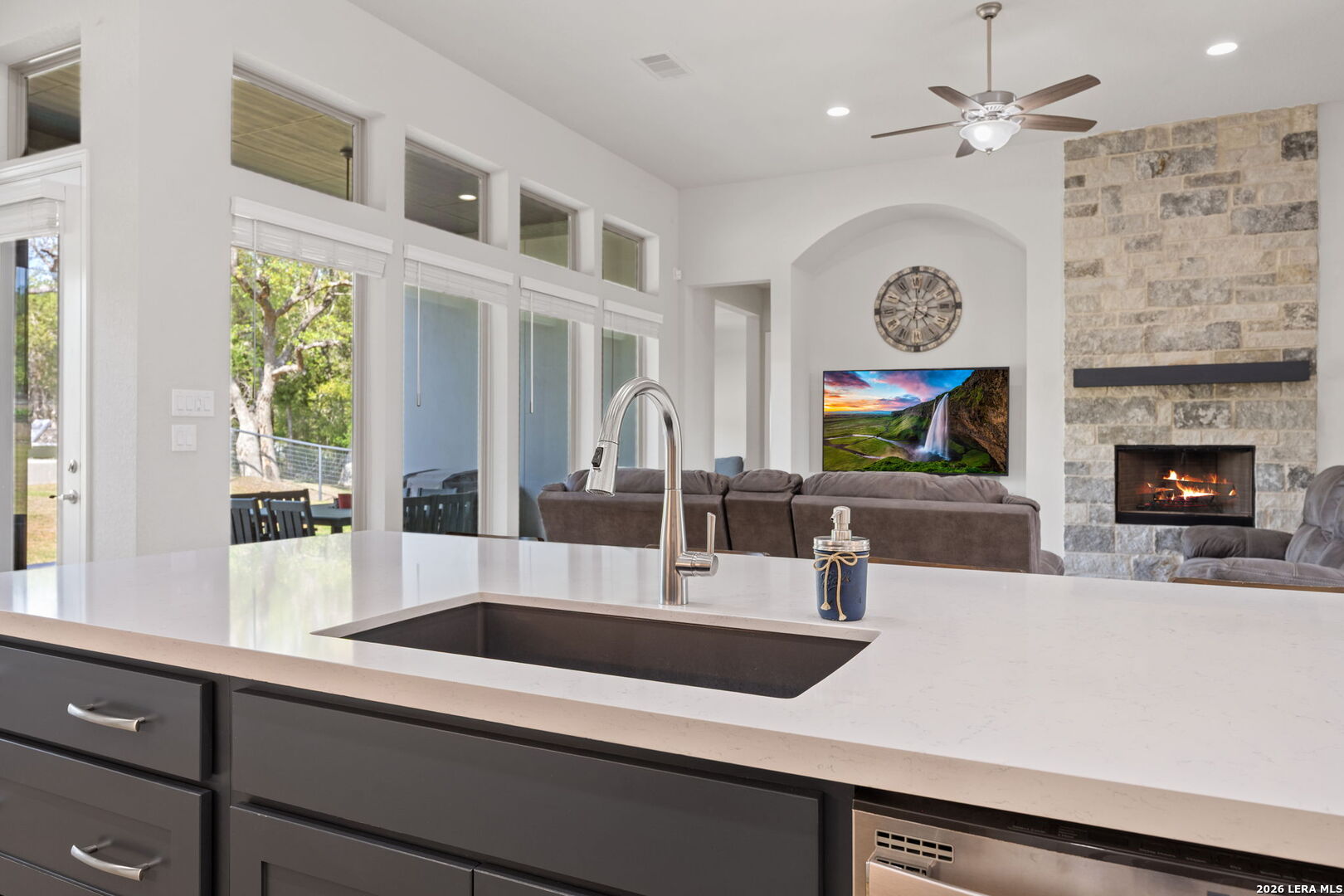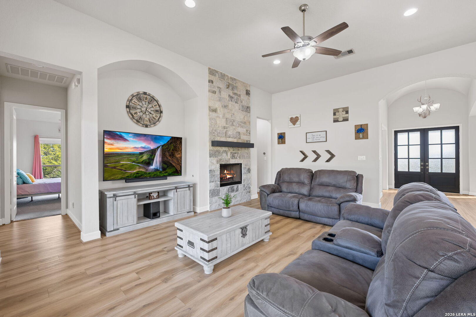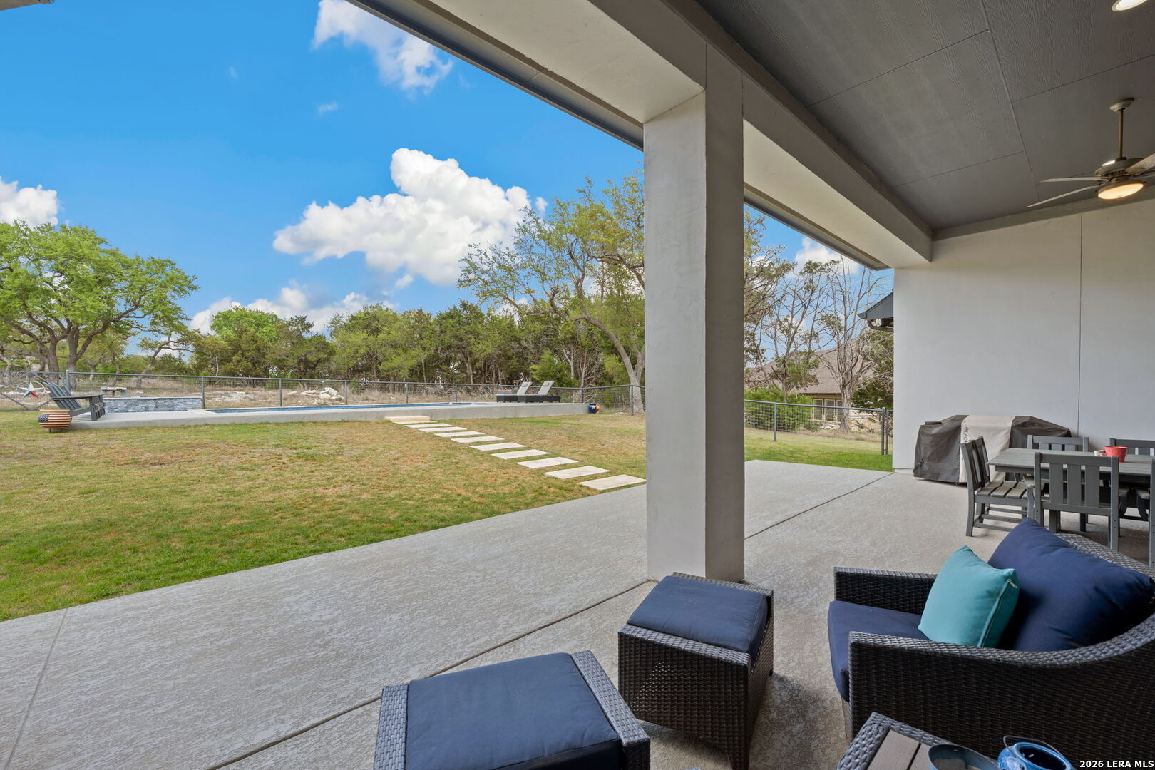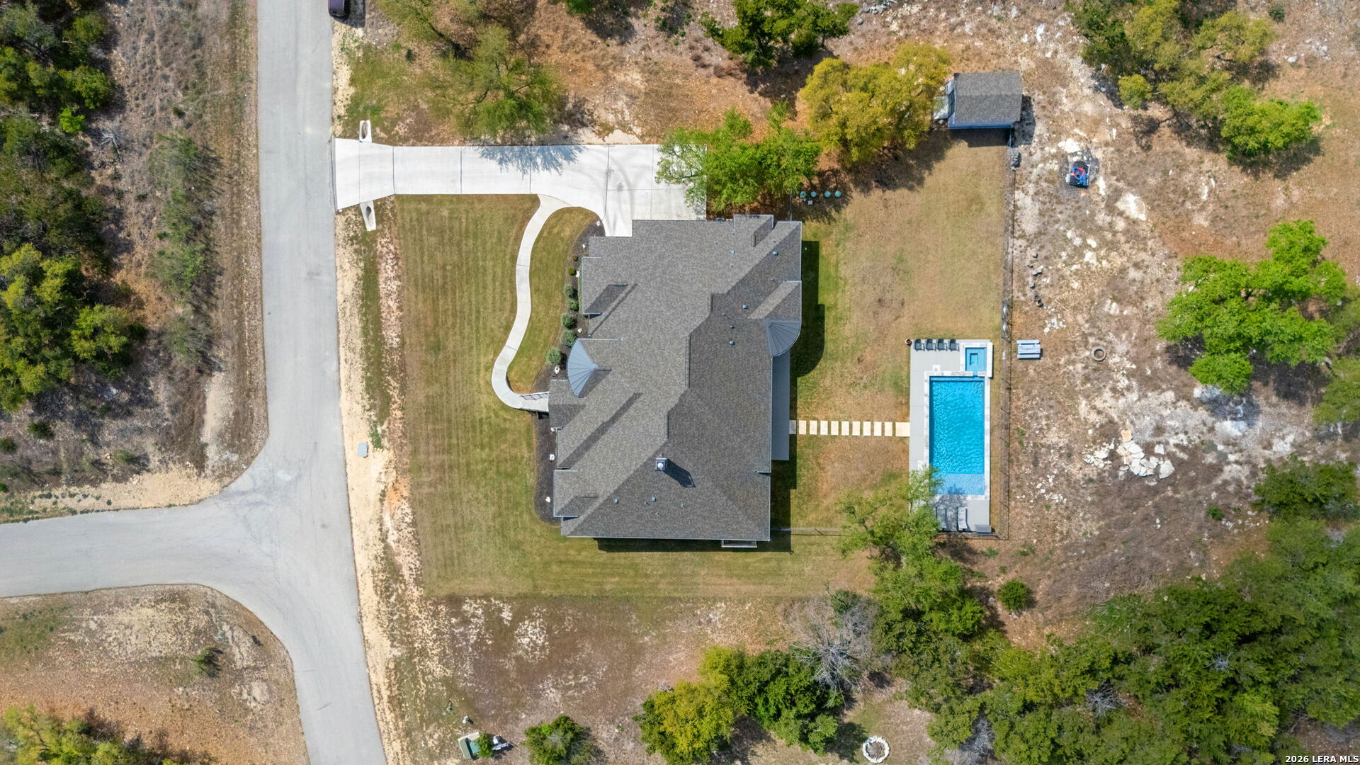 Welcome to an exceptional expression of Hill Country luxury in the highly coveted community of Vintage Oaks. Built in 2021 by Perry Homes, this 3,478 square foot residence is privately positioned on a premier cul-de-sac homesite, capturing sweeping panoramic views that set a new standard for elevated living in New Braunfels. From the moment you arrive, the home exudes a sense of presence and refinement, with intentional design, clean architectural lines, and a layout that seamlessly blends sophistication with livability. Inside, expansive living spaces are framed by natural light and curated finishes, creating an atmosphere that feels both elevated and inviting. At the heart of the home, the chef's kitchen is thoughtfully designed for both function and statement, featuring quartz countertops, double ovens, an oversized island, and a seamless transition into both formal and casual dining spaces. This central gathering space flows effortlessly into the main living area, where walls of windows showcase uninterrupted views of the resort-style backyard. Step outside to a private outdoor retreat designed for both relaxation and entertaining. The custom pool and spa serve as the focal point, surrounded by expansive patio space and a backdrop of rolling Hill Country views, delivering a true sense of privacy and escape. The primary suite is a secluded sanctuary, offering a spa-inspired bath complete with a garden tub, walk-in shower, and multiple oversized walk-in closets. Secondary bedrooms are thoughtfully positioned, connected by a well-appointed Jack and Jill bath, while a dedicated office and spacious game room provide flexibility for both work and lifestyle. Every element of this home has been carefully considered to deliver a balance of luxury, comfort, and functionality. Residents of Vintage Oaks enjoy access to one of the most sought-after amenity centers in the region, including resort-style pools, a lazy river, state-of-the-art fitness center, scenic walking trails, and a vibrant, community-driven atmosphere. This is more than a home, it is a statement. A rare opportunity to own a newer construction property with commanding views, luxury outdoor living, and timeless design in one of the Texas Hill Country's premier communities.