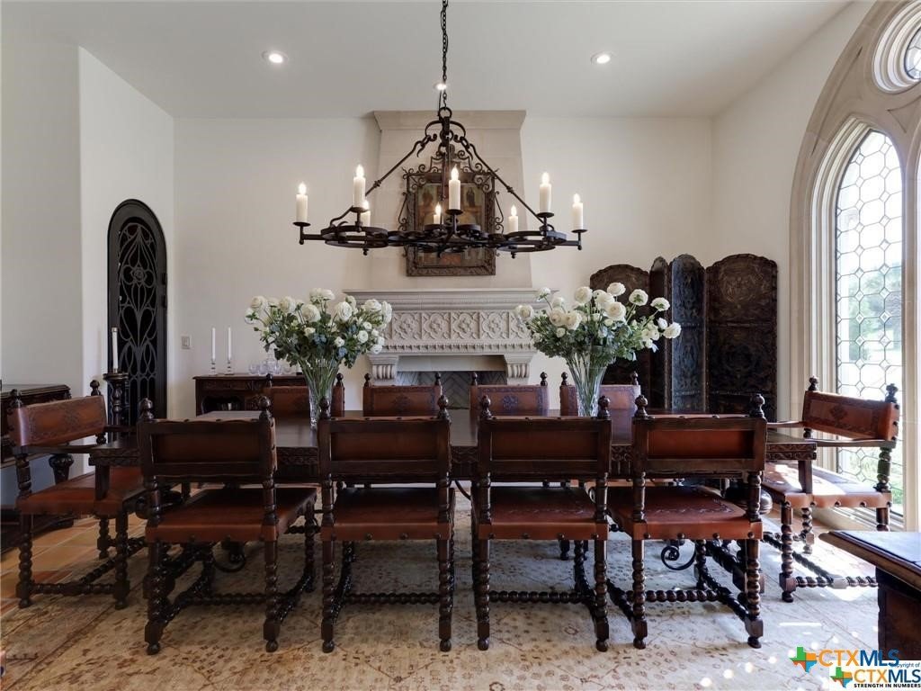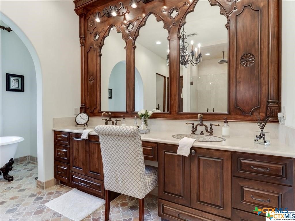 This home is elegant and understated in a true Spanish Colonial Revival style, in immaculate condition, located on six plus acres backing up to Spring Creek. Inside features include tree custom stone fireplaces, hand hewn antique beams, Saltillo flooring with Level 5 drywall throughout, large main suite quarters, two separate walk in closets, custom carved wood paneling in bathroom, kitchen and library. Formal living and dining rooms contain custom gothic arched windows. Kitchen includes breakfast area with custom windows, Sub-Zero and Wolf appliances in the kitchen, copper sinks, quartzite counters. Walk in pantry and large laundry. Exterior includes custom iron door and driveway gates, mature landscaping and lighting, graceful pool with spa. Summer kitchen with Wolf grill and sink, FP and includes storage and 1/2 bath. Outdoor chapel which can be used for another purpose, bocce court, labyrinth. Ivy lined privacy walls between neighbors. Absolutely STUNNING property!