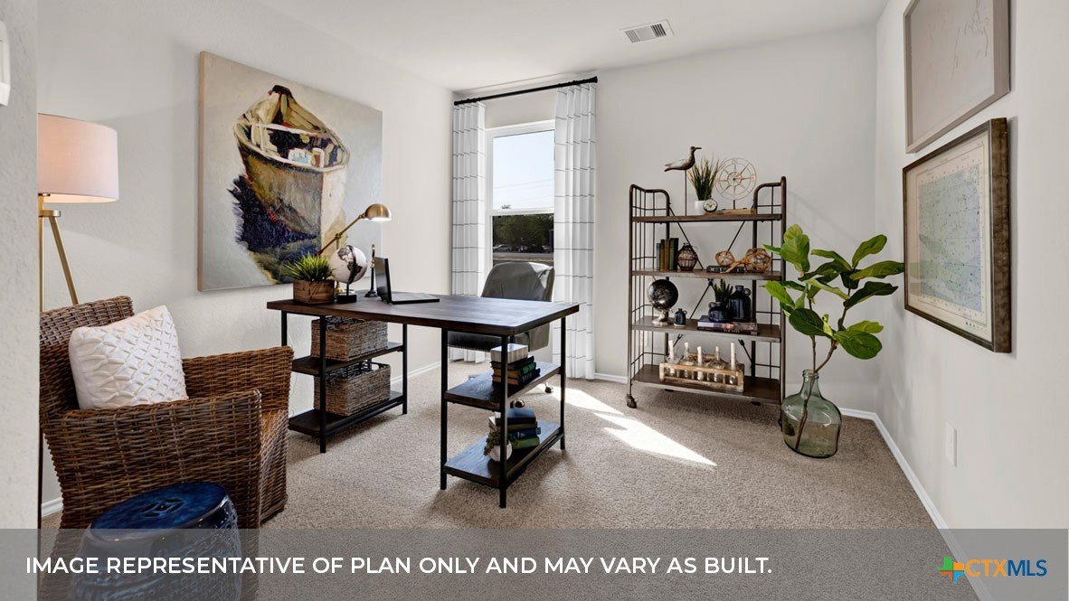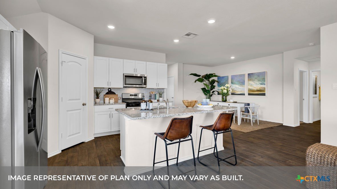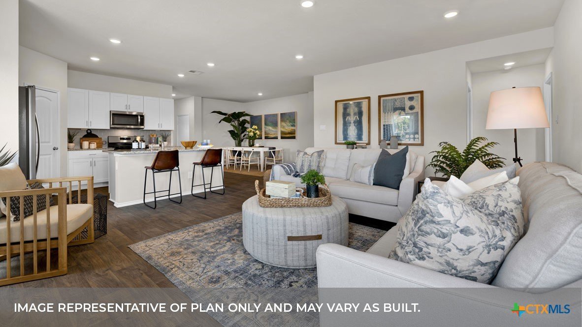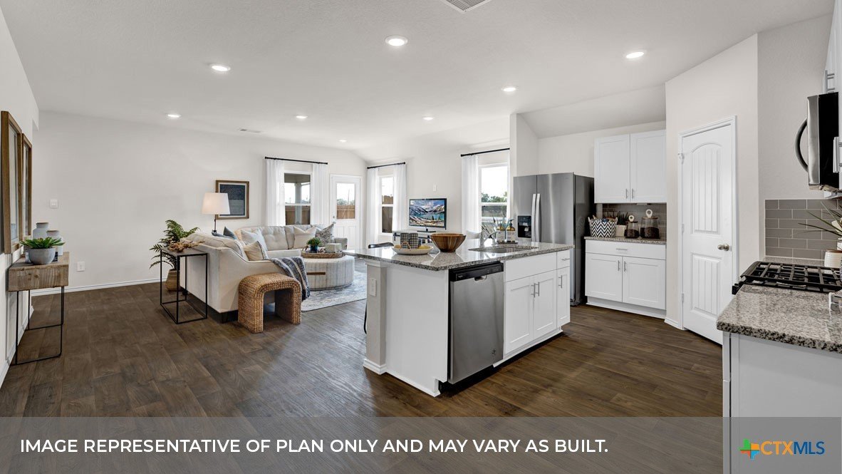 MARCH ESTIMATED COMPLETION DATE. CUL-DE-SAC LOT. The Lakeway is our most popular floorplan and is available at Hansford in Lockhart, Texas. This one-story home offers 2,034 square feet of living space across 4 bedrooms, 3 bathrooms, a study, and 2-car garage. Our homes in Hansford feature farmhouse exteriors. As you enter the home from the covered front porch, you’ll step into the spacious foyer and will find the open study, bathroom 2 and bedroom 2. Use the study as a home office, library, or extra play area for the kids. Stepping further into the home, you’ll discover the dining room, kitchen and family room laid out in an open concept design. Built to make cooking, eating, and entertaining a pleasant experience for family and friends, you’re sure to make many memories in this beautiful space. The kitchen includes granite countertops, a large island facing the family room, a walk-in pantry, stainless-steel appliances and 36’’ upper cabinets. Located privately off the dining room are bedrooms 3 and 4, as well as bathroom 3. The primary bedroom is at the back of the house, off the family room, and includes a private bathroom. This relaxing bathroom space features a 5’ walk in shower, vanity, private toilet area with a door, and a walk-in closet. The utility room is outside the primary bedroom, allowing for the laundry chores to be completed with ease. The Lakeway includes vinyl flooring throughout the common areas of the home, and carpet in the bedrooms. All our new homes feature a covered back patio, full sod, irrigation system in the front and back yard, and a 6’ privacy fence around the back yard. This home includes our America’s Smart Home base package, which includes the Amazon Echo Pop, Front Doorbell, Front Door Deadbolt Lock, Home Hub, Thermostat, and Deako® Smart Switches