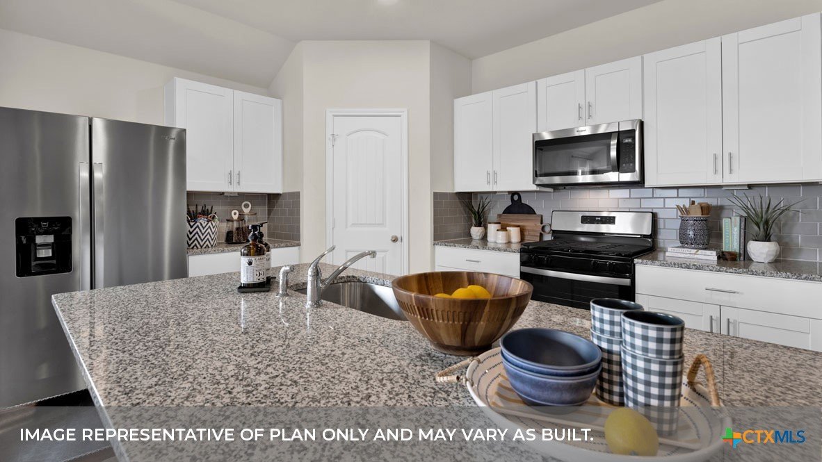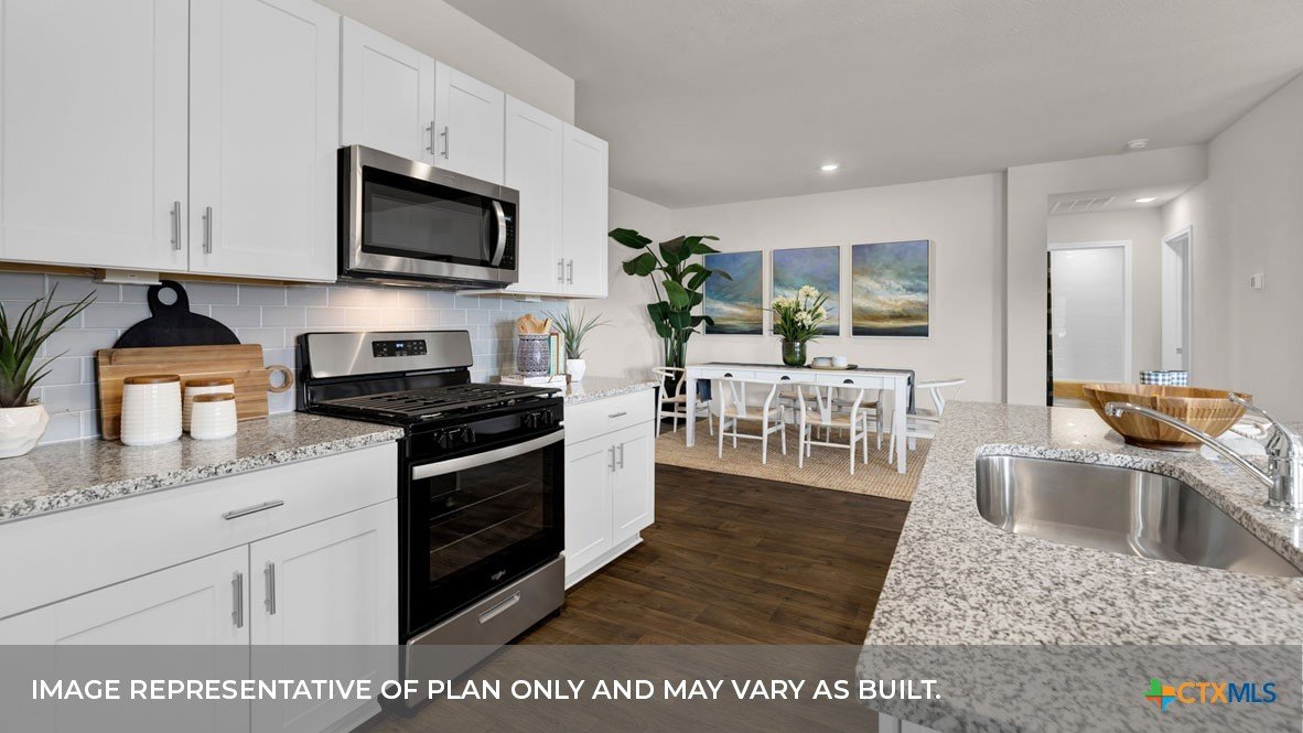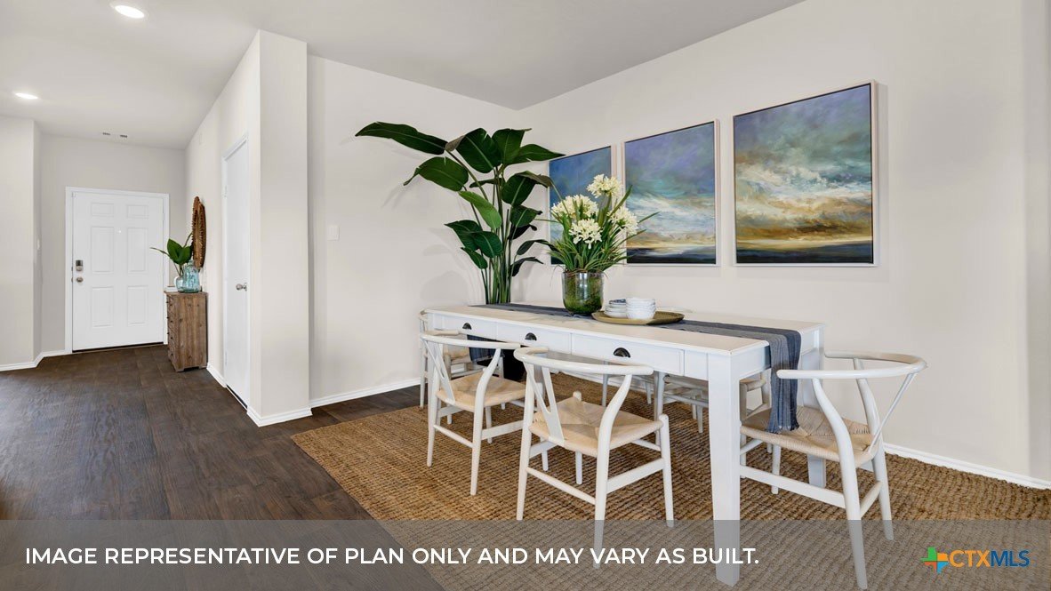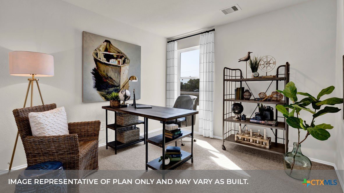 MARCH ESTIMATED COMPLETION DATE. CUL-DE-SAC LOT. The Lakeway is our most popular floorplan and is available at Hansford in Lockhart, Texas. This one-story home offers 2,034 square feet of living space across 4 bedrooms, 3 bathrooms, a study, and 2-car garage. Our homes in Hansford feature farmhouse exteriors. As you enter the home from the covered front porch, you’ll step into the spacious foyer and will find the open study, bathroom 2 and bedroom 2. Use the study as a home office, library, or extra play area for the kids. Stepping further into the home, you’ll discover the dining room, kitchen and family room laid out in an open concept design. Built to make cooking, eating, and entertaining a pleasant experience for family and friends, you’re sure to make many memories in this beautiful space. The kitchen includes granite countertops, a large island facing the family room, a walk-in pantry, stainless-steel appliances and 36’’ upper cabinets. Located privately off the dining room are bedrooms 3 and 4, as well as bathroom 3. The primary bedroom is at the back of the house, off the family room, and includes a private bathroom. This relaxing bathroom space features a 5’ walk in shower, vanity, private toilet area with a door, and a walk-in closet. The utility room is outside the primary bedroom, allowing for the laundry chores to be completed with ease. The Lakeway includes vinyl flooring throughout the common areas of the home, and carpet in the bedrooms. All our new homes feature a covered back patio, full sod, irrigation system in the front and back yard, and a 6’ privacy fence around the back yard. This home includes our America’s Smart Home base package, which includes the Amazon Echo Pop, Front Doorbell, Front Door Deadbolt Lock, Home Hub, Thermostat, and Deako® Smart Switches
