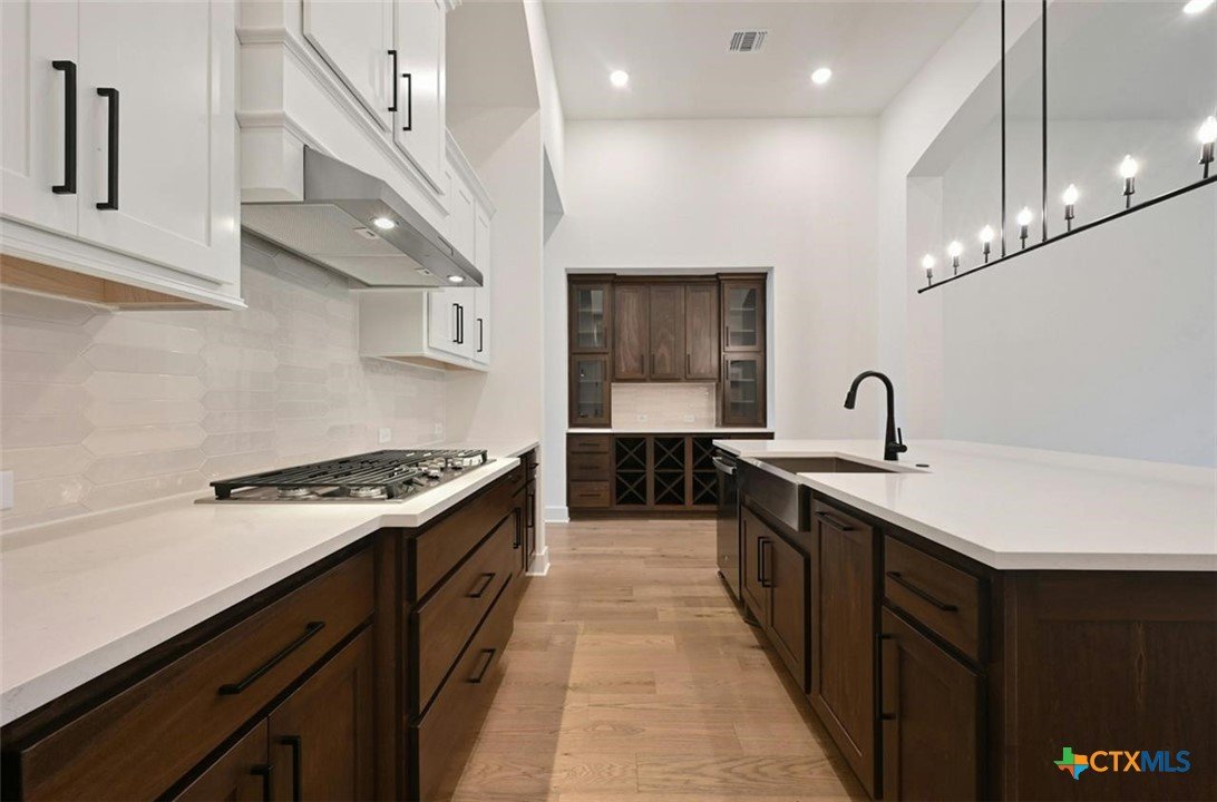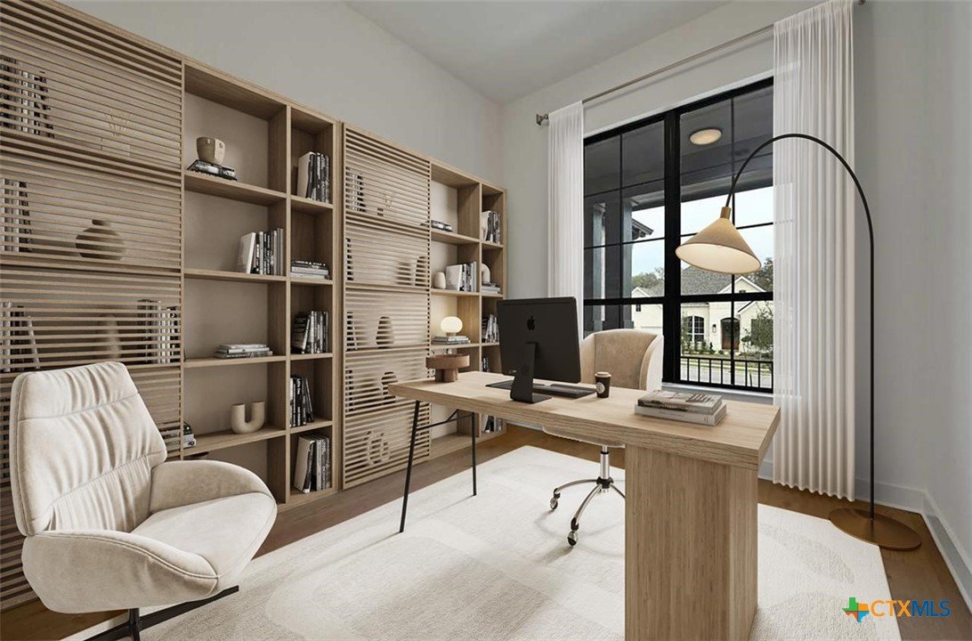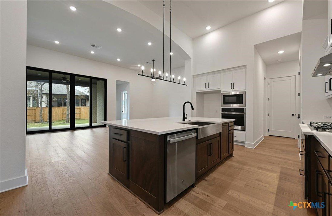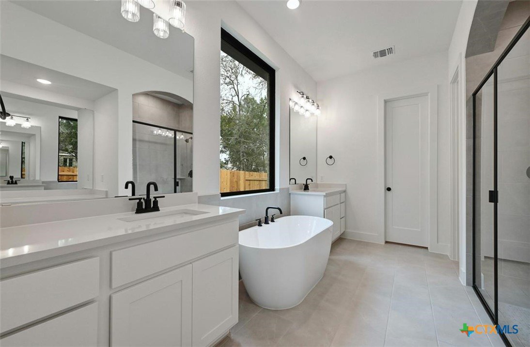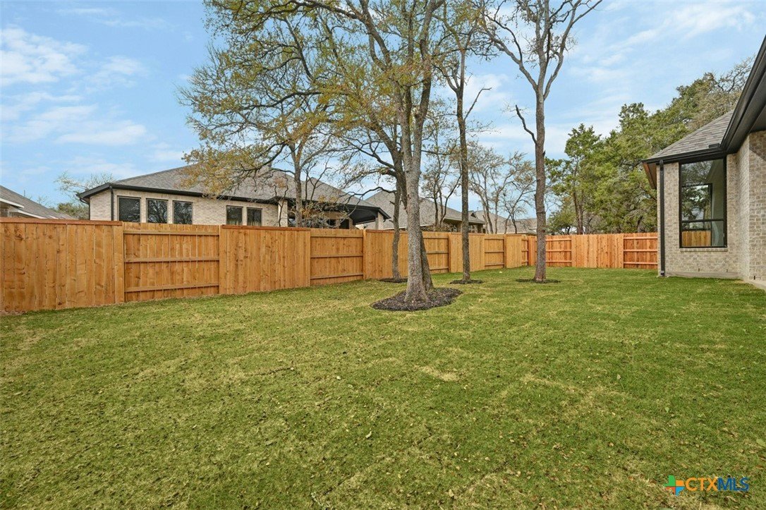 MLS 562186 - Built by Highland Homes - Ready Now! ~ POPULAR MODEL HOME PLAN! Stunning light brick home with white limestone & black window frames throughout for TONS of curb appeal. Mature oak trees onsite & upgraded landscaping package included! Grand home with double-door main entry & 13' ceilings throughout. Kitchen at heart of home with built-in hutch & wine rack! Sliding glass doors at patio that leads to oversized, private patio. Suite with oversized walk-in shower at front of home. Home offers 4 spacious beds with media & study. Primary is HUGE with sitting area that leads into luxury en-suite with freestanding tub & oversized shower. Built-in cabinets & sink in laundry for high-end living. Wood floors throughout all common areas, study & primary bed. Smart home technology package & energy star home!!!!