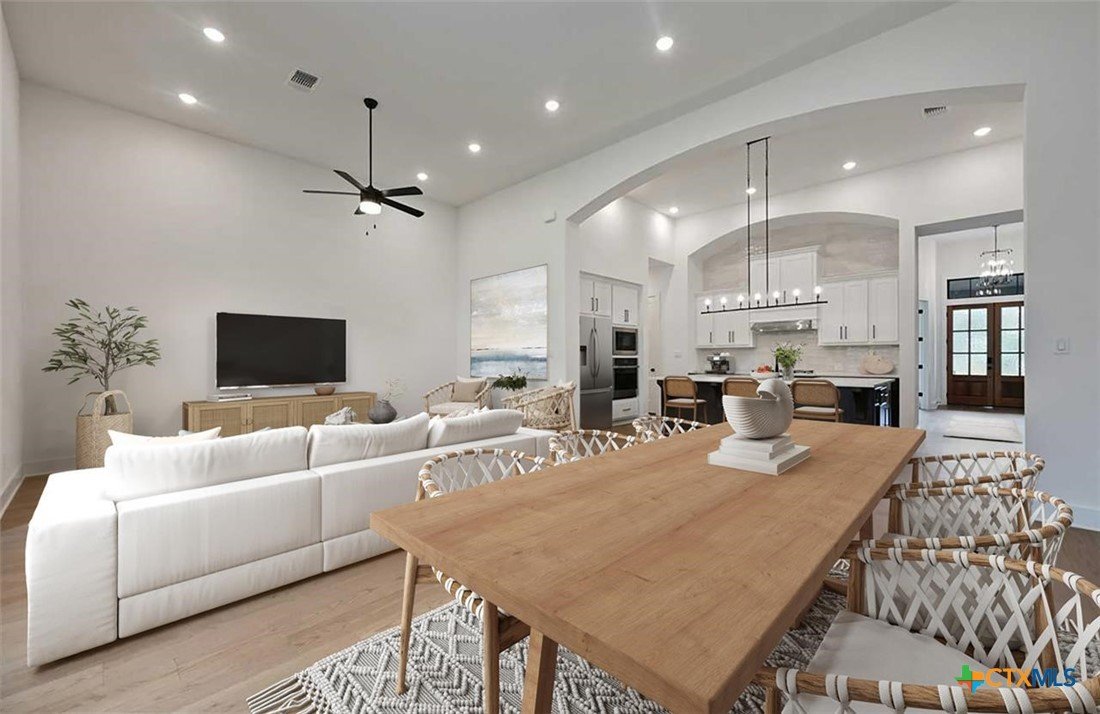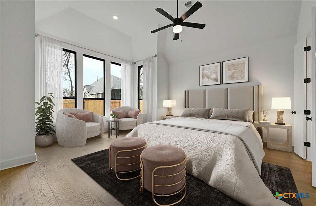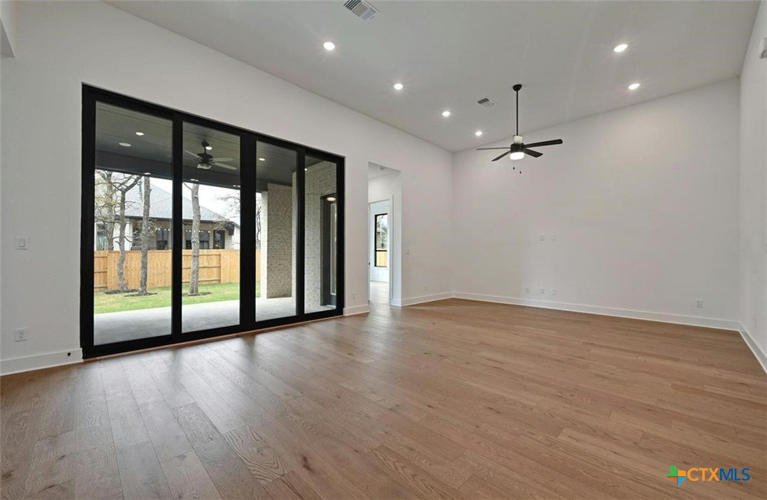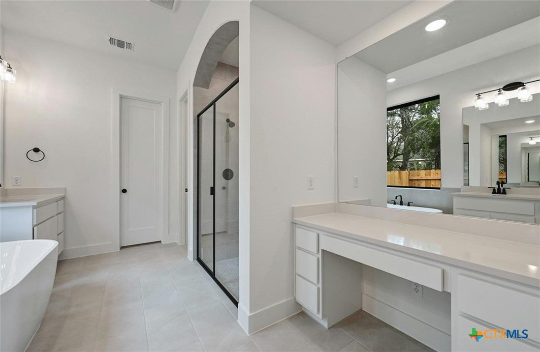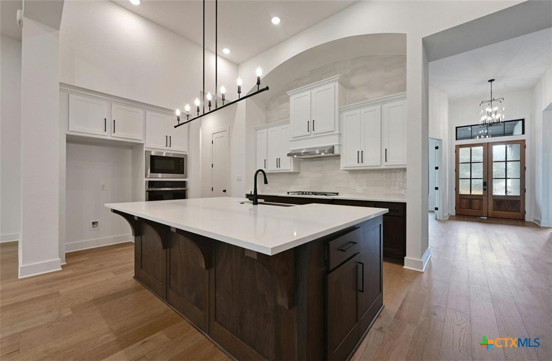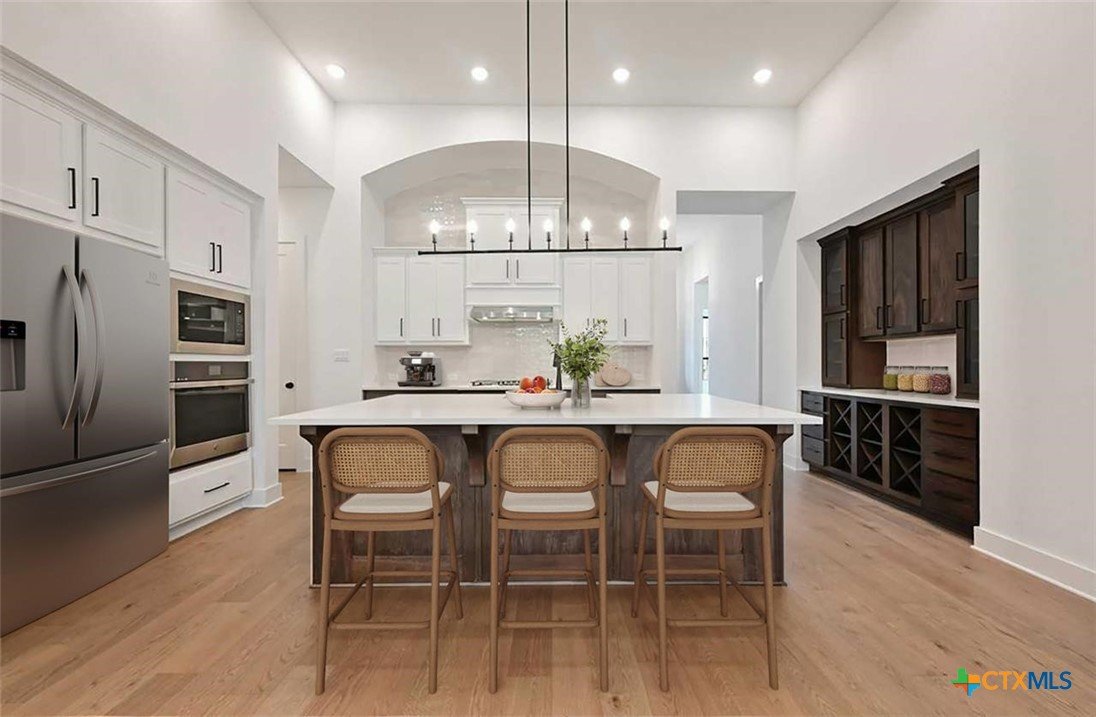 MLS 562186 - Built by Highland Homes - Ready Now! ~ POPULAR MODEL HOME PLAN! Stunning light brick home with white limestone & black window frames throughout for TONS of curb appeal. Mature oak trees onsite & upgraded landscaping package included! Grand home with double-door main entry & 13' ceilings throughout. Kitchen at heart of home with built-in hutch & wine rack! Sliding glass doors at patio that leads to oversized, private patio. Suite with oversized walk-in shower at front of home. Home offers 4 spacious beds with media & study. Primary is HUGE with sitting area that leads into luxury en-suite with freestanding tub & oversized shower. Built-in cabinets & sink in laundry for high-end living. Wood floors throughout all common areas, study & primary bed. Smart home technology package & energy star home!!!!
