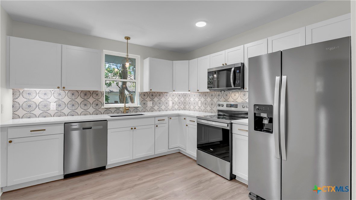 Stunning Fully Remodeled Home in the Heart of Burnet! Located on E Kerr Street, this beautifully renovated home feels like new construction— every detail has been thoughtfully updated with modern finishes and quality craftsmanship. Sitting proudly on a spacious corner lot, you'll love the curb appeal with mature trees, blooming crepe myrtles, fresh sod and a gorgeous stained privacy fence. Inside,enjoy an open and airy layout that flows seamlessly for everyday living and entertaining. Step out back to your oversized covered patio overlooking the expansive backyard - perfect for relaxing or hosting gatherings. There's an extended concrete area off the side driveway and front porch for extra parking, play space, or projects. Rarely does a turnkey home like this come available in such a prime central location. Don’t miss it!