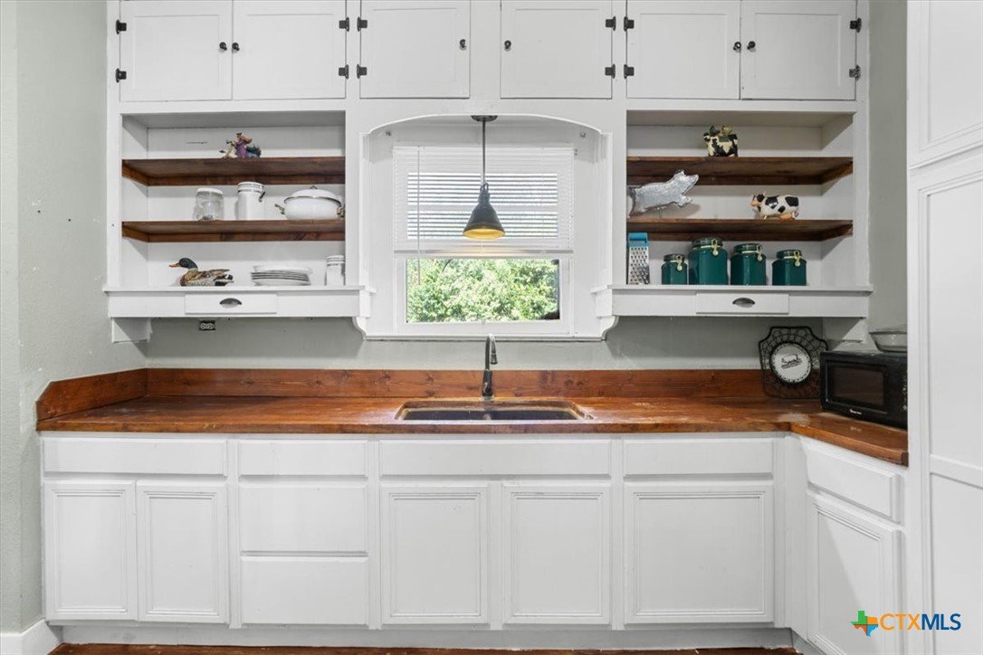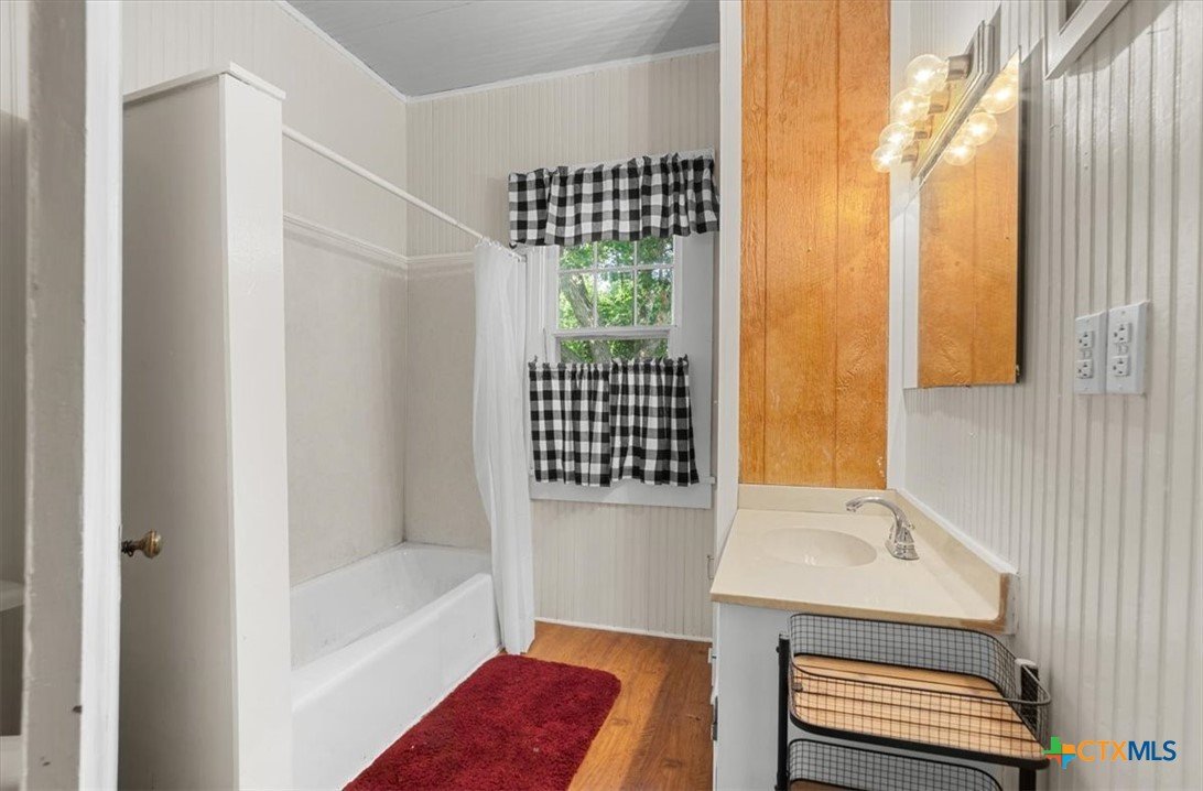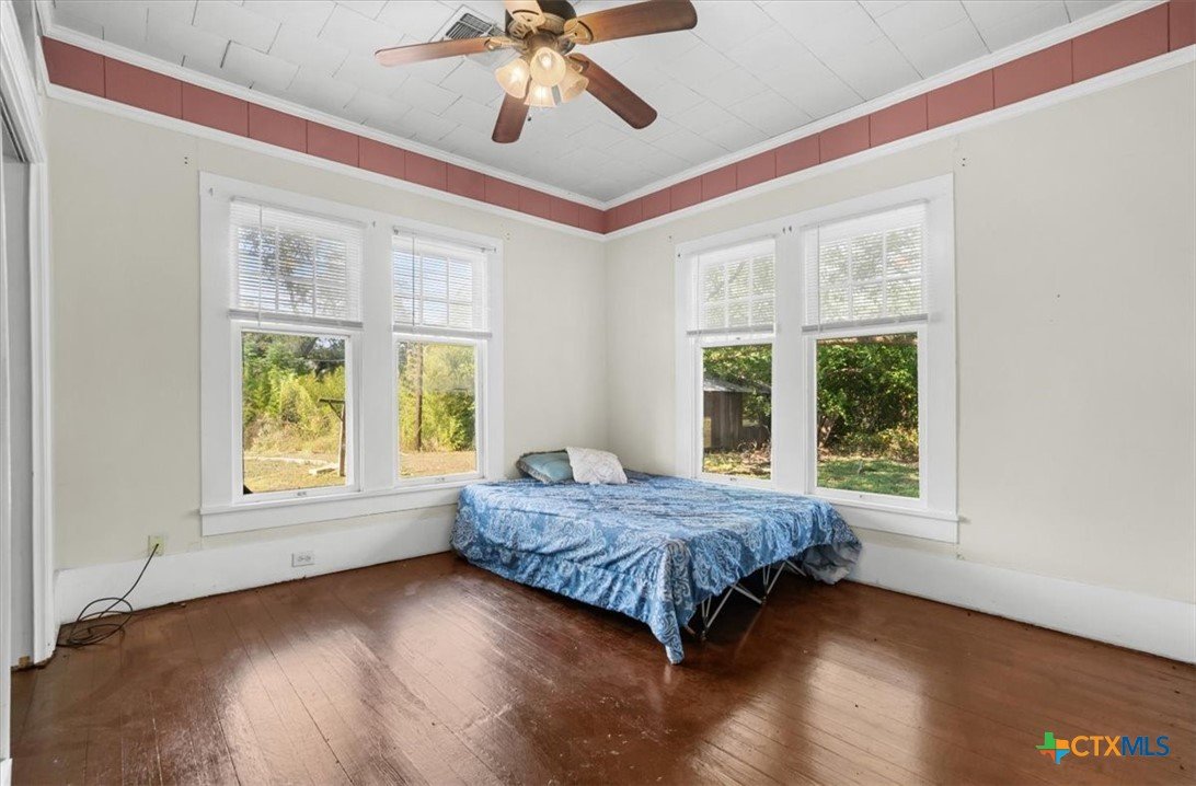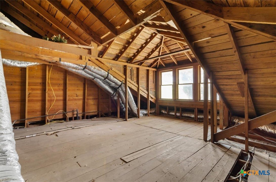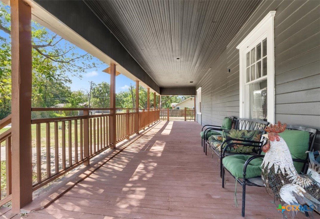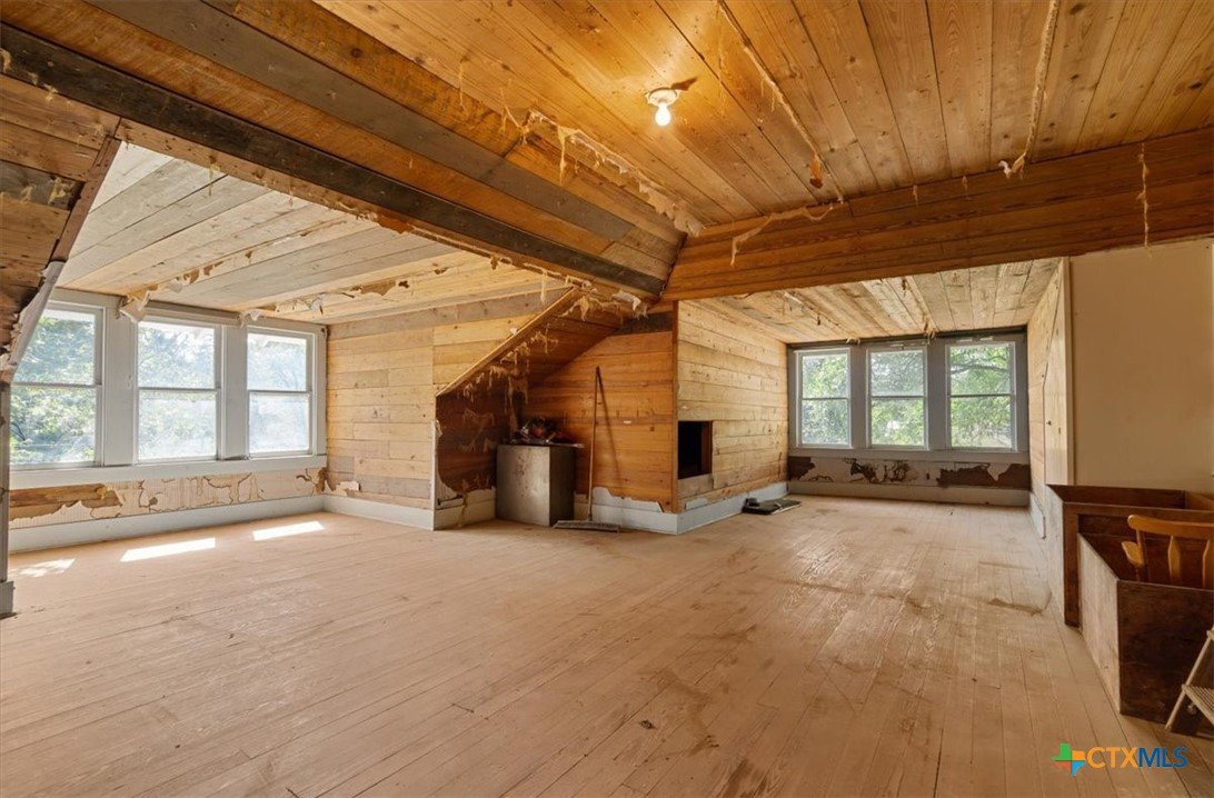 Updated 1930 Farmhouse on corner lot in Barlett, Tx. WRAP-AROUND covered porch on two sides leads to a blend of original and updated finishes. The 2124 SF main floor has gorgeous ORIGINAL WOOD floors, 3 beds + 2 bath + large living and dining. Kitchen has hardwood counters with an unique resin finish; a large window over the sink; a gas stove and refrigerator that stays with house. Beautiful wood CEILING ACCENTS flow from dining room to living room. Original windows throughout. The primary bedroom has private bath with walk-in shower. SECOND LEVEL OPPORTUNITY! Over 1000 Square Feet of partially finished space ready for your creative ideas – additional bedroom/game room/office. LARGE CORNER LOT with tons of potential. Enjoy small town life only 20 minutes from GEORGETOWN!