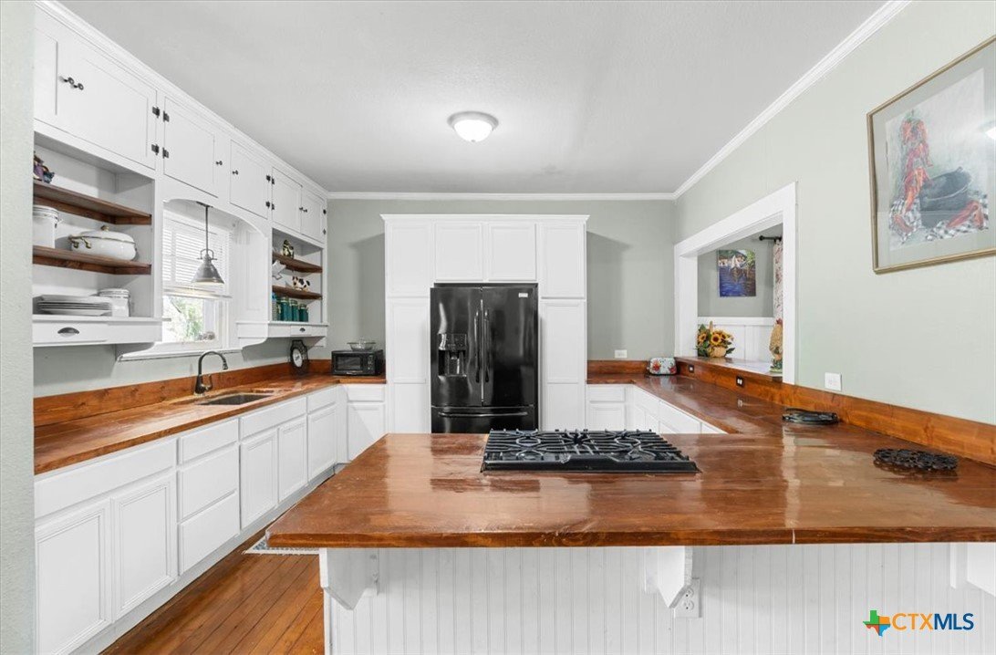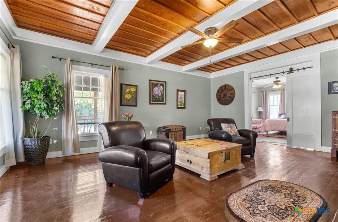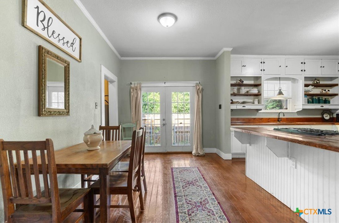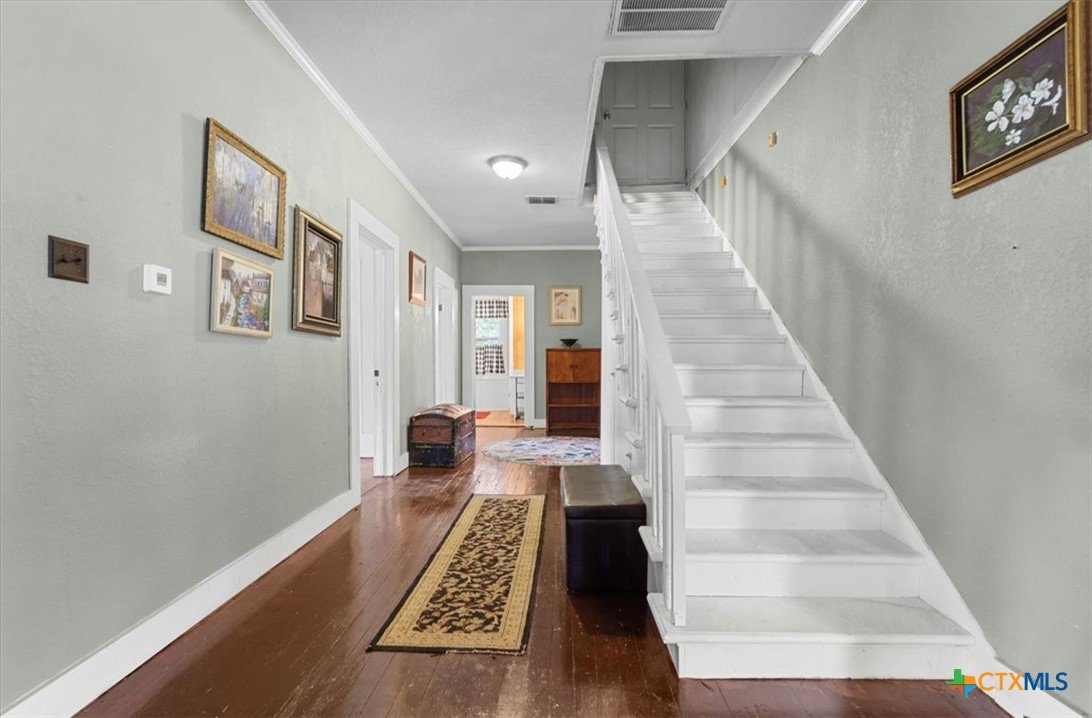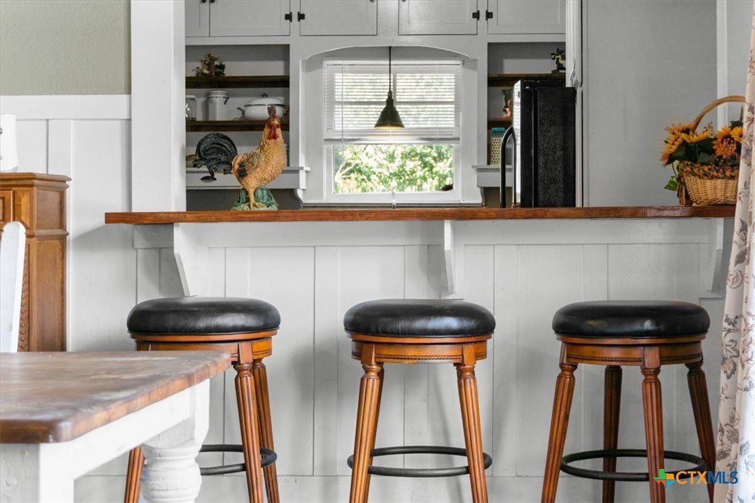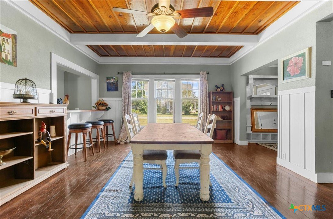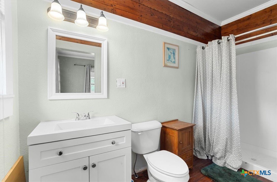 Updated 1930 Farmhouse on corner lot in Barlett, Tx. WRAP-AROUND covered porch on two sides leads to a blend of original and updated finishes. The 2124 SF main floor has gorgeous ORIGINAL WOOD floors, 3 beds + 2 bath + large living and dining. Kitchen has hardwood counters with an unique resin finish; a large window over the sink; a gas stove and refrigerator that stays with house. Beautiful wood CEILING ACCENTS flow from dining room to living room. Original windows throughout. The primary bedroom has private bath with walk-in shower. SECOND LEVEL OPPORTUNITY! Over 1000 Square Feet of partially finished space ready for your creative ideas – additional bedroom/game room/office. LARGE CORNER LOT with tons of potential. Enjoy small town life only 20 minutes from GEORGETOWN!