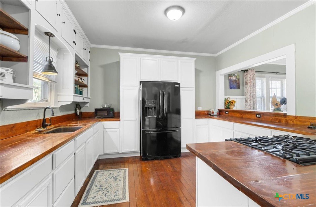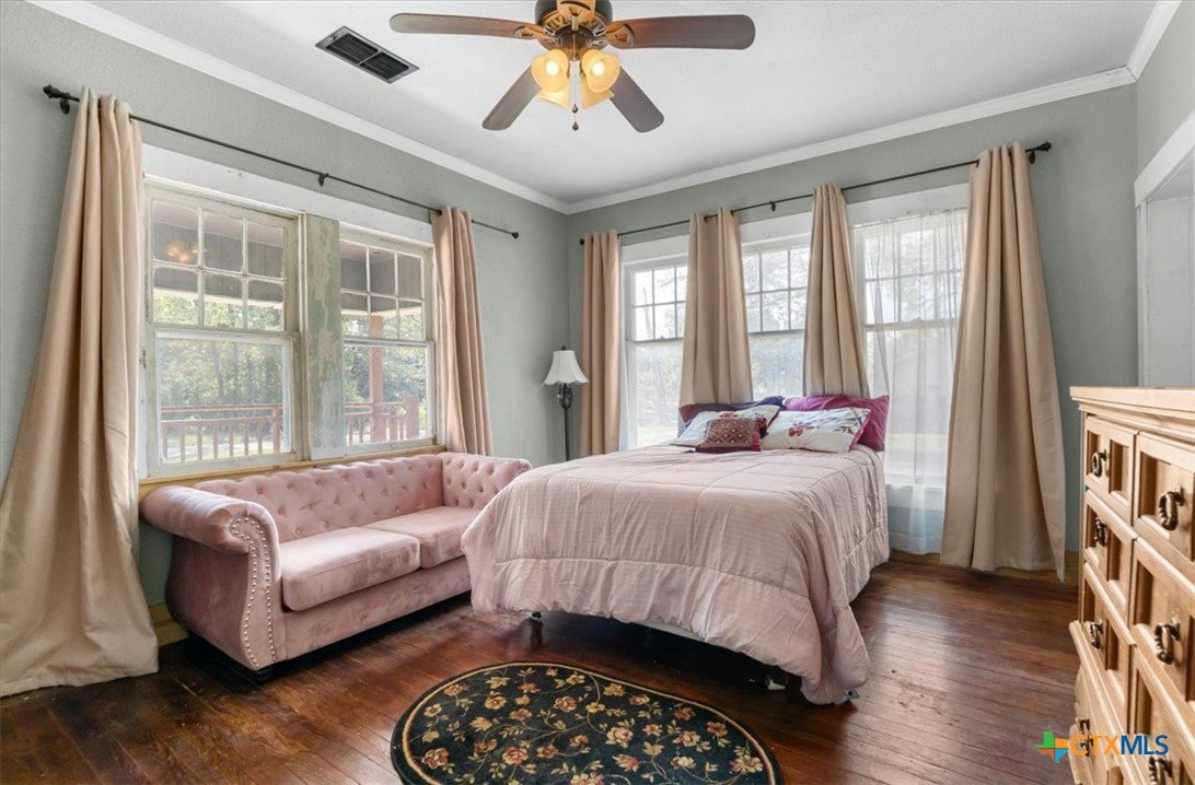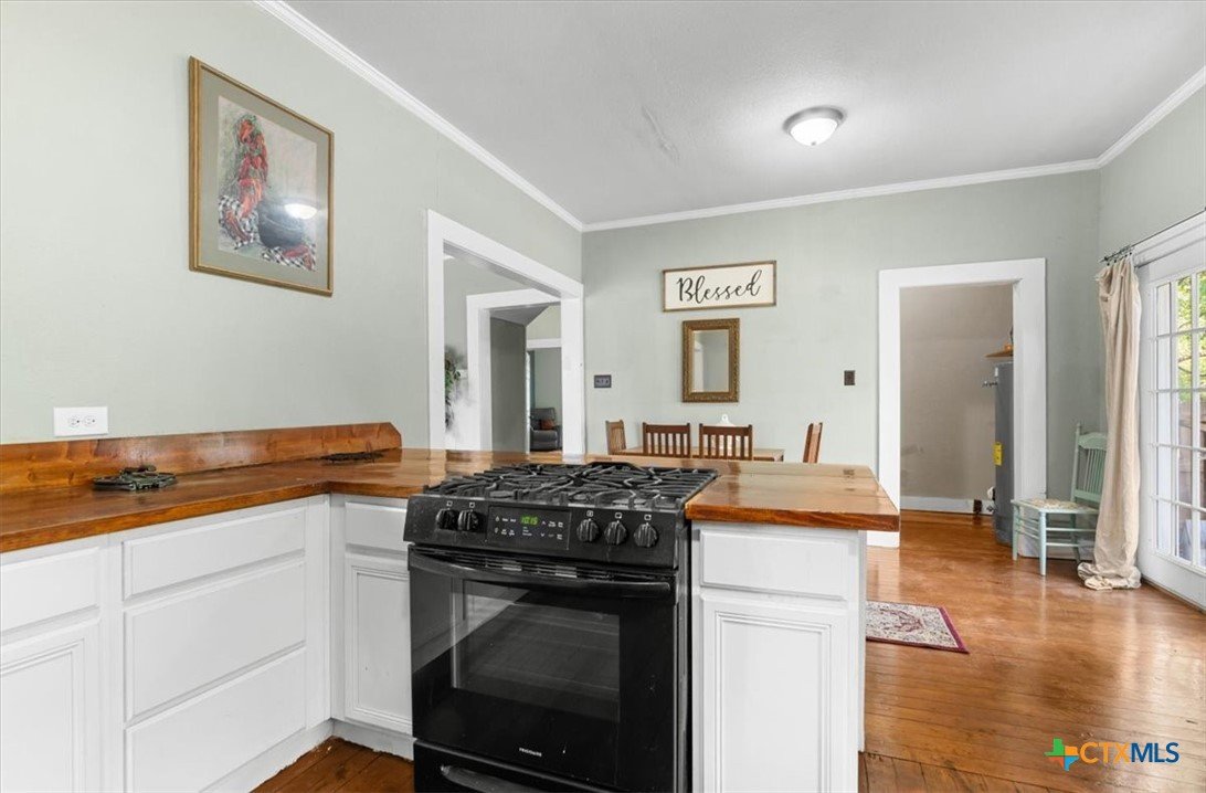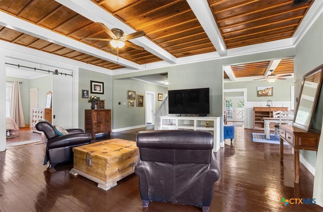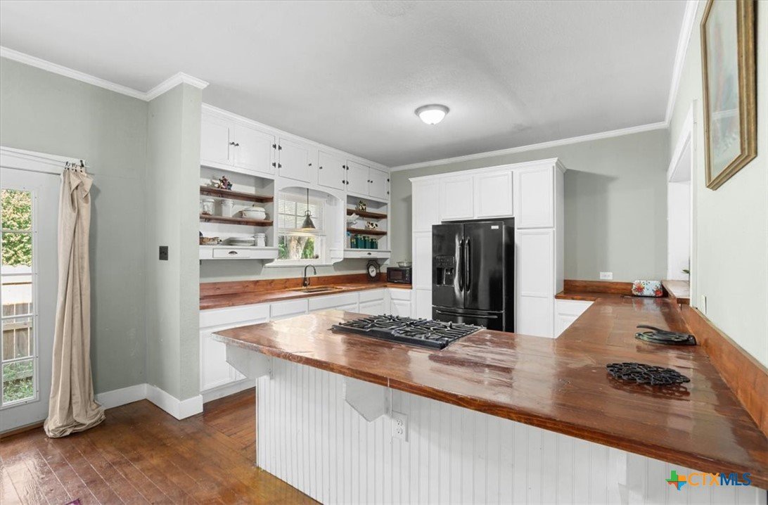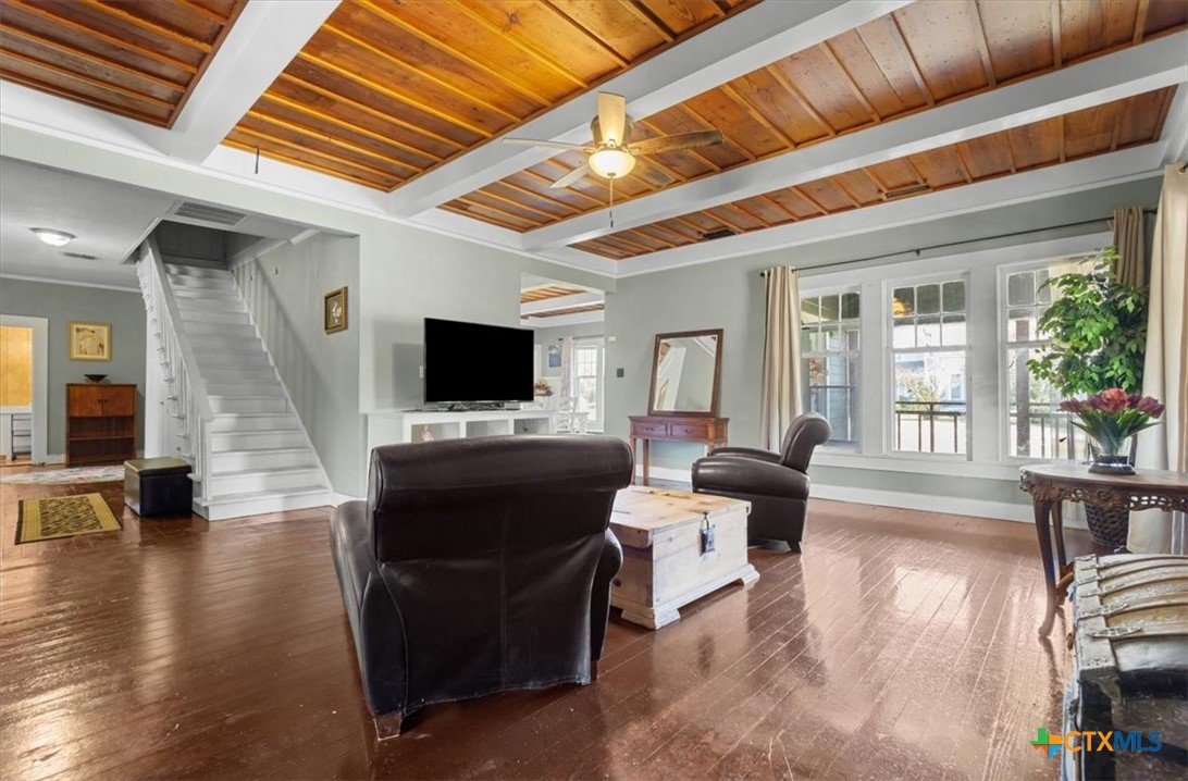 Updated 1930 Farmhouse on corner lot in Barlett, Tx. WRAP-AROUND covered porch on two sides leads to a blend of original and updated finishes. The 2124 SF main floor has gorgeous ORIGINAL WOOD floors, 3 beds + 2 bath + large living and dining. Kitchen has hardwood counters with an unique resin finish; a large window over the sink; a gas stove and refrigerator that stays with house. Beautiful wood CEILING ACCENTS flow from dining room to living room. Original windows throughout. The primary bedroom has private bath with walk-in shower. SECOND LEVEL OPPORTUNITY! Over 1000 Square Feet of partially finished space ready for your creative ideas – additional bedroom/game room/office. LARGE CORNER LOT with tons of potential. Enjoy small town life only 20 minutes from GEORGETOWN!