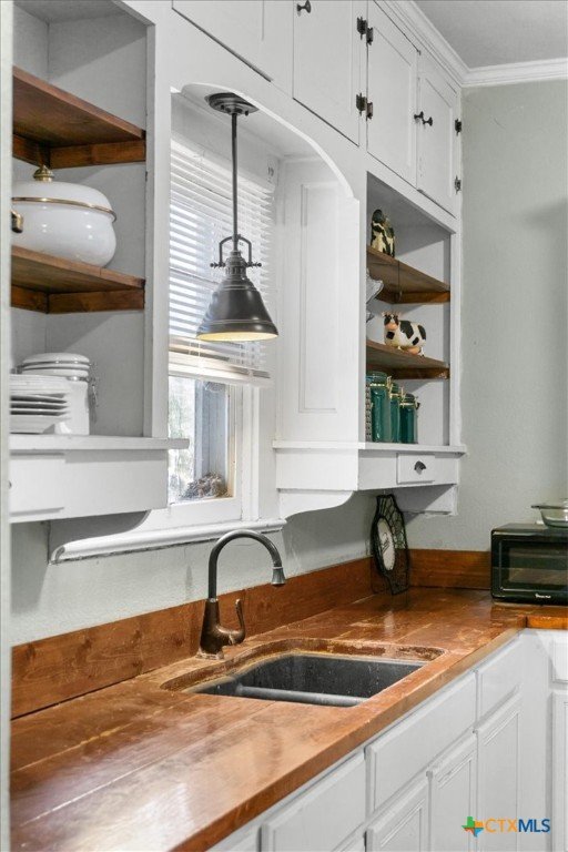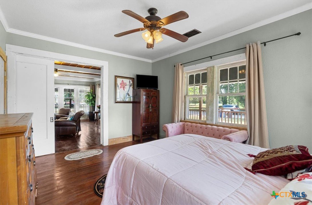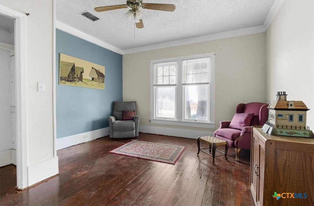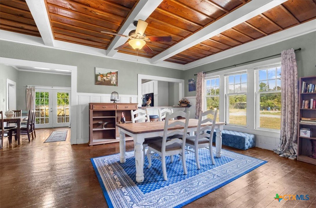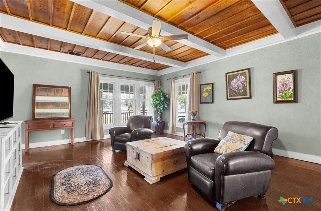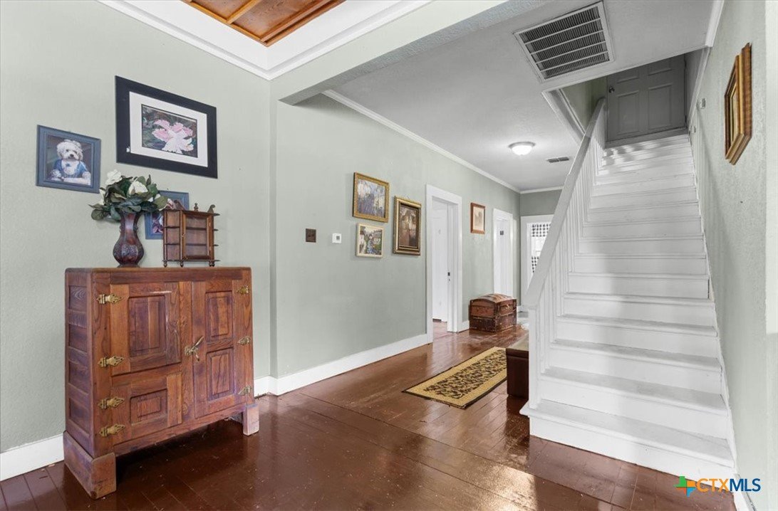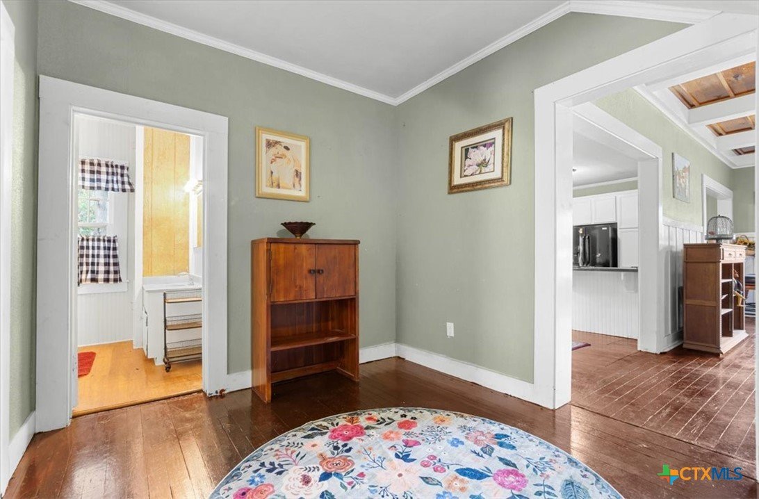 Updated 1930 Farmhouse on corner lot in Barlett, Tx. WRAP-AROUND covered porch on two sides leads to a blend of original and updated finishes. The 2124 SF main floor has gorgeous ORIGINAL WOOD floors, 3 beds + 2 bath + large living and dining. Kitchen has hardwood counters with an unique resin finish; a large window over the sink; a gas stove and refrigerator that stays with house. Beautiful wood CEILING ACCENTS flow from dining room to living room. Original windows throughout. The primary bedroom has private bath with walk-in shower. SECOND LEVEL OPPORTUNITY! Over 1000 Square Feet of partially finished space ready for your creative ideas – additional bedroom/game room/office. LARGE CORNER LOT with tons of potential. Enjoy small town life only 20 minutes from GEORGETOWN!