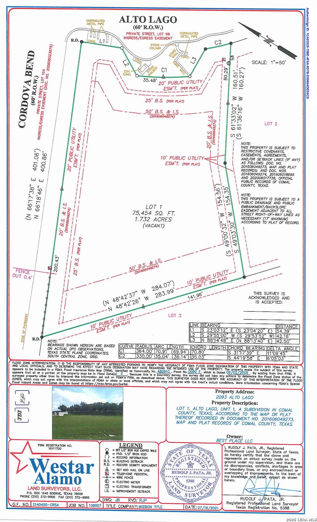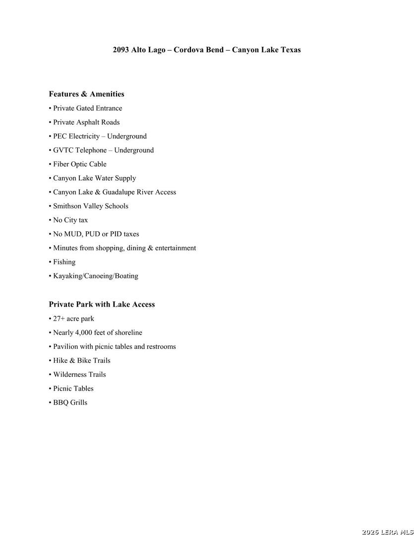 blank canvas. 1) A situation or object in which nothing has yet been planned, so that someone is free to decide what should happen or be done. 2) 2093 Alto Lago. ------- 2093 Alto Lago truly defines a blank canvas. This semi-wooded 1.73 acre lot awaits you to build your dream home, pool, barn, play area and other fun stuff. Various species of trees native to Texas include Mountain Cedar, Post Oak, Live Oak, the colorful Texas Red Oak and Texas Mountain Laurels. Spectacular sunsets are not to be missed from this beautiful tract of land. Take advantage of the natural limestone rock which is perfect to repurpose for landscape. The nature preserve-like surroundings of this neighborhood offer sightings of Texas native wildlife. No city property tax is always a nice benefit. ------- The community boasts numerous features and amenities such as a private resident/guest only access to the 27 acre nature park situated along The Upper Guadalupe River (headwaters to Canyon Lake), BBQ pits, picnic tables, hiking trails and Smithson Valley schools. The Community Pavilion is a great place to have social events. Enjoy no city or MUD tax, fiber optic cable and underground utilities. ------- Alto Lago is a short drive to plenty of shopping, restaurants, entertainment, golf courses, the Guadalupe River and Canyon Lake. An easy commute to New Braunfels, Gruene, San Marcos, Bulverde and San Antonio. ------- Discover privacy, quietness and beauty like no other lot in the gated community of Cordova Bend. Relaxation from the city bustle sets in as you pass drive into Alto Lago. Security, serenity and seclusion best describe the community of Cordova Bend. 2093 Alto Lago - Come splash some color onto this blank canvas with your paint brush of dreams!