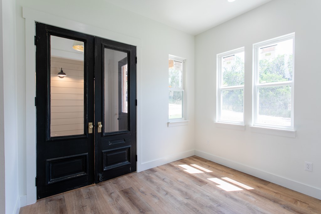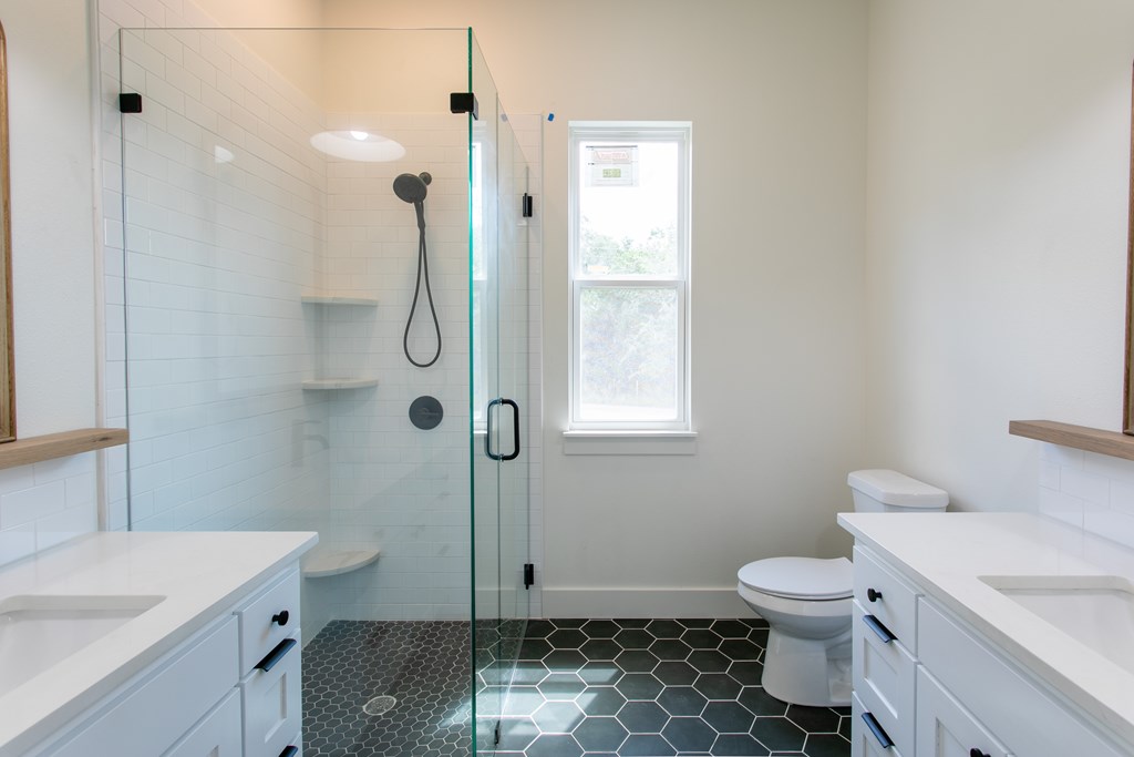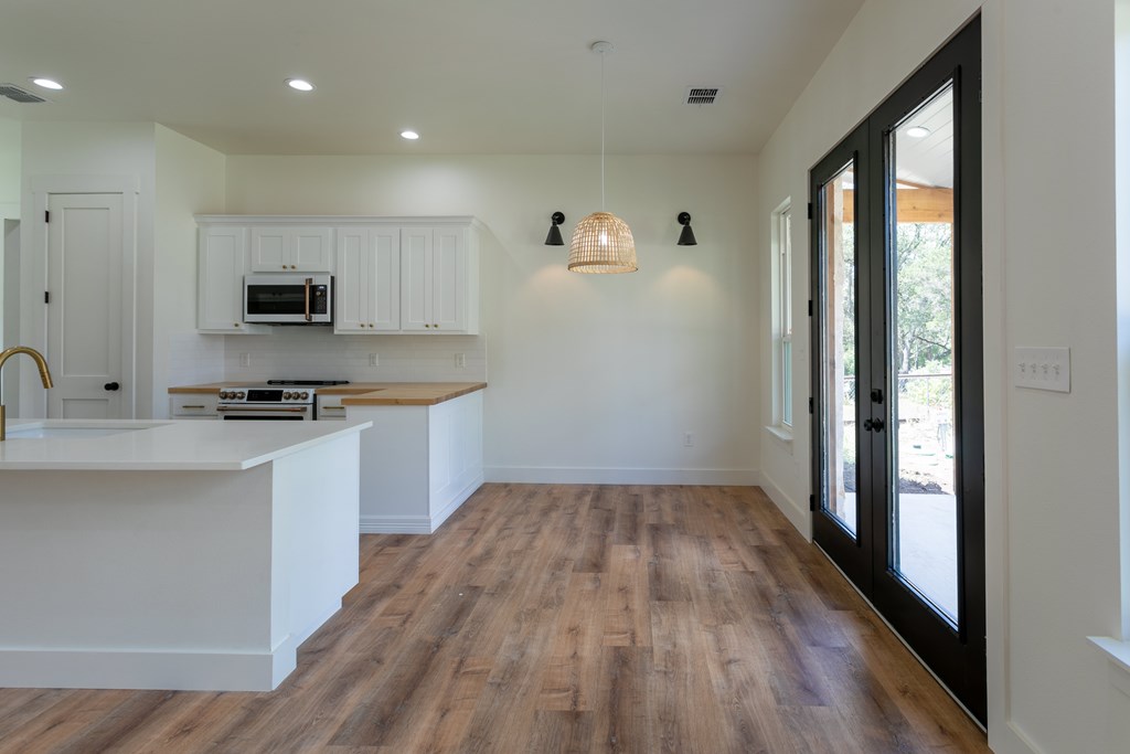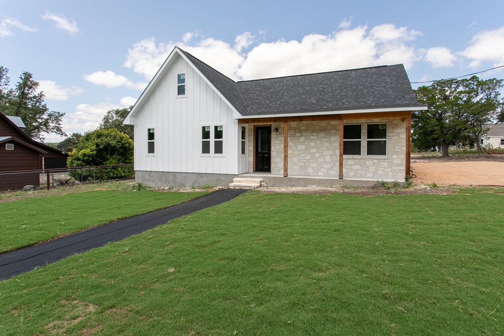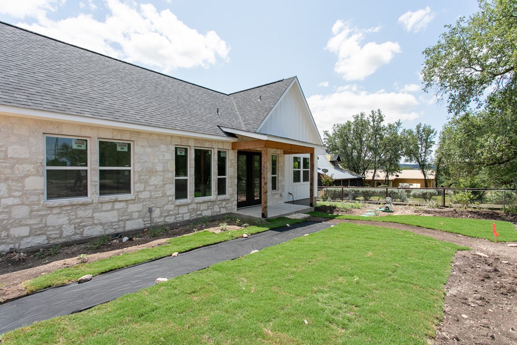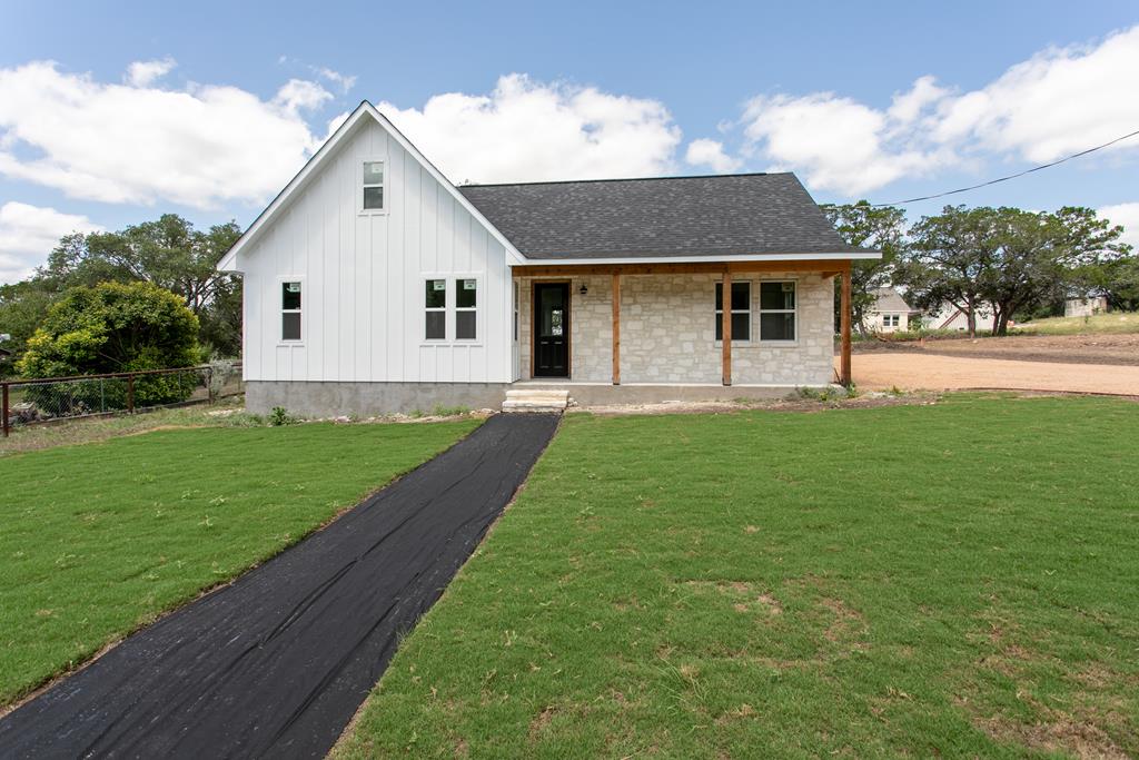 Beautiful new construction situated outside of town with a gorgeous water park giving access to the Guadalupe river. As you enter you will find a shiplap mud room and office space with one of a kind antique doors. This home has an open floor plan with 8ft doors,10ft ceilings and tons of natural light. The kitchen boasts custom cabinetry, GE Cafe appliances, quartz and butcher block countertops giving this a modern farmhouse feel. Gorgeous luxury waterproof vinyl plank flooring throughout living areas and hexagon tiles in bathrooms giving this home some extra character. Split floor plan with spacious master, his and hers closets, spacious bathroom with dual vanity, zero edge shower, hexagon and subway tile for a clean look. Guest bedrooms are spacious with great sized closets. Guest bathroom also boasts custom cabinetry and zero edge shower. Enjoy your morning coffee on the large covered front and back porch. There is ample space in backyard.