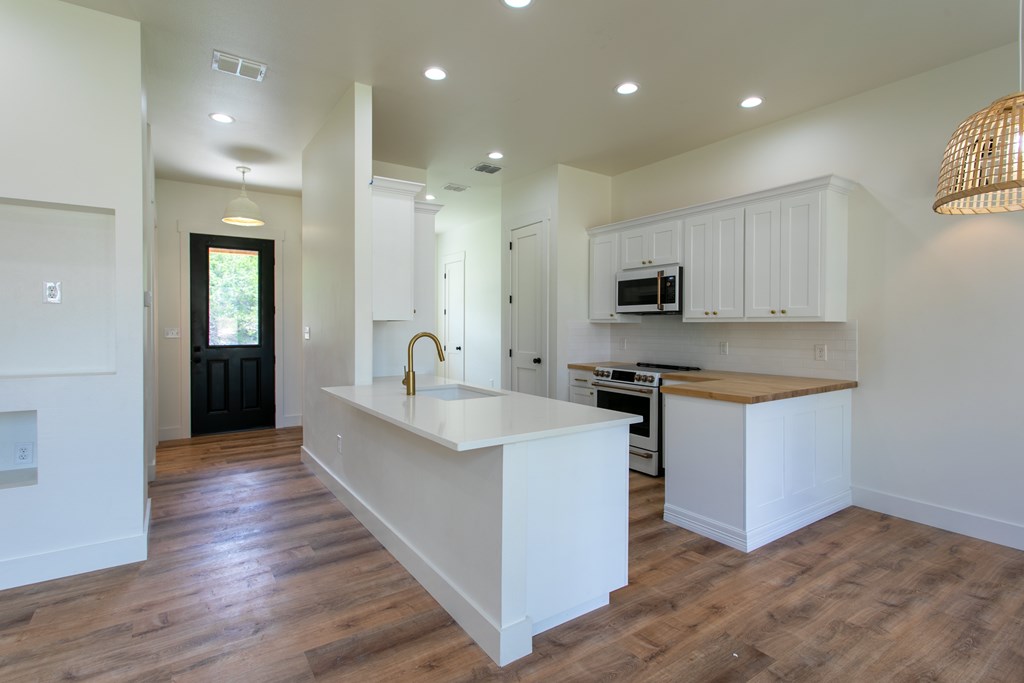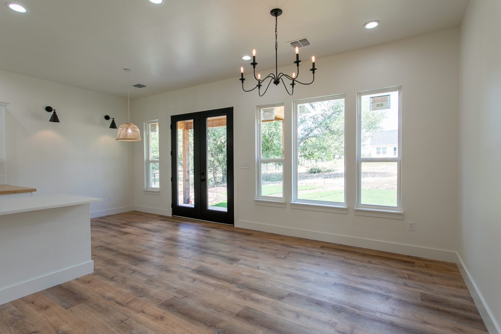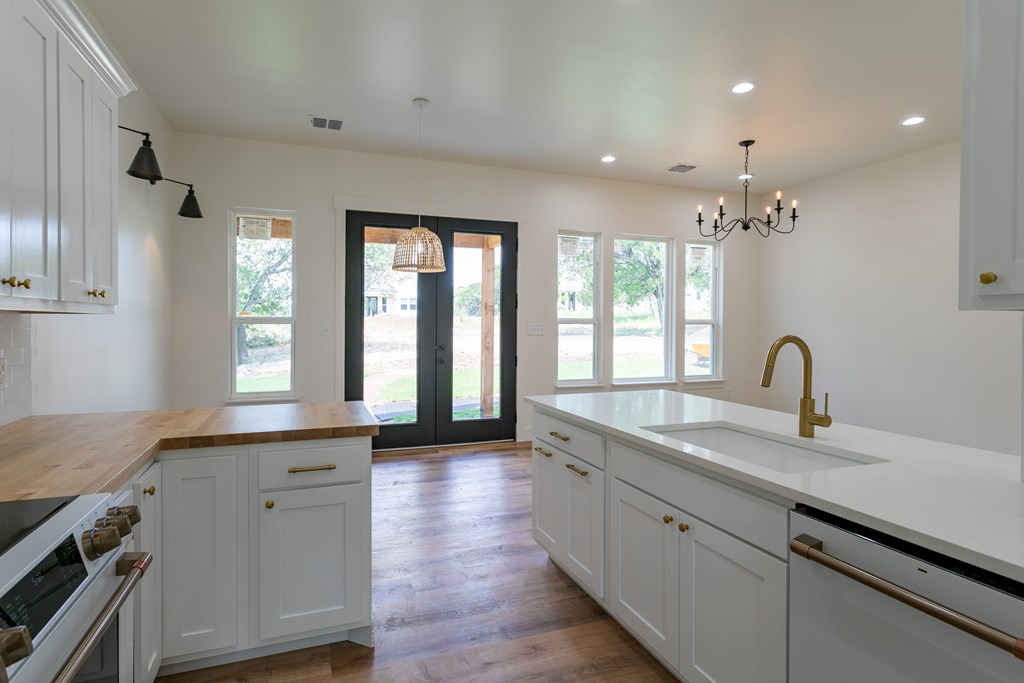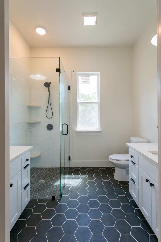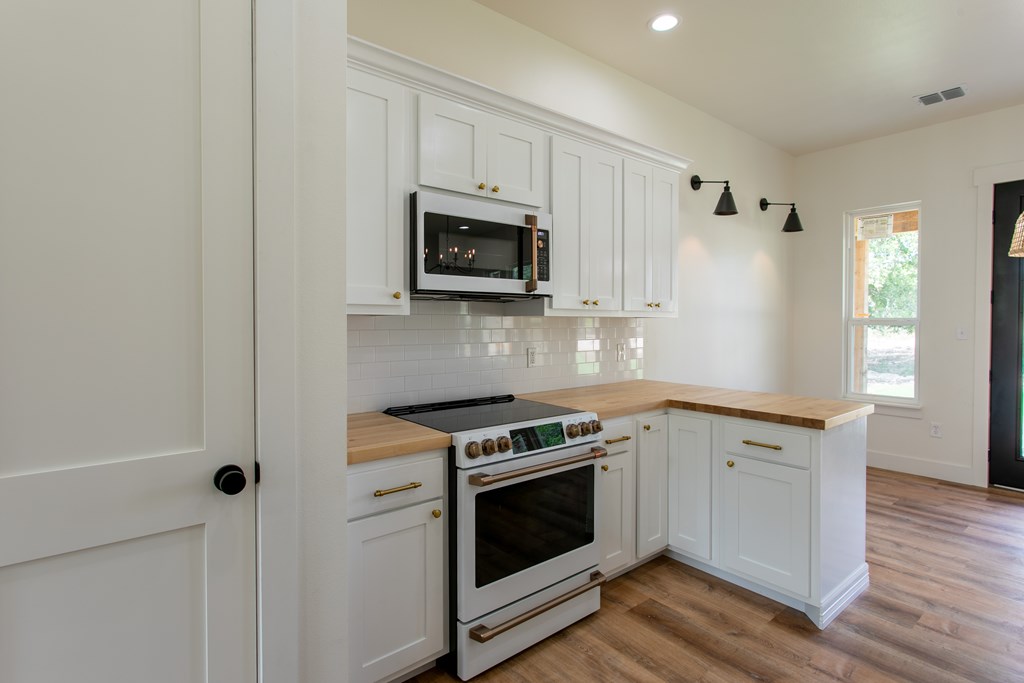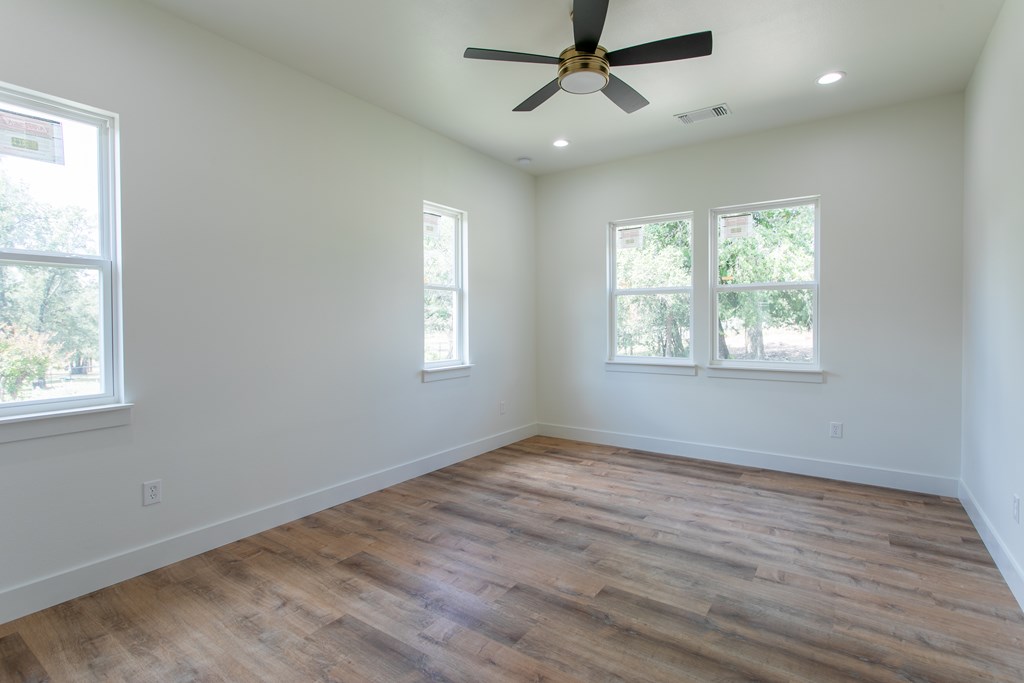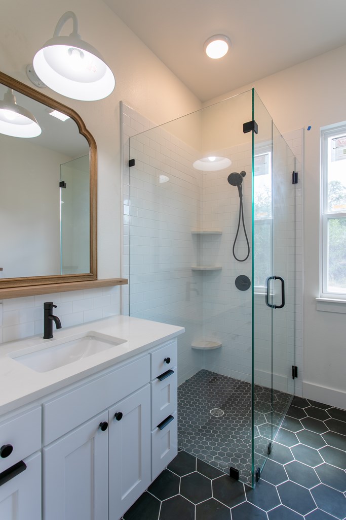 Beautiful new construction situated outside of town with a gorgeous water park giving access to the Guadalupe river. As you enter you will find a shiplap mud room and office space with one of a kind antique doors. This home has an open floor plan with 8ft doors,10ft ceilings and tons of natural light. The kitchen boasts custom cabinetry, GE Cafe appliances, quartz and butcher block countertops giving this a modern farmhouse feel. Gorgeous luxury waterproof vinyl plank flooring throughout living areas and hexagon tiles in bathrooms giving this home some extra character. Split floor plan with spacious master, his and hers closets, spacious bathroom with dual vanity, zero edge shower, hexagon and subway tile for a clean look. Guest bedrooms are spacious with great sized closets. Guest bathroom also boasts custom cabinetry and zero edge shower. Enjoy your morning coffee on the large covered front and back porch. There is ample space in backyard.
