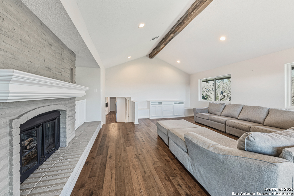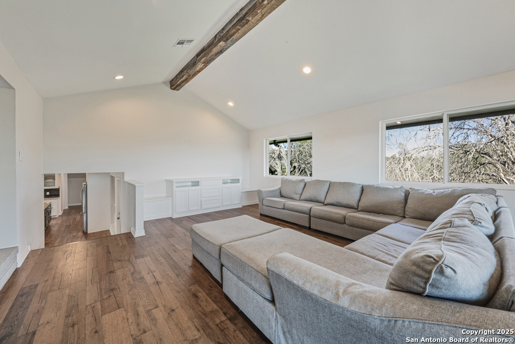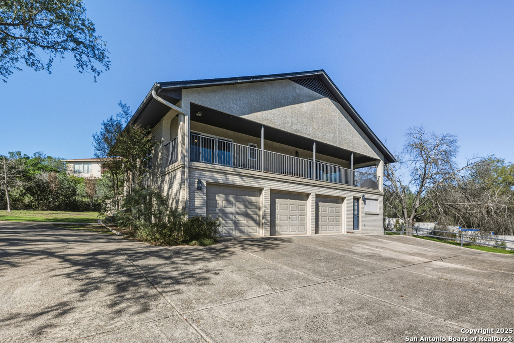 With half an acre on "The Hill", you will have some elbow room as well as a view. This 4 bedroom 3 bath home was originally built in 1979 but has been thoughtfully updated. The split level floorplan creates plenty of space that can offer versatility in living and entertaining. Step through the sliding glass doors to enjoy your city view from the large covered balcony that extends the whole side of the house from the family room to the owner's suite. The main level has flex space when you enter, bringing you into the kitchen with oversized granite island, stainless steel appliances, double ovens and faux wooden beam. The main level also offers two more bedrooms, bathroom, laundry and make sure to check out the cedar closet! Head down from the main level a few stairs and you will find another bedroom, bathroom, and sauna. The room also offers an exterior entrance that could be ideal for certain situations. Wood floors, gas fireplace, covered back patio with 10 seat hot tub, 3 car side entry garage and circle driveway are just a few more features this charmer has to offer. No HOA, NBISD, and close to all New Braunfels has to offer!
