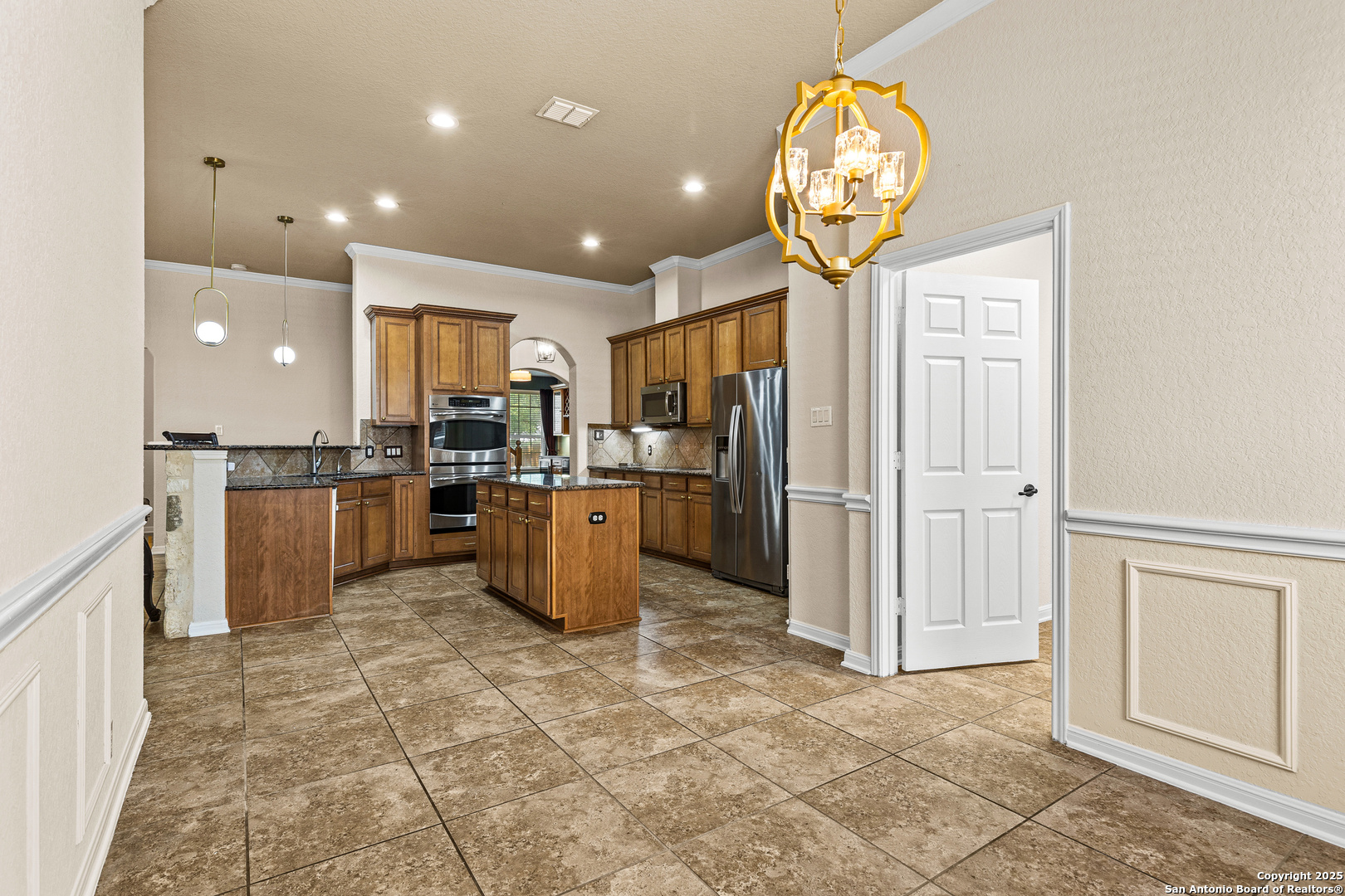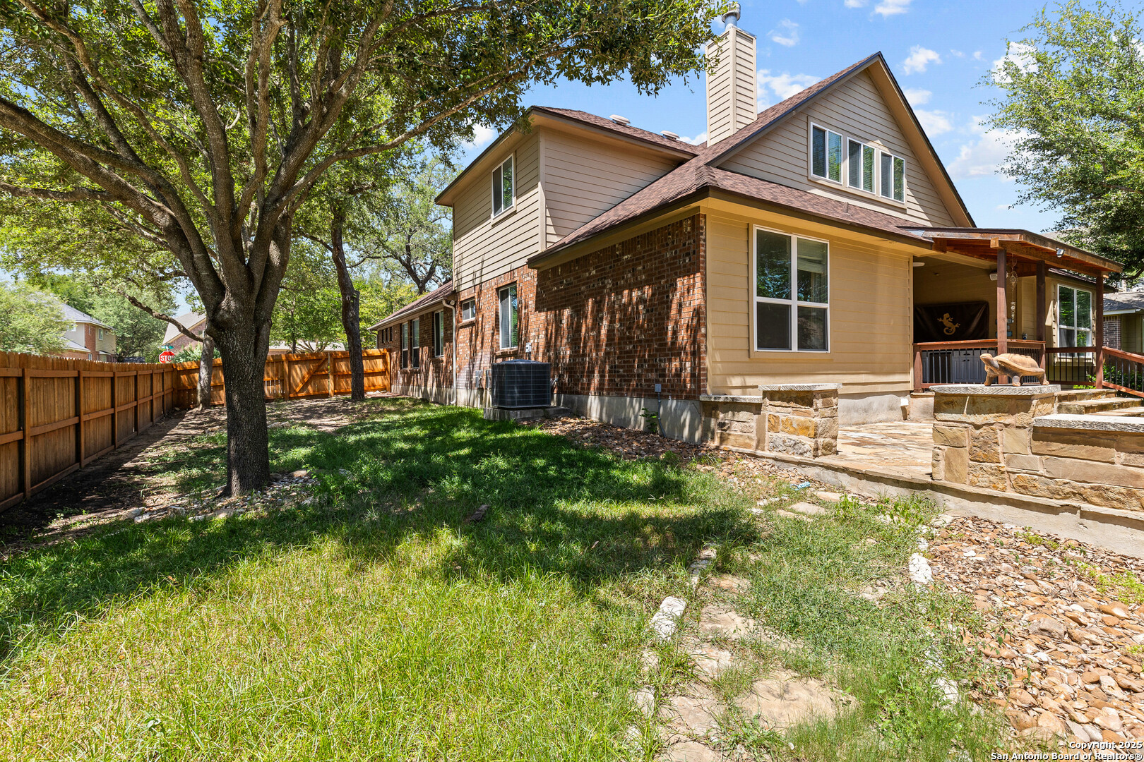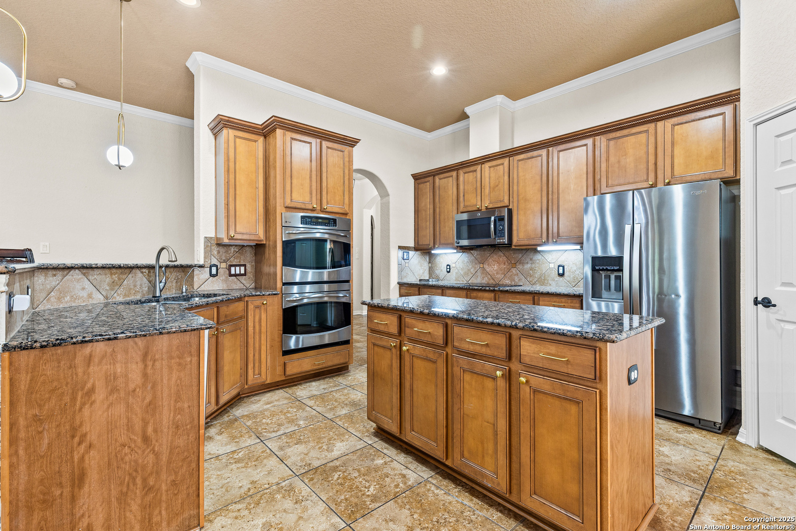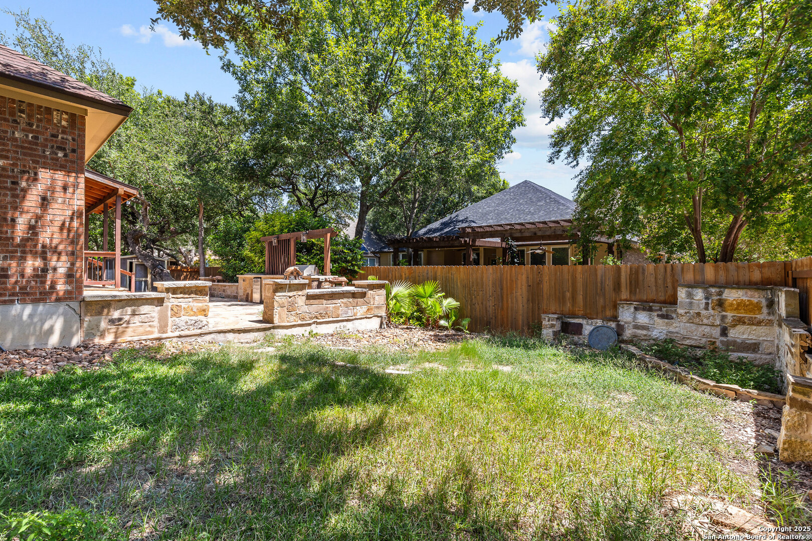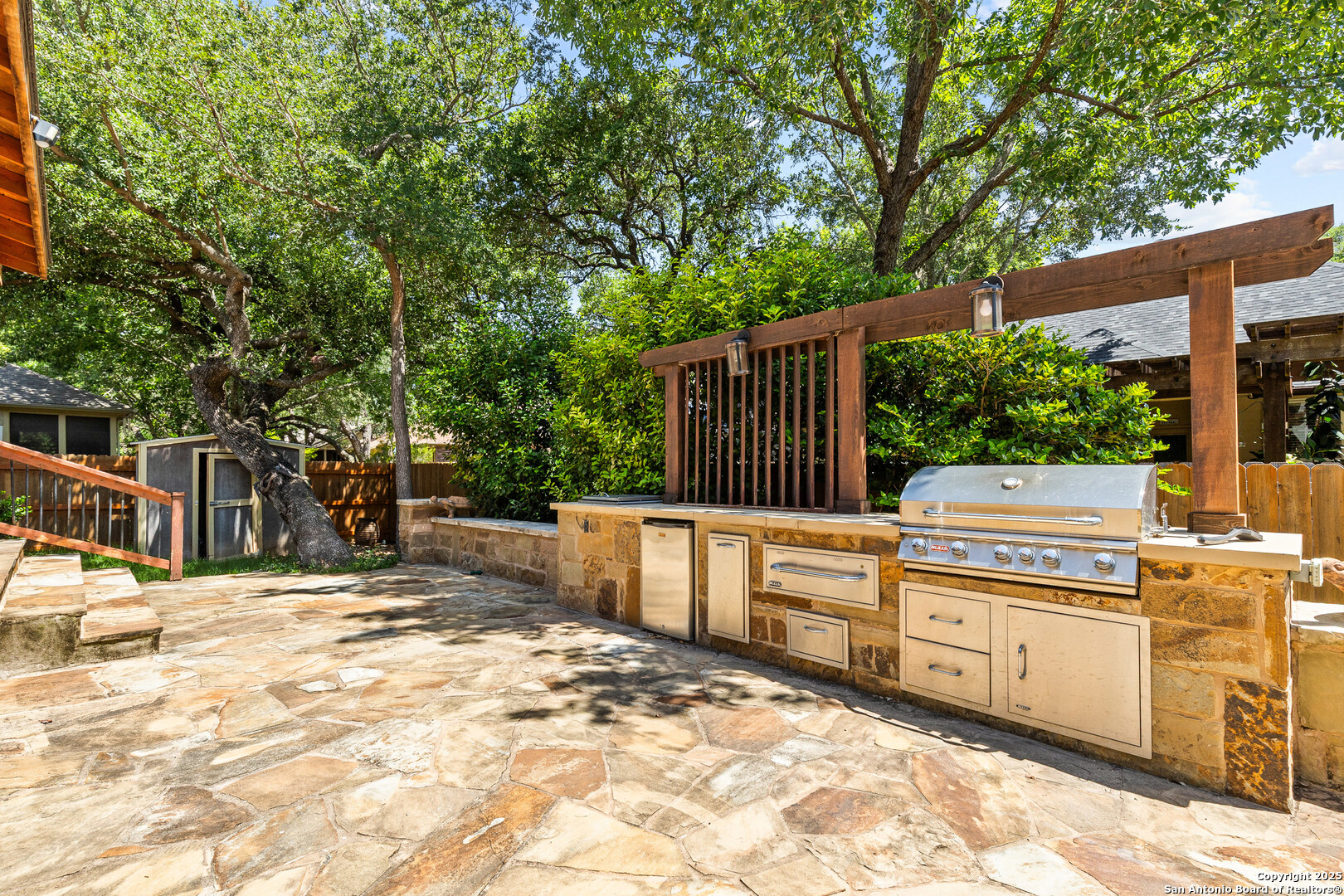 Your Private Oasis Awaits in a Secluded Enclave! Enclave at Riata Oaks! Welcome home to unparalleled privacy and luxury within a charming, secluded subdivision of just 54 homes! With 5 bedrooms, 4 full baths, and a 3-car garage, this home effortlessly combines elegance, comfort, and functionality.This magnificent 1.5-story residence offers everything you could desire and more, perfectly situated on a desirable corner lot with mature trees providing ample shade and beauty. Step inside through custom iron doors to discover a spacious and thoughtfully designed layout. The main level boasts four generously sized bedrooms, including a convenient guest suite with its own ensuite bathroom - perfect for visitors. You'll also find a dedicated office, featuring a matching custom iron door, ideal for remote work or quiet study. Meal times will be a delight, whether you're enjoying a casual bite in the charming breakfast nook or hosting elegant dinners in the separate formal dining room, complete with two built-in wine refrigerators - perfect for the discerning host! Kitchen boasts an island and Double Ovens. The heart of the home, the living room, is an entertainer's dream, wired for 7.2 surround sound with in-ceiling speakers to create an immersive audio experience. Cozy up by the elegant fireplace on cooler evenings. Upstairs, a massive media room awaits, complete with surround sound speakers - the ultimate space for movie nights or gaming marathons. 5th BR is off of media room with a large walk-in closet and a full bath upstairs. Ideal for multi family or a teen. Wood shutters and crown molding throughout. Outside, your private retreat continues! The expansive flagstone covered patio is home to a fantastic outdoor kitchen, ready for al fresco dining and entertaining. An accompanying deck offers additional space for relaxation and enjoyment of your beautifully landscaped yard. Practical updates include a roof and fence that are both only 3 years old, providing peace of mind for years to come. And the location couldn't be better! Enjoy the convenience of being just 5 minutes from a variety of shopping and dining options, as well as a local park. Plus, you're only 6 miles from Joint Base Randolph and benefit from quick access to major highways, making commutes a breeze. Zoned for sought after Schertz-Cibolo-Universal City ISD, with bus service.