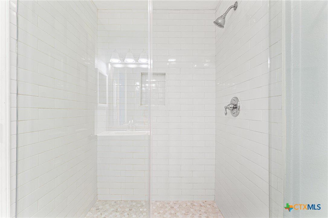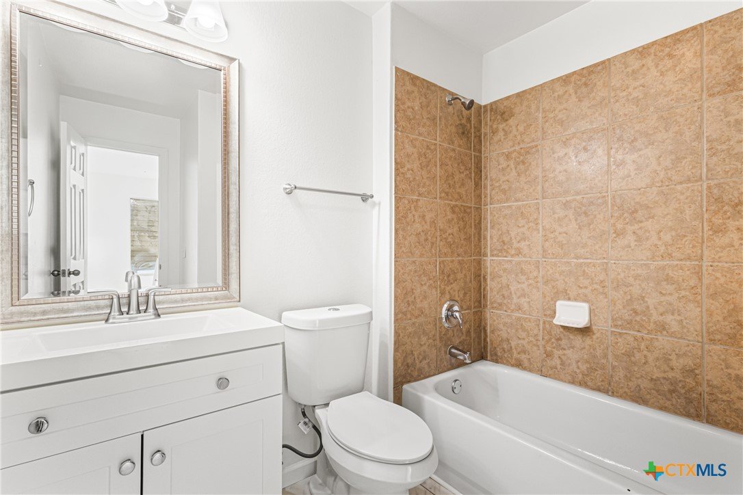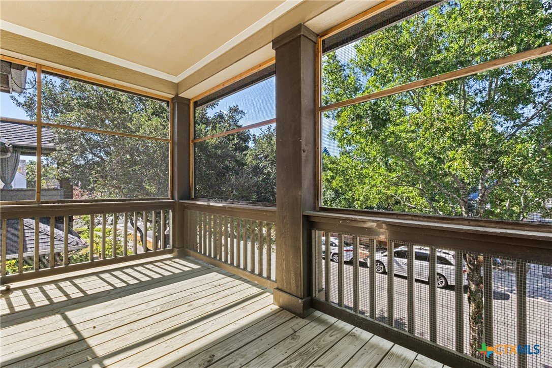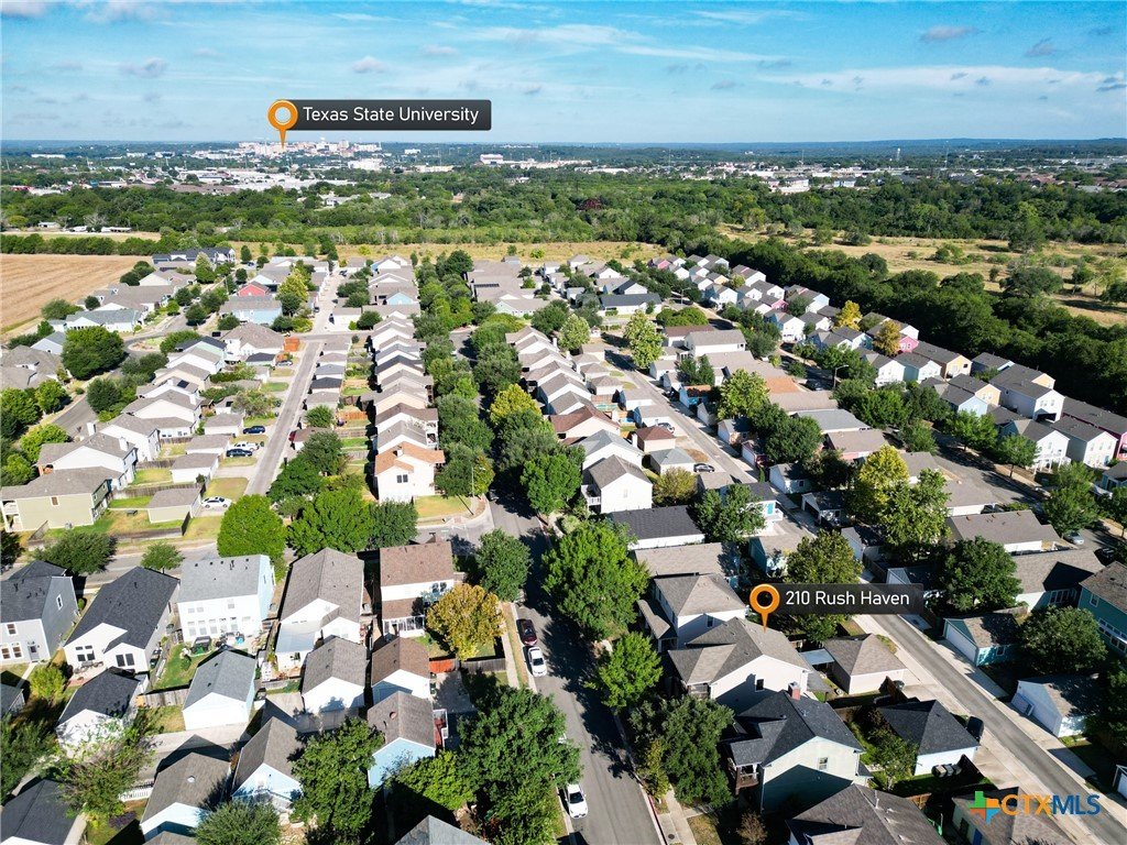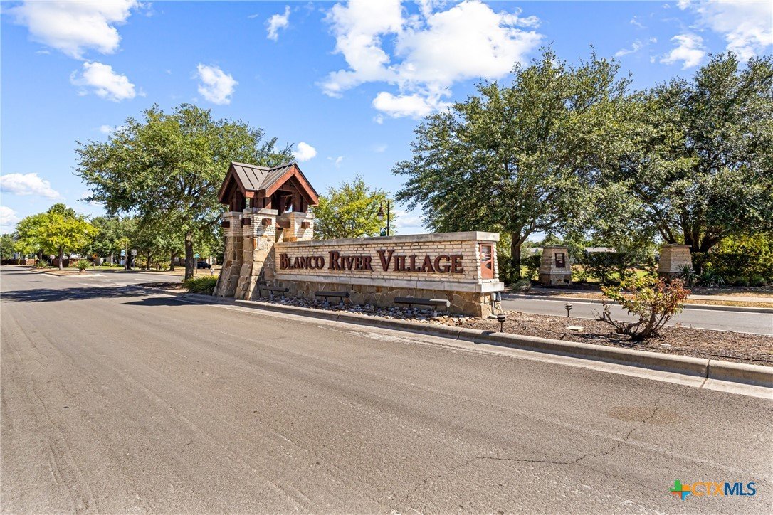 Welcome to this charming two-story home in the tree-lined community of Blanco River Village! A mature shade tree and inviting wrap-around porch create a welcoming spot to relax in this tranquil neighborhood. Inside, the main level boasts high ceilings, an eat-in kitchen with a breakfast bar, a dedicated dining area, and a cozy living room centered around a gas fireplace. A versatile flex space on this floor is perfect for a home office. Upstairs, the spacious primary suite features a private ensuite bathroom and access to an oversized balcony-ideal for enjoying morning coffee. Two additional bedrooms and a full bath complete the upper level. Outside, a fully fenced private backyard leads to a detached two-car garage. The home's location can't be beaten-just minutes from Texas State University and mere steps from a neighborhood park and playground, access to Blanco River, shopping and restaurants. Roof (main home and detached garage), HVAC, all bathrooms, interior/exterior paint, flooring (2022); Stove/range, dishwasher, vent hood, blinds in guest rooms (2023).
