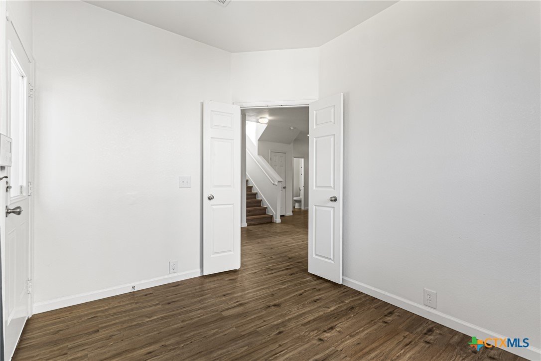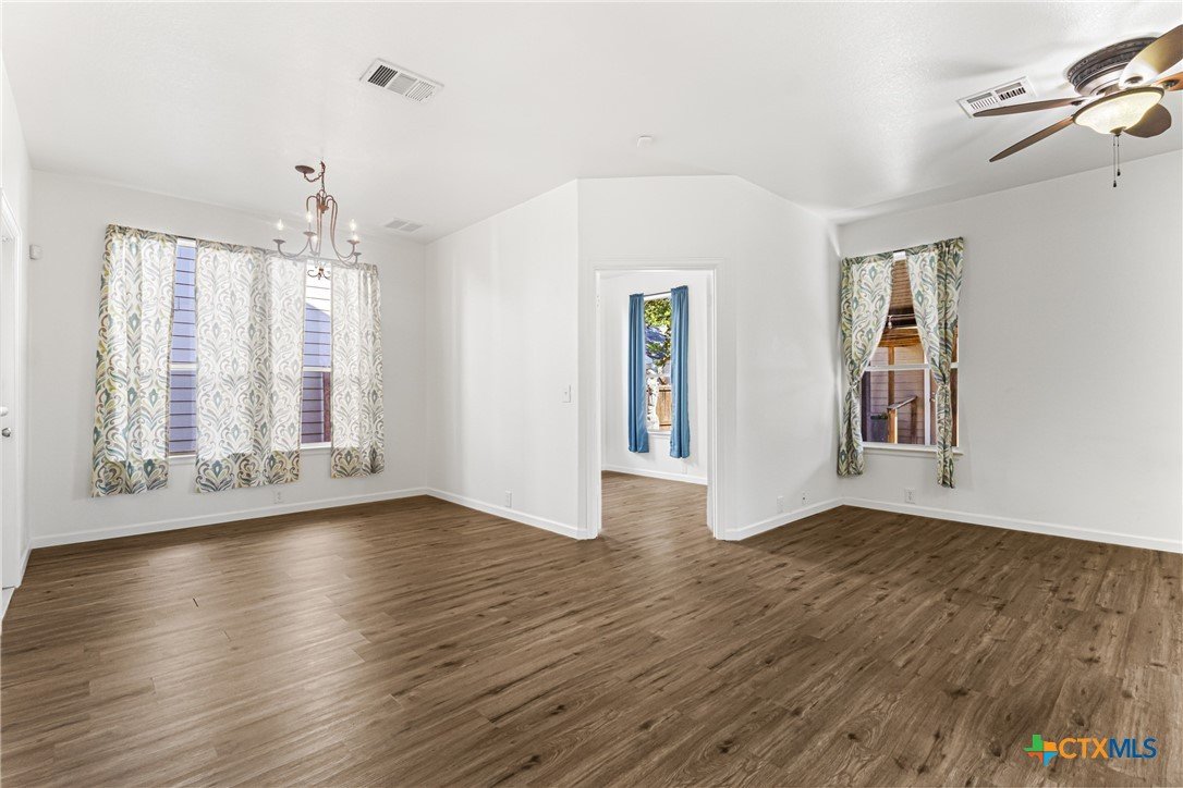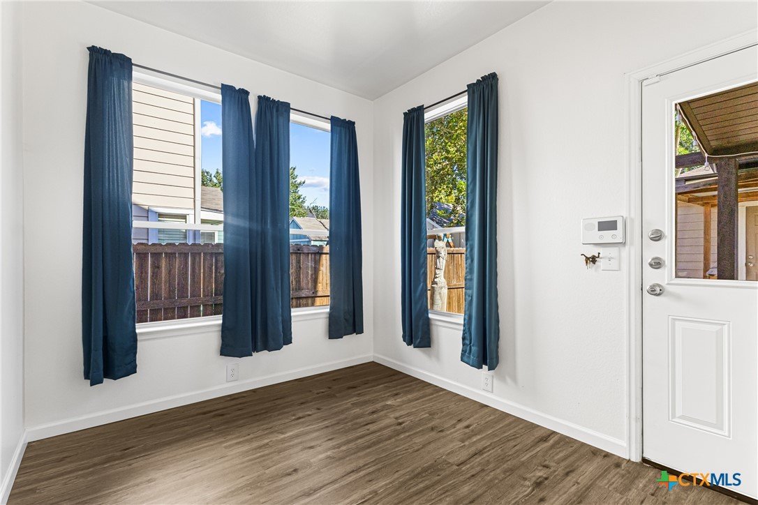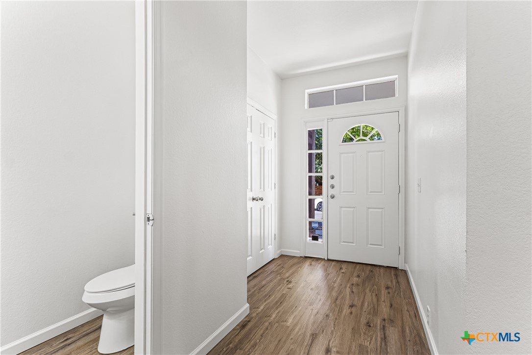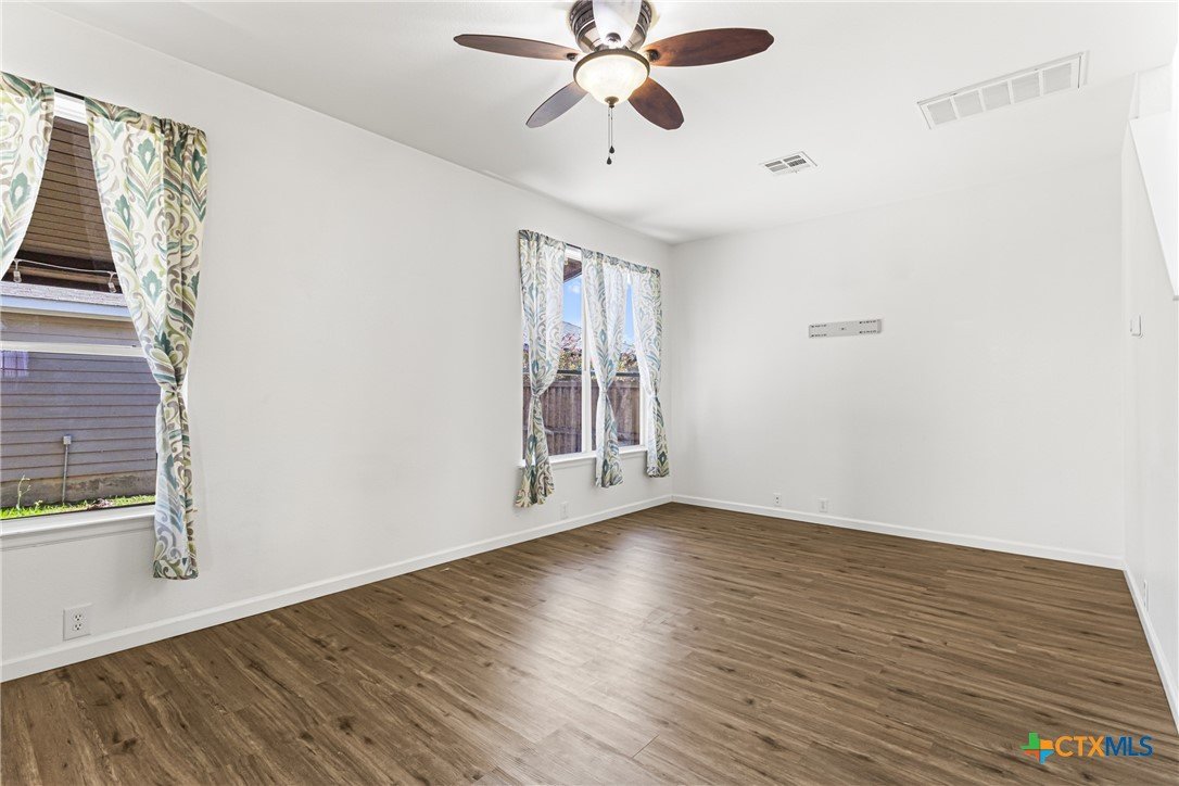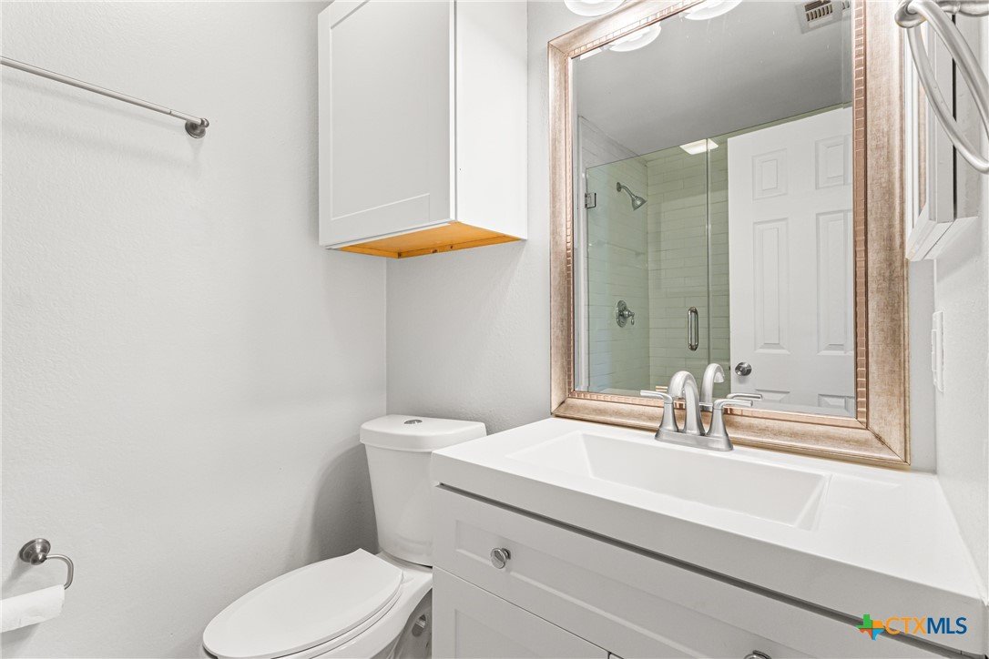 Welcome to this charming two-story home in the tree-lined community of Blanco River Village! A mature shade tree and inviting wrap-around porch create a welcoming spot to relax in this tranquil neighborhood. Inside, the main level boasts high ceilings, an eat-in kitchen with a breakfast bar, a dedicated dining area, and a cozy living room centered around a gas fireplace. A versatile flex space on this floor is perfect for a home office. Upstairs, the spacious primary suite features a private ensuite bathroom and access to an oversized balcony-ideal for enjoying morning coffee. Two additional bedrooms and a full bath complete the upper level. Outside, a fully fenced private backyard leads to a detached two-car garage. The home's location can't be beaten-just minutes from Texas State University and mere steps from a neighborhood park and playground, access to Blanco River, shopping and restaurants. Roof (main home and detached garage), HVAC, all bathrooms, interior/exterior paint, flooring (2022); Stove/range, dishwasher, vent hood, blinds in guest rooms (2023).
