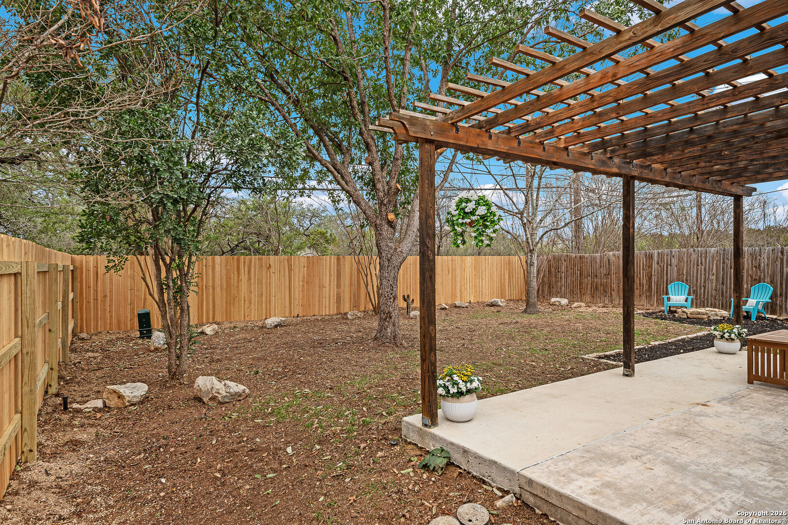 Move-in ready and filled with thoughtful updates, this beautifully maintained home is located in the desirable Summit at Bulverde Creek, within the highly acclaimed North East Independent School District. The flexible floor plan includes a formal dining room that easily functions as a home office or flex space, while the spacious family room flows seamlessly into the kitchen, breakfast bar, and nook with a gracious pantry-ideal for both everyday living and entertaining. Split bedrooms provide added privacy and comfort. One of the home's standout features is its exceptional privacy. Situated on a quiet dead-end street, the property backs to a greenbelt with no homes behind, creating a peaceful and secluded setting. Beyond the greenbelt lies non-profit-owned property, and the road the home sits on dead ends to the walking trail leading to the middle school, offering privacy without sacrificing convenience. The backyard is a true WOW-factor outdoor retreat, perfect for relaxing or entertaining. Enjoy a new privacy fence, custom wood pergola, extended 18x10 slab patio, and a large firepit seating area-ideal for evenings under the Texas sky. Additionally, the front covered patio is great for drinking coffee and watching the sunrise. Recent upgrades include new granite countertops, top-to-bottom fresh interior paint, upgraded lighting, newer tile, newer HVAC, newer water heater, and new luxury vinyl plank flooring throughout. The washer, dryer, and refrigerator convey, making this home truly turn-key. Conveniently located within walking distance to NEISD elementary and middle schools, and just minutes from Stone Oak and Bulverde Road shopping, dining, and entertainment, including H-E-B, Target, popular restaurants, and easy access to major commuter routes. This home offers the perfect blend of privacy, comfort, and location-a rare find in today's market.