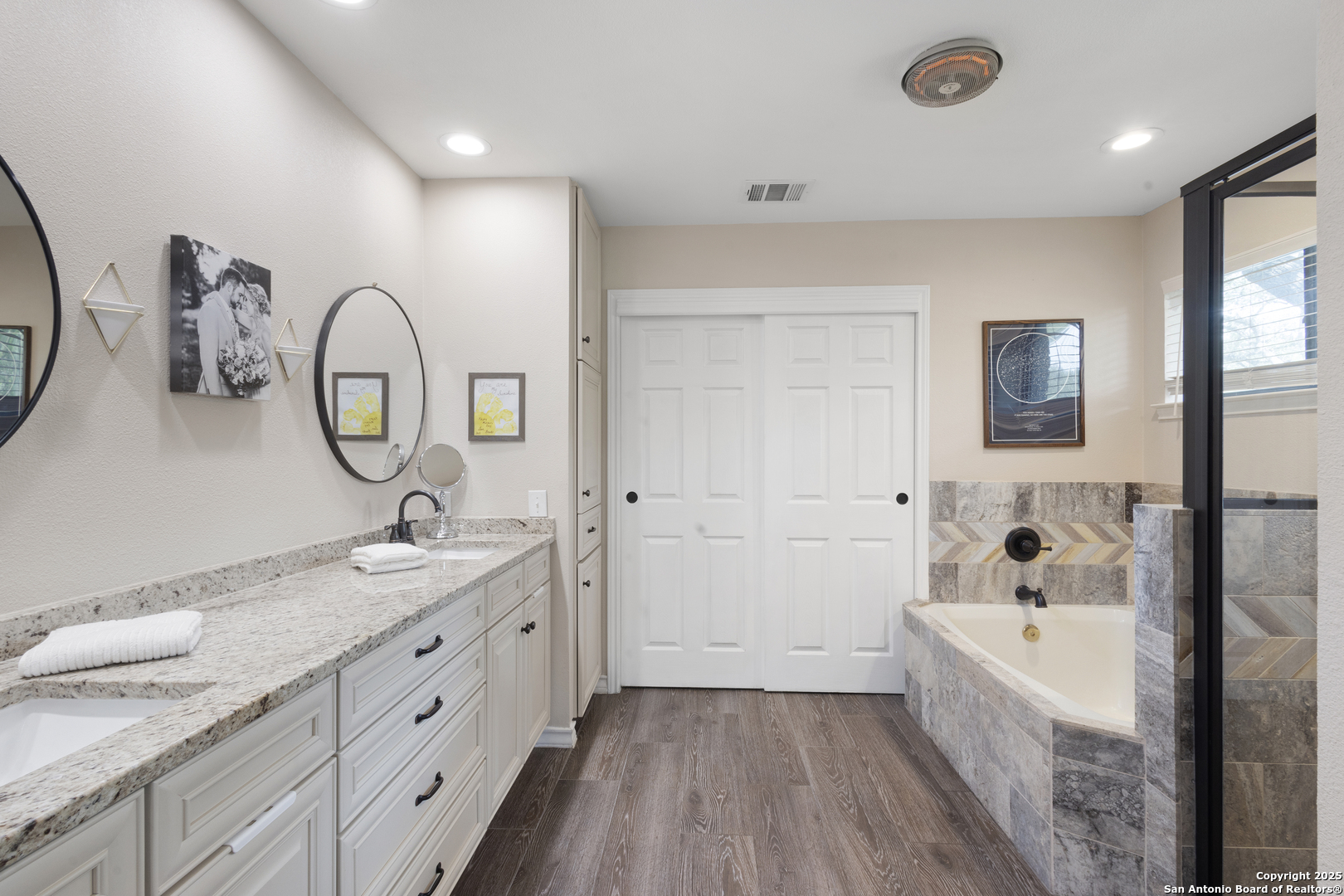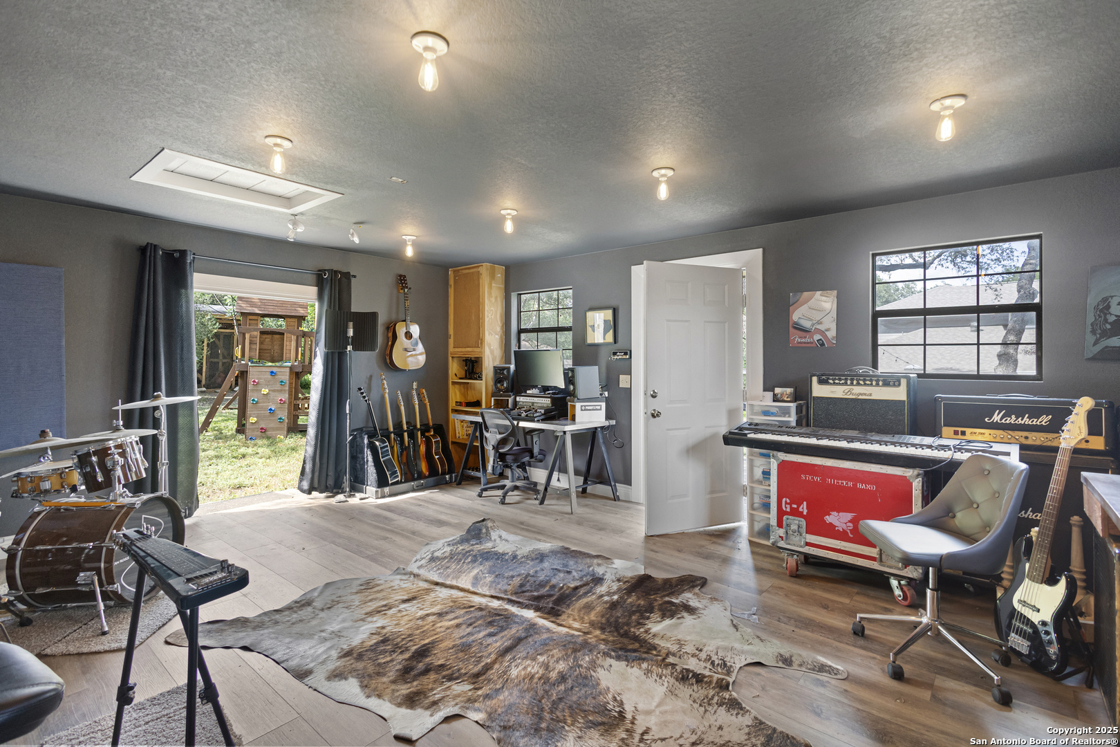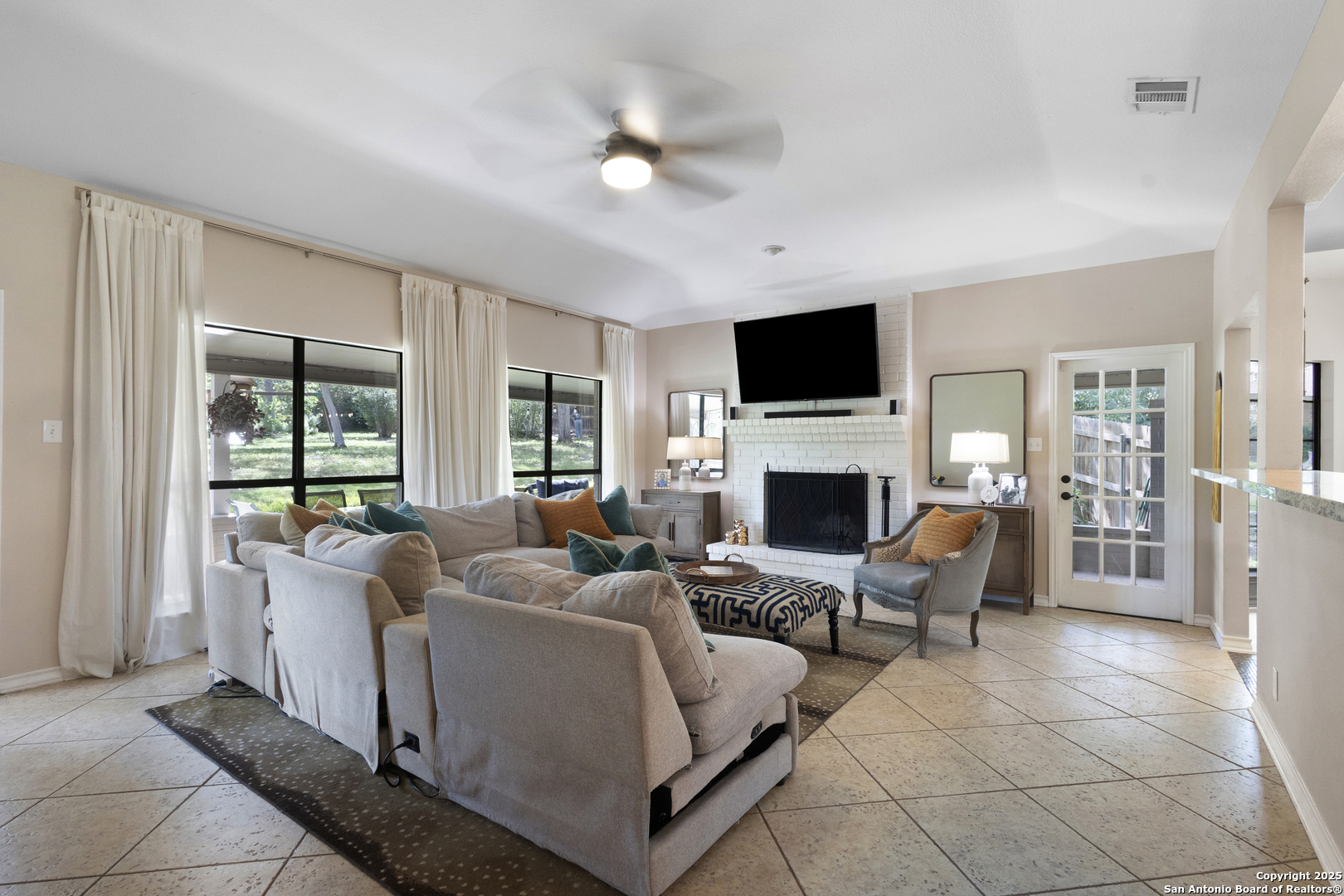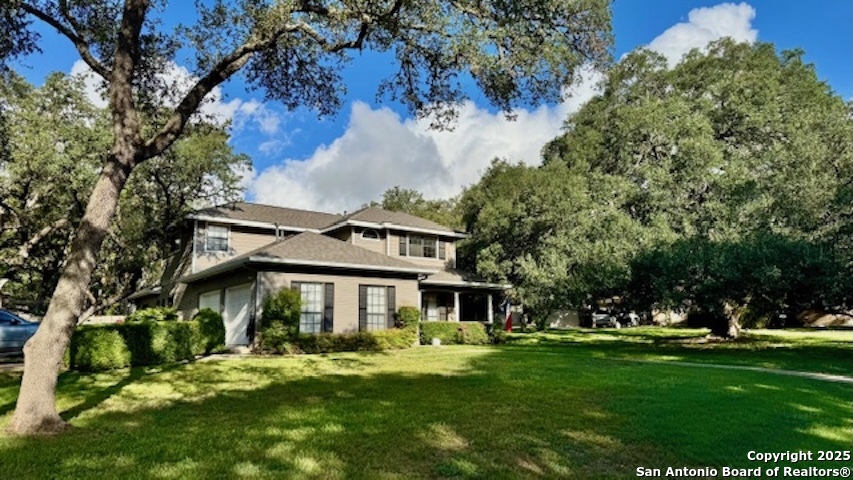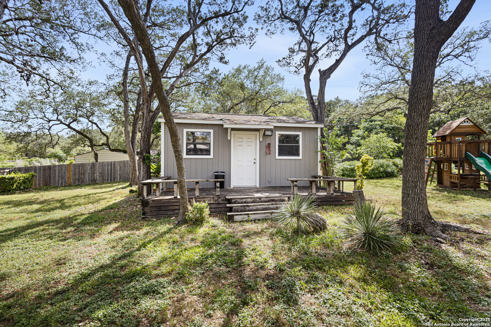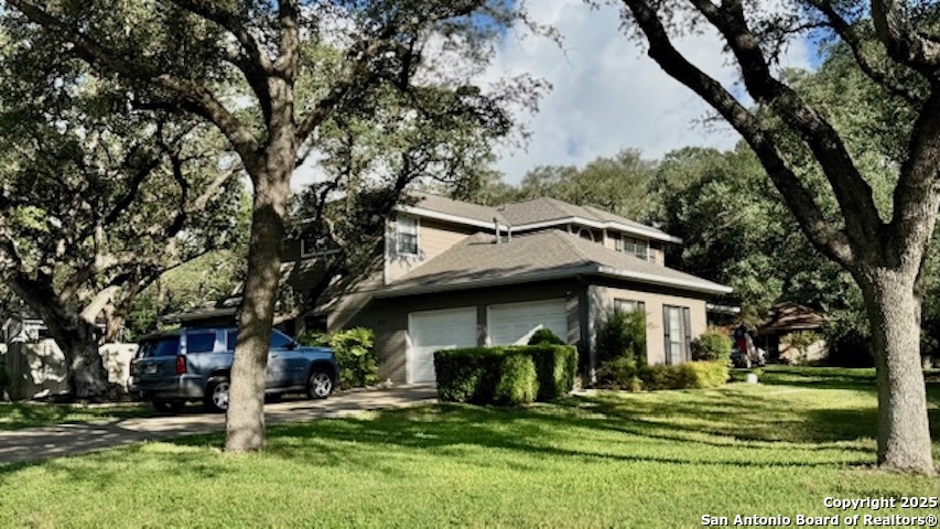Make your home in the scenic Garden Ridge Estates where you'll find extra large lots with gorgeous mature trees, friendly neighbors, and walkable streets. This well maintained 4 bedroom, 3.5 bath home comes complete with a tree covered yard including sprinkler system, landscaping, storage, chicken coop, and 160sqft shop building with ac/ht. Inside you'll find your primary bedroom suite downstairs with new carpet, large family room anchored by a nice brick fireplace and wall lined with windows overlooking the expansive outdoor covered patio. There is a unique breakfast area off the kitchen and a dining room currently used as an office by the owner. Upstairs you'll find 3 bedrooms and 2 baths, one which has a brand new extra large tiled shower. Note, room sizes are estimates only. Brand new roof and gutters were just put on this Spring. New AC for upstairs. Garden Ridge has a lovely neighborhood gym and pool available with membership. This scenic area between San Antonio and New Braunfels is growing but still has the small-town feel about it. Looking for a quiet area yet minutes from all the necessities? Check out Garden Ridge Estates.