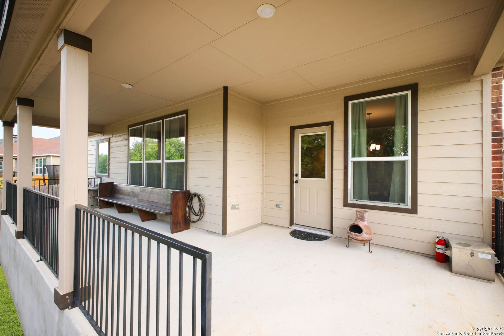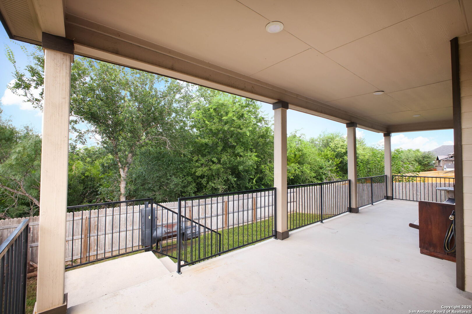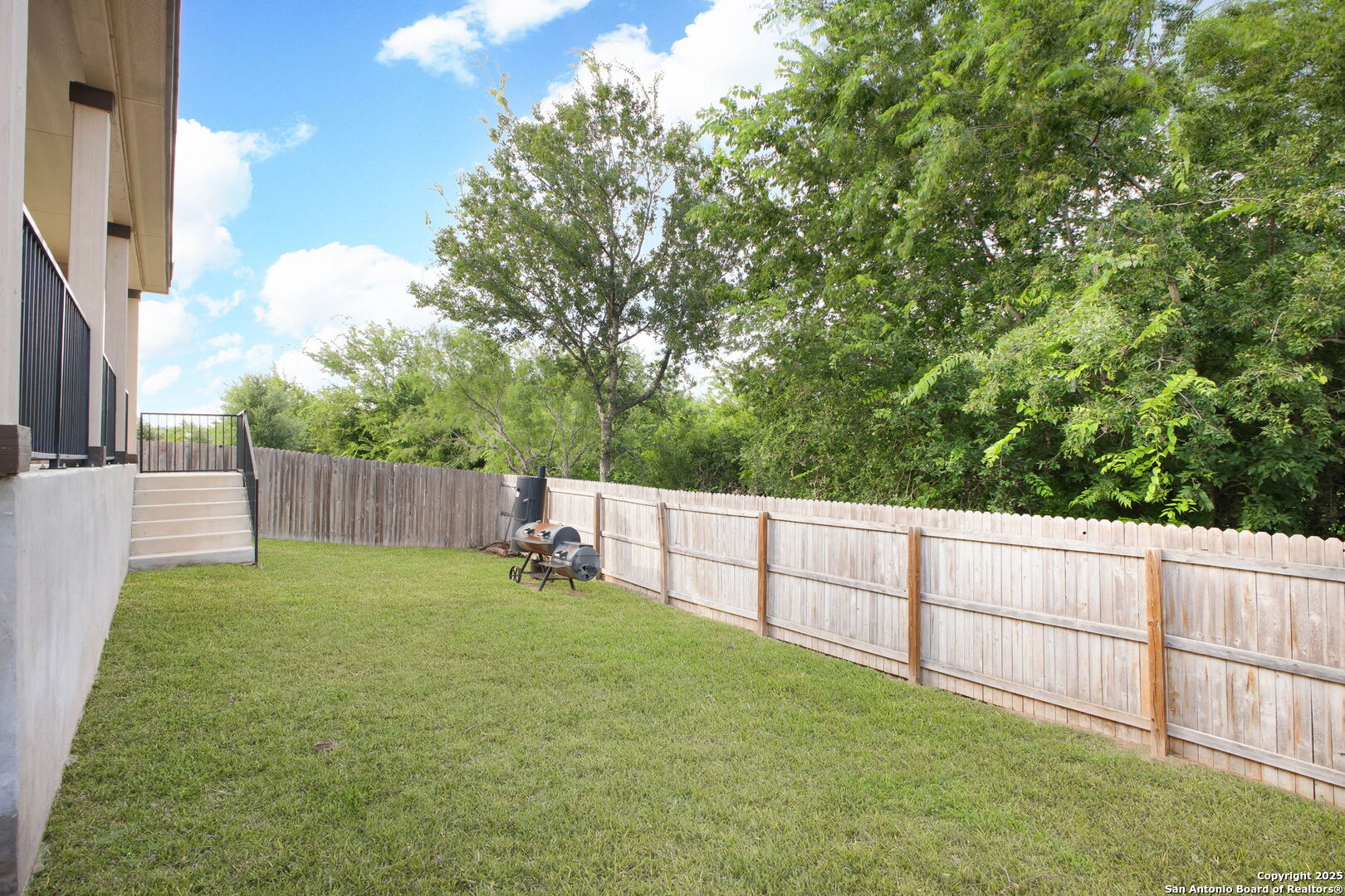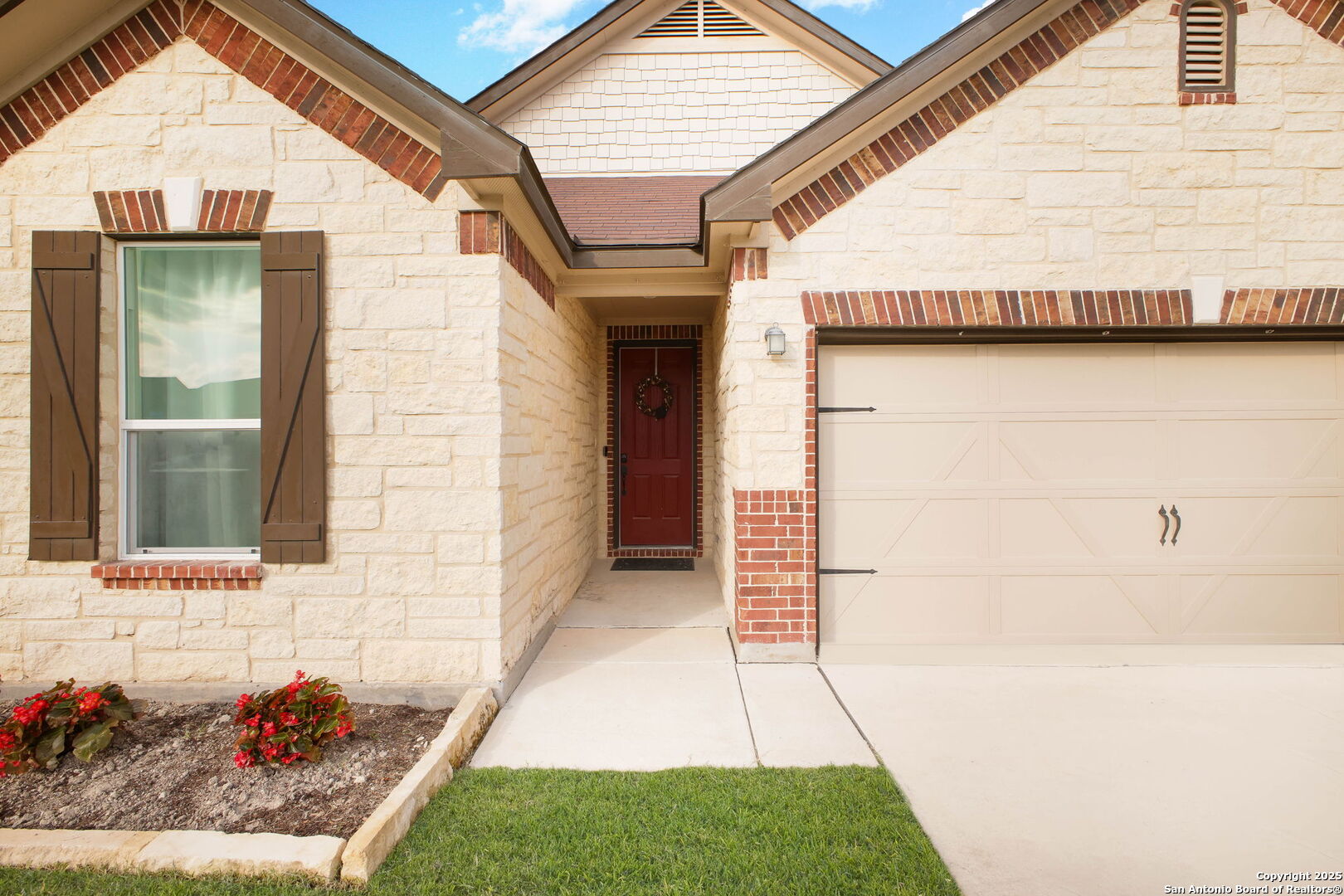 Step into easy living in this stunning one-level retreat, uniquely designed to offer a "treehouse effect" with relaxing greenbelt views and unparalleled backyard privacy. The home boasts a customized floor plan thoughtfully designed for today's lifestyle. The sprawling living room is a true sanctuary designed for grand gatherings and comfortable everyday living. Natural light floods through abundant windows, creating an inviting and airy atmosphere. Imagine hosting friends around your stylish and expansive entertaining granite peninsula, with sleek Whirlpool appliances making every gathering a breeze. Privacy abounds with a spacious separate owner's wing, two walk-in closets, and nearby flex room perfect for a nursery or home office. Your guests will feel at home in their own wing, featuring generously sized bedrooms. Framed mirrors in each bathroom complete this home's attention to detail. Extend your living outdoors on the unique, expansive porch, where you can soak in the views and unwind in the tranquility of the low-maintenance yard. You're just moments away from medical facilities, shopping and your favorite HEB, and exciting restaurants. Located in the highly desirable Texas Research Park, this gem offers easy access to a community pool, playground, scenic hiking trails, and a nearby public golf course. The Amazon Fulfillment Center is 15 minutes away, and you're a quick 30-minute drive to Medina Lake. This home is an incredible opportunity you don't want to miss. Schedule a viewing today and make this stunning retreat your new home!