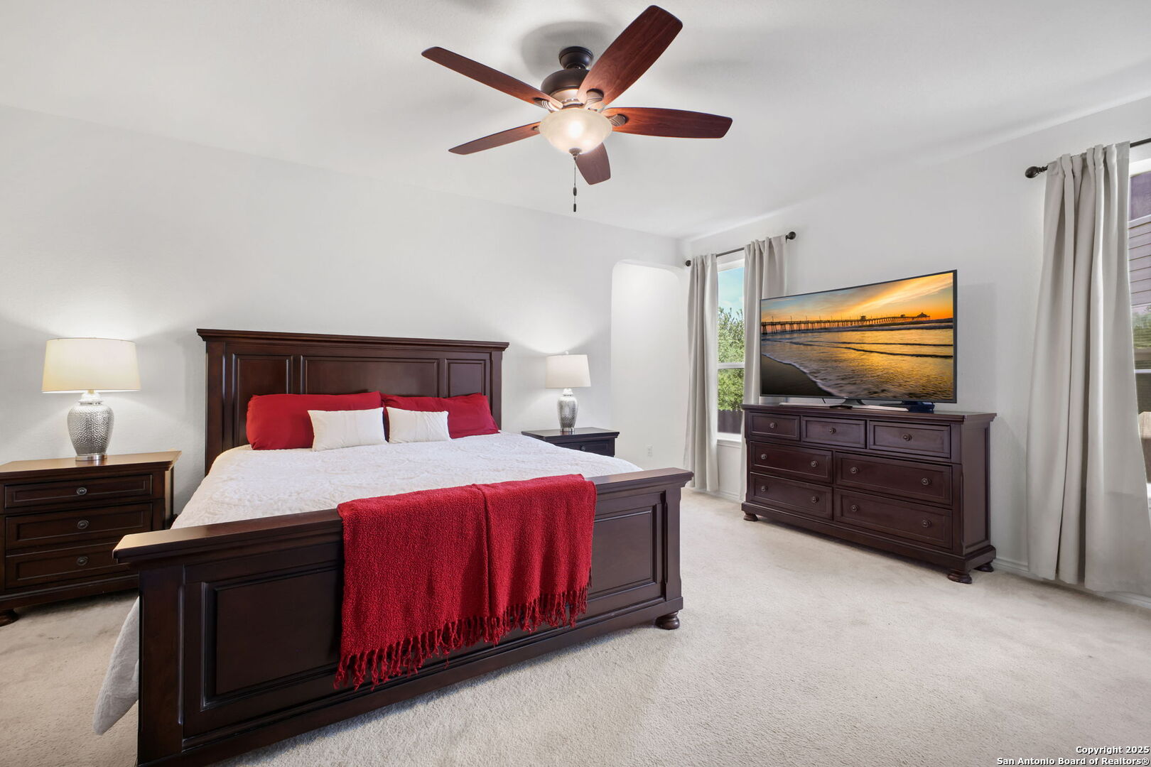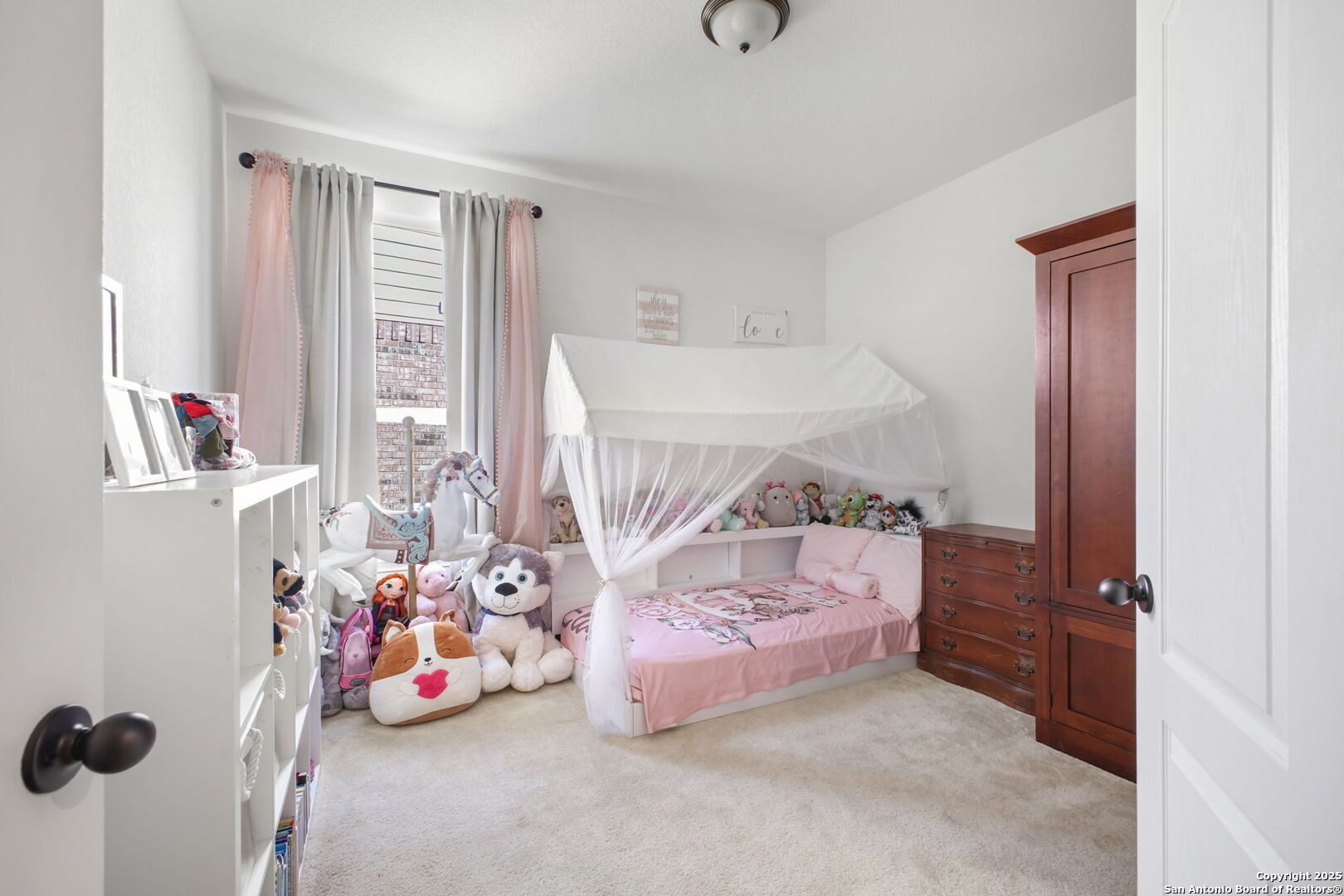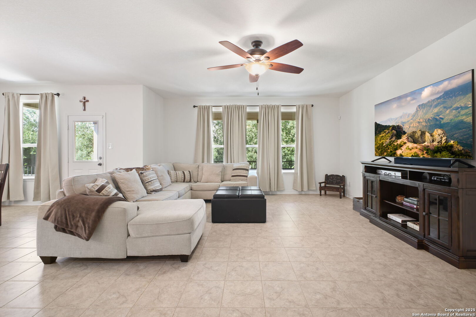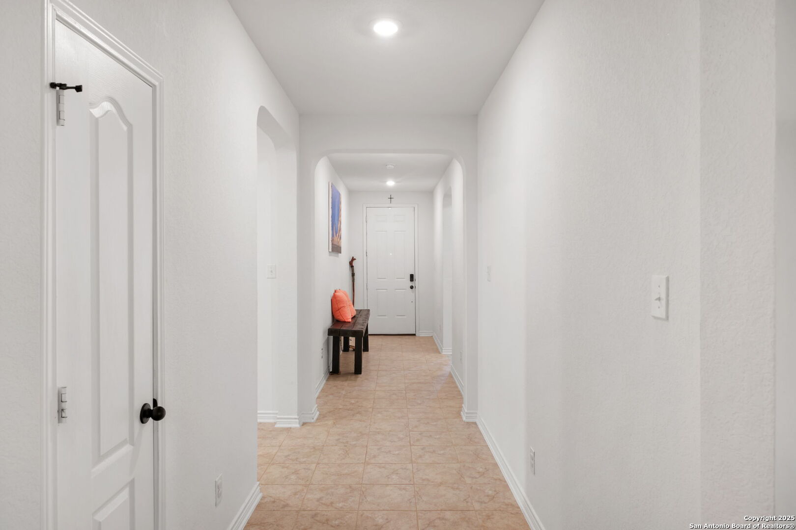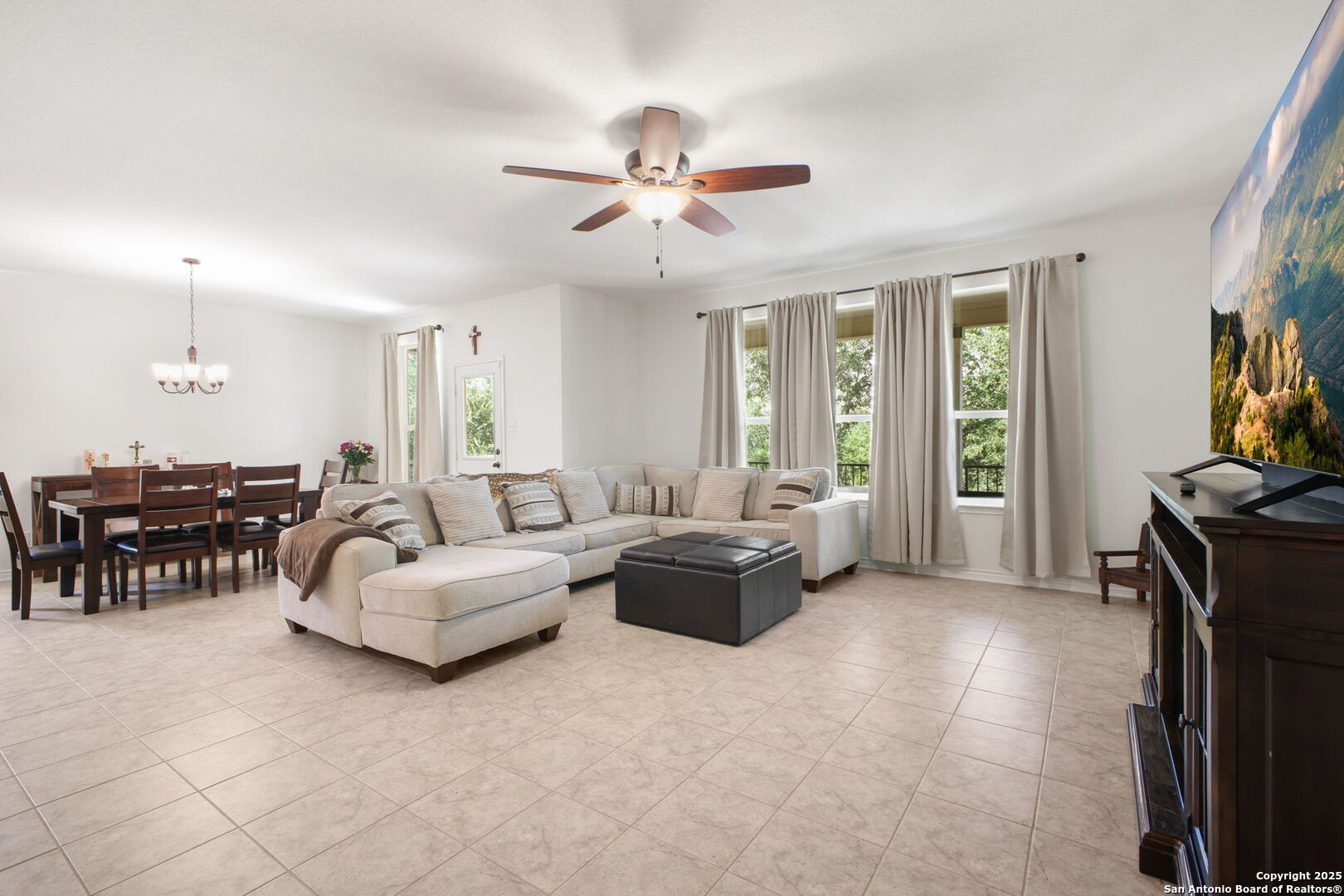 Step into easy living in this stunning one-level retreat, uniquely designed to offer a "treehouse effect" with relaxing greenbelt views and unparalleled backyard privacy. The home boasts a customized floor plan thoughtfully designed for today's lifestyle. The sprawling living room is a true sanctuary designed for grand gatherings and comfortable everyday living. Natural light floods through abundant windows, creating an inviting and airy atmosphere. Imagine hosting friends around your stylish and expansive entertaining granite peninsula, with sleek Whirlpool appliances making every gathering a breeze. Privacy abounds with a spacious separate owner's wing, two walk-in closets, and nearby flex room perfect for a nursery or home office. Your guests will feel at home in their own wing, featuring generously sized bedrooms. Framed mirrors in each bathroom complete this home's attention to detail. Extend your living outdoors on the unique, expansive porch, where you can soak in the views and unwind in the tranquility of the low-maintenance yard. You're just moments away from medical facilities, shopping and your favorite HEB, and exciting restaurants. Located in the highly desirable Texas Research Park, this gem offers easy access to a community pool, playground, scenic hiking trails, and a nearby public golf course. The Amazon Fulfillment Center is 15 minutes away, and you're a quick 30-minute drive to Medina Lake. This home is an incredible opportunity you don't want to miss. Schedule a viewing today and make this stunning retreat your new home!