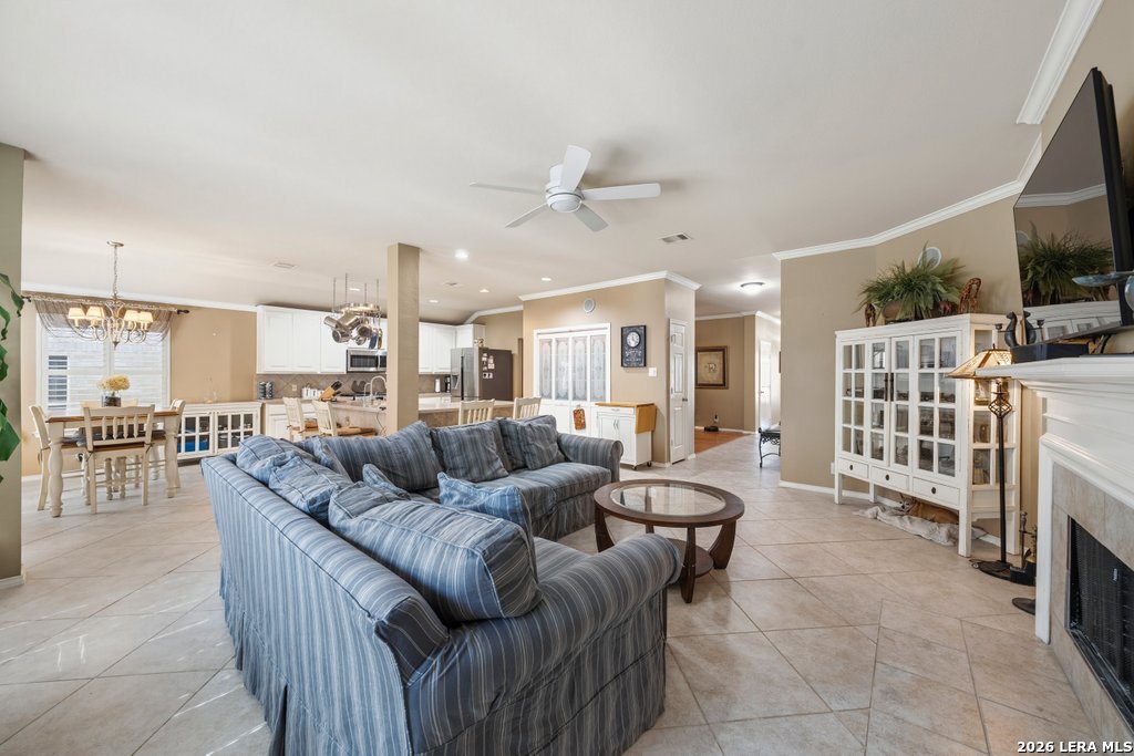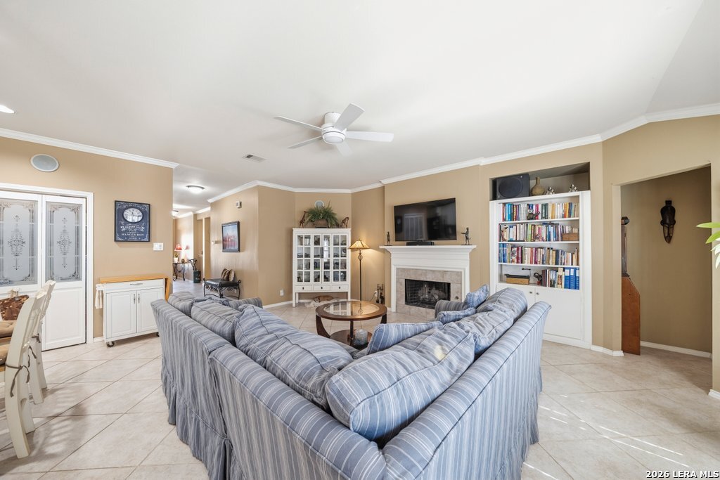 Brand new roof! Beautifully maintained single-story home in the desirable Oak Run community, situated on a spacious corner lot with mature trees and great curb appeal. This 3-bedroom + study home offers a functional, open layout with abundant natural light, high ceilings, crown molding, and plantation shutters throughout. The living area features a fireplace and flows seamlessly into the kitchen and breakfast space-ideal for everyday living and entertaining. The island kitchen includes a breakfast bar, built-in pantry, gas cooking with a 5-burner stove, and ample counter space. A dedicated study/office offers flexibility and could easily serve as a 4th bedroom if needed. The split-bedroom design provides privacy, with all bedrooms on the main level and no interior steps. The spacious primary suite features French doors, a large walk-in closet, and a bath with garden tub and separate shower. Secondary bedrooms are well-sized and thoughtfully positioned. Additional highlights include ceramic tile and wood flooring, reverse osmosis system Enjoy a private backyard with mature landscaping and a patio space, plus access to Oak Run amenities including pool, tennis, and park.
