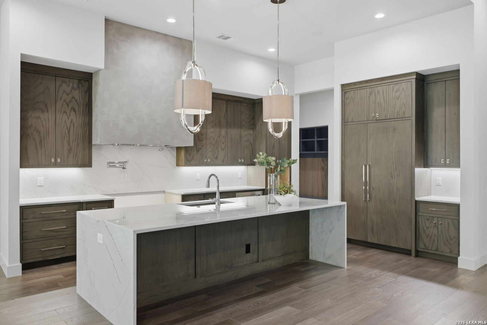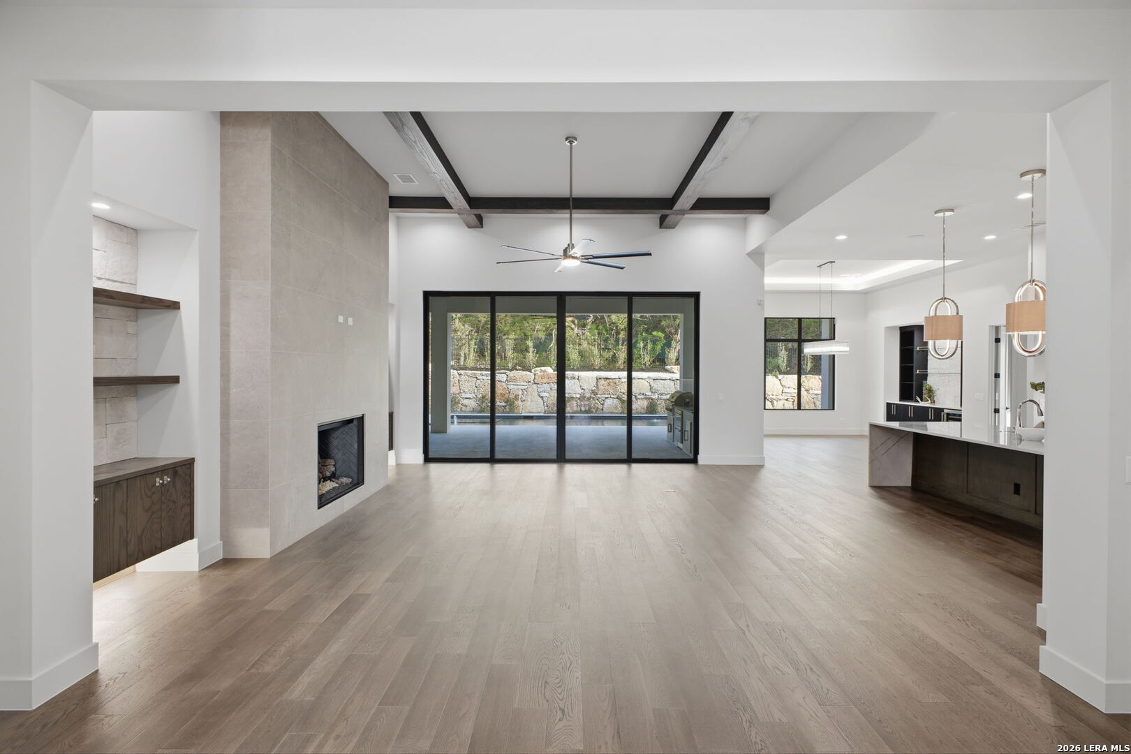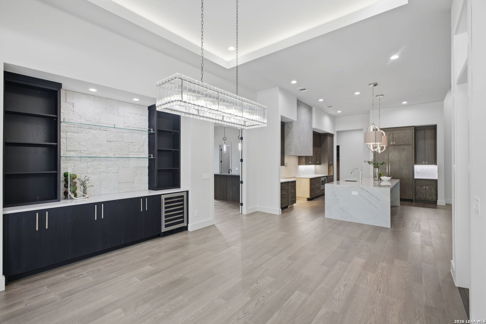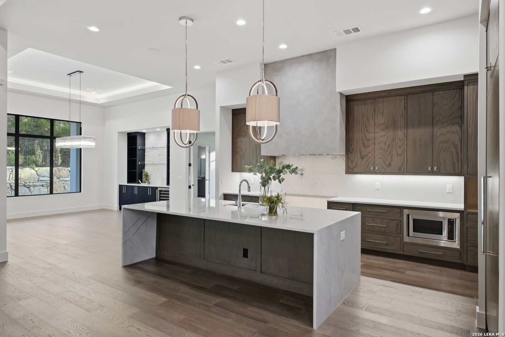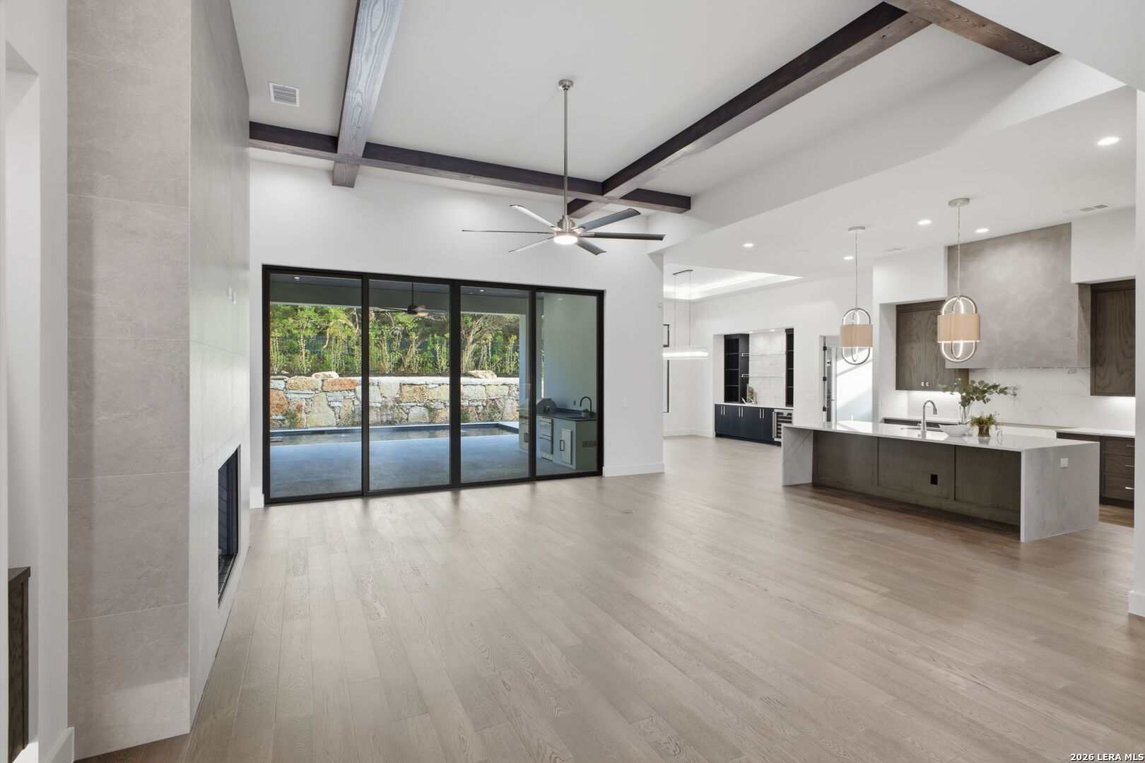 Welcome to this new one-story Modern Transitional estate which embodies show stopping detail and sophistication within The Dominion. The over 5,200 sq/ft home features unsurpassed craftsmanship and design elements that showcase the open floor plan seamlessly integrating indoor and outdoor living. The chef's kitchen features top of the line appliances, an expansive custom island that flows into the living/dining room with custom architectural ceiling detail, a dramatic fireplace and large dining room area. 5 bedrooms all with on suite bathrooms. Oversized secondary game room or living room with outside access to pool. 4 car garage with tons of built in storage.