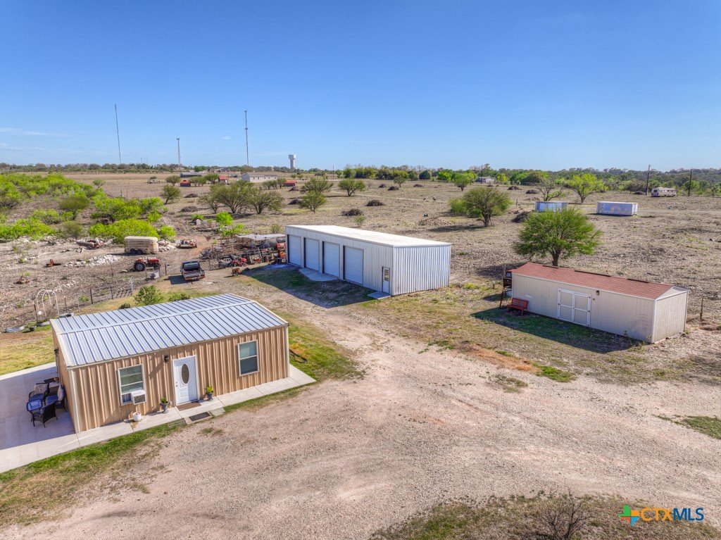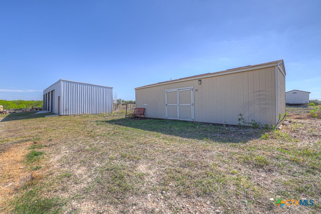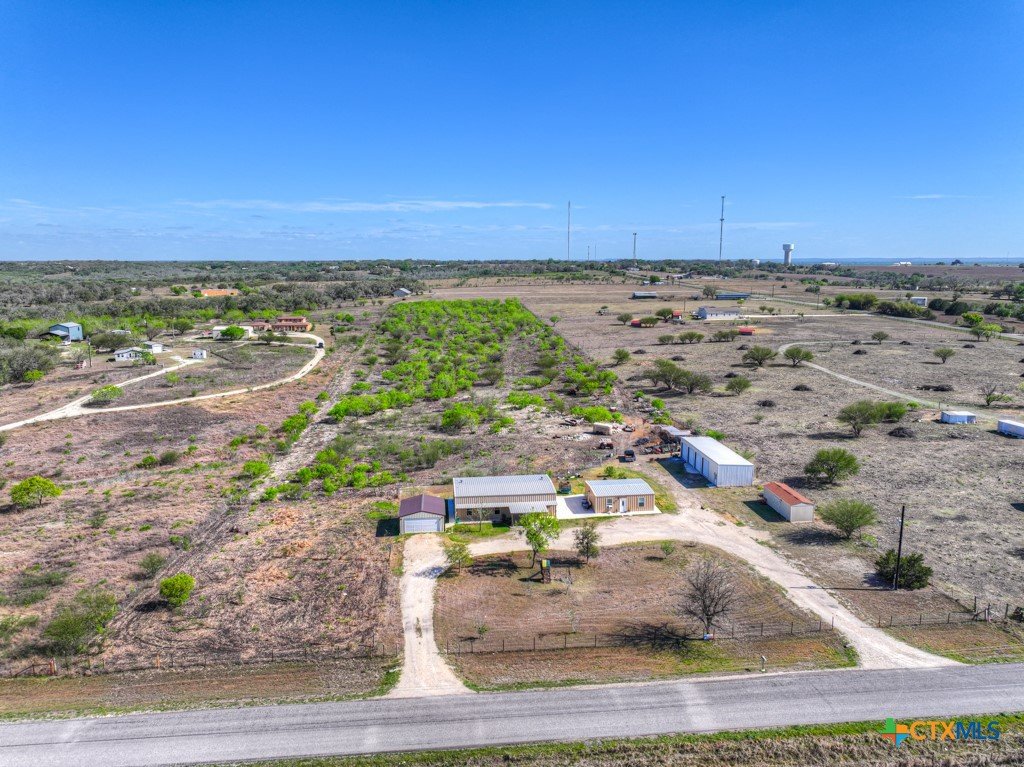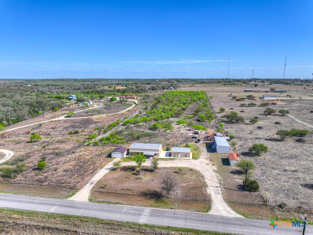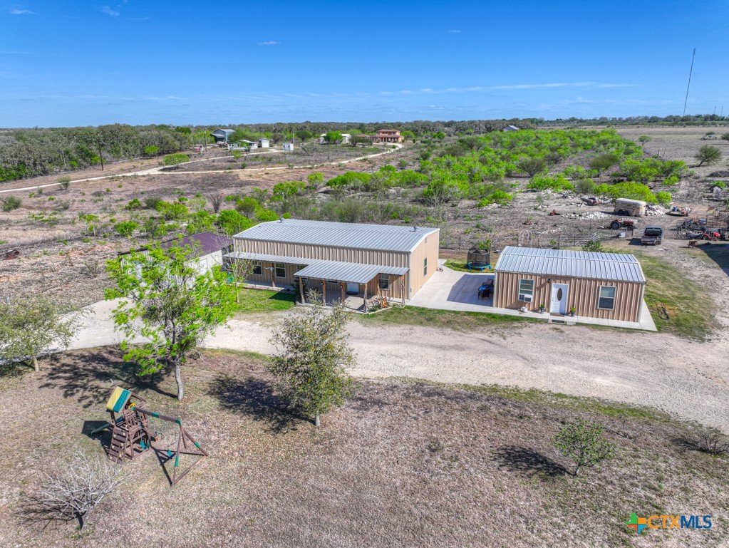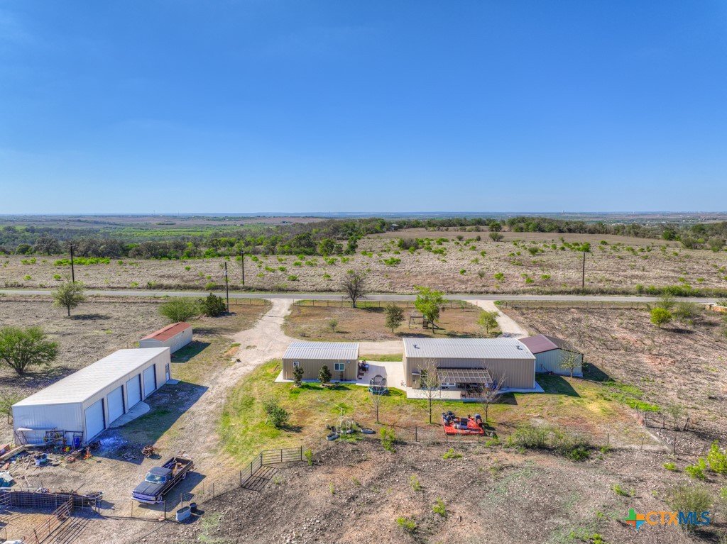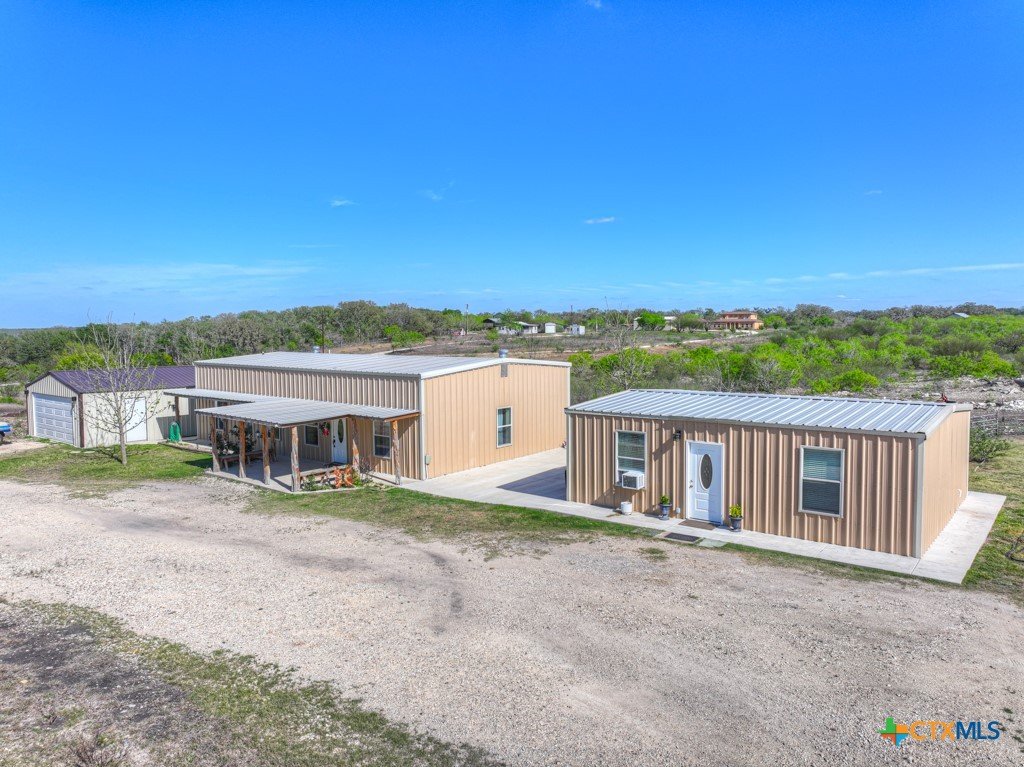 Discover 10 unrestricted acres offering exceptional access and dual residences—an ideal opportunity for those seeking space, flexibility, and scenic surroundings. The custom-built barndominium features durable 9-inch exterior insulated walls, with additional insulation in the attic and between interior walls for enhanced comfort and efficiency. The main home includes 1500 sq ft., four bedrooms, and an open-concept design, allowing for versatile living arrangements. The absence of built-in closets provides the freedom to customize storage solutions, whether through armoires or the addition of tailored closet spaces. The guest house is 750 sq ft, equally well-constructed and offers a spacious bedroom and bath, along with an inviting open layout that seamlessly connects the living, dining, and kitchen areas—perfect for extended family or guests. Step outside either residence to enjoy consistent breezes, as the property is situated along one of the highest elevations in the county. Take in expansive views stretching toward San Marcos, Seguin, and the surrounding countryside. The front portion of the property features a 24x30 garage suitable for multiple vehicles, as well as a five-bay 20 x 60 workshop with 10' roll-up doors, and is ideal for projects, storage, or business use. Additional amenities include two RV hookups and full perimeter fencing. With abundant space and flexibility, the property offers endless potential—whether continuing the established wildlife sanctuary or creating your own outdoor retreat.