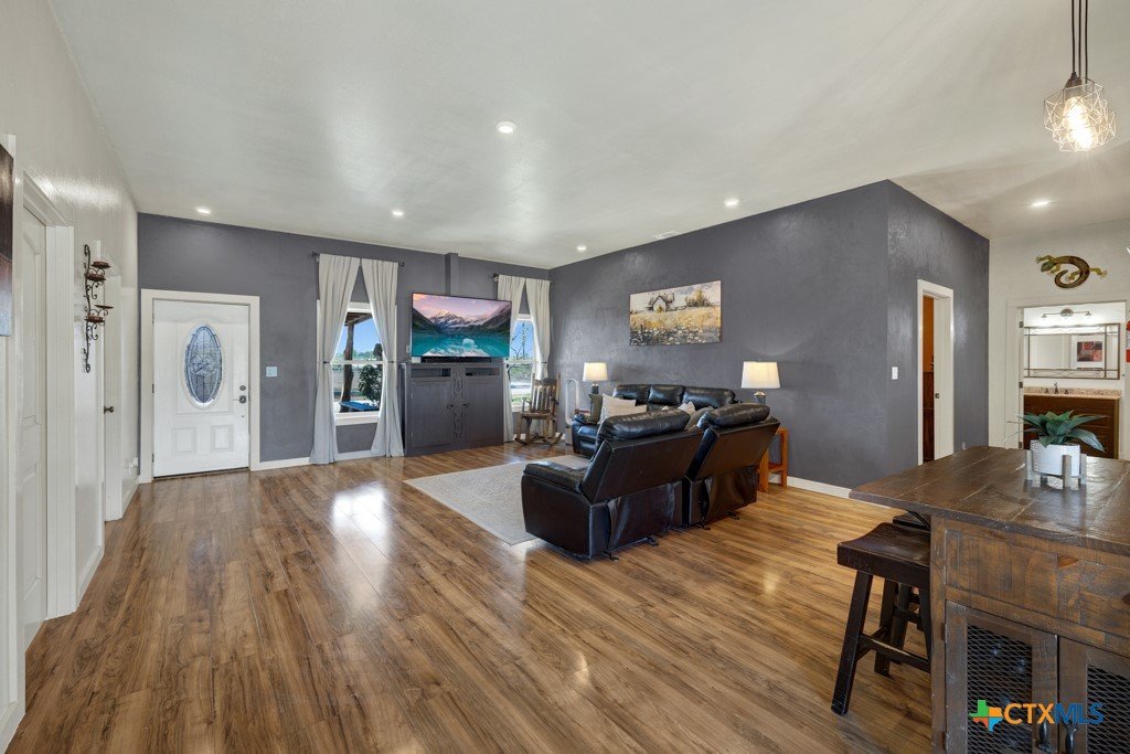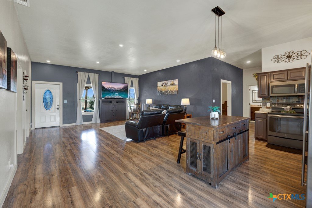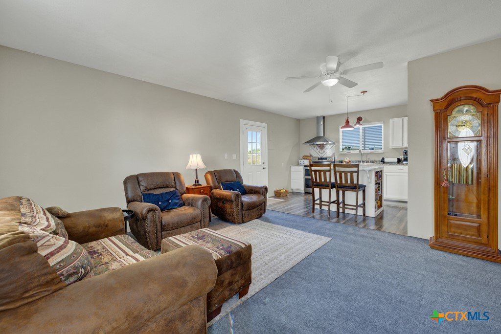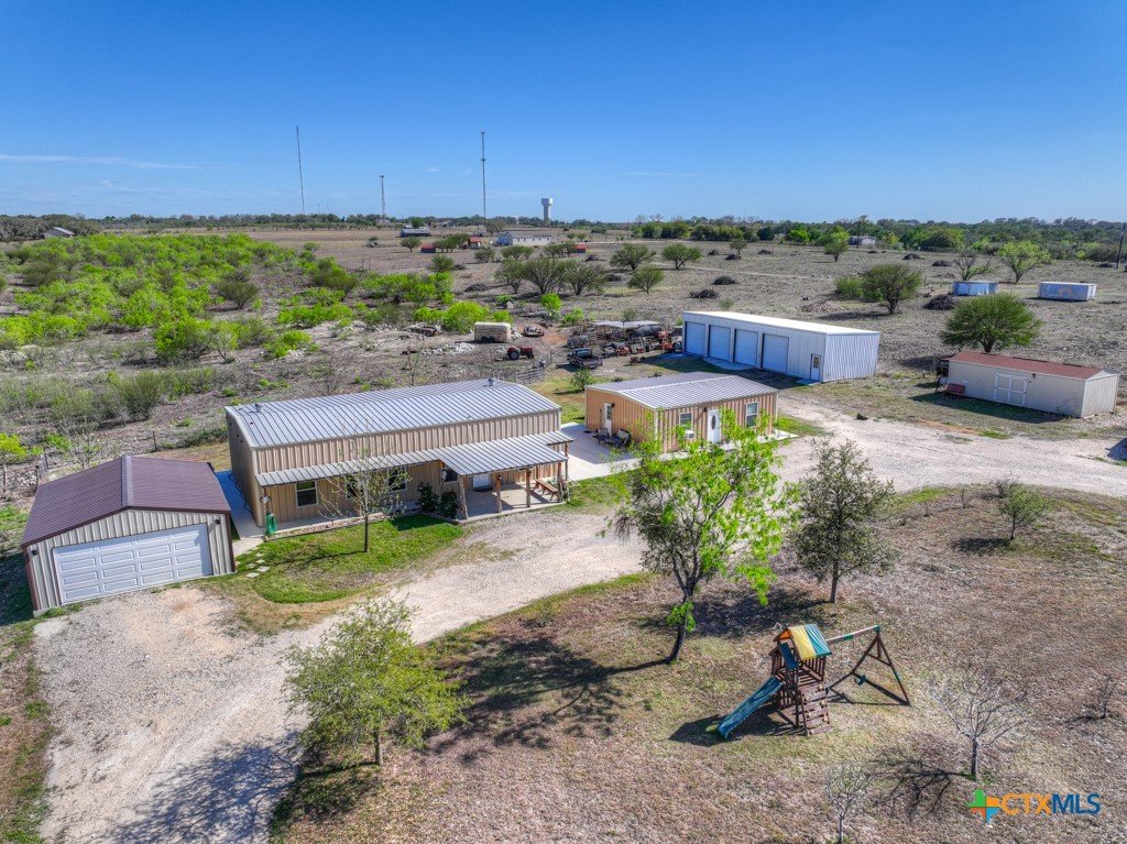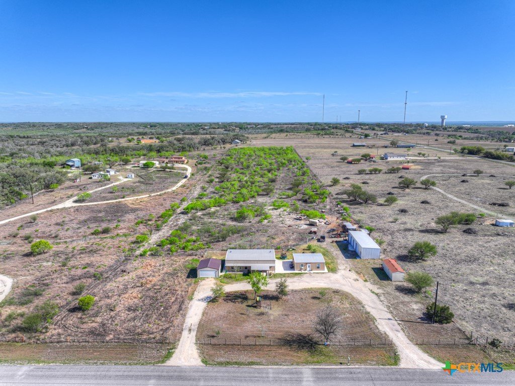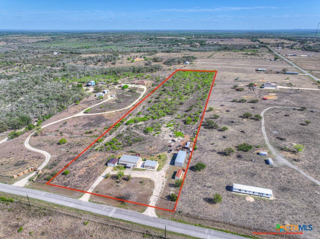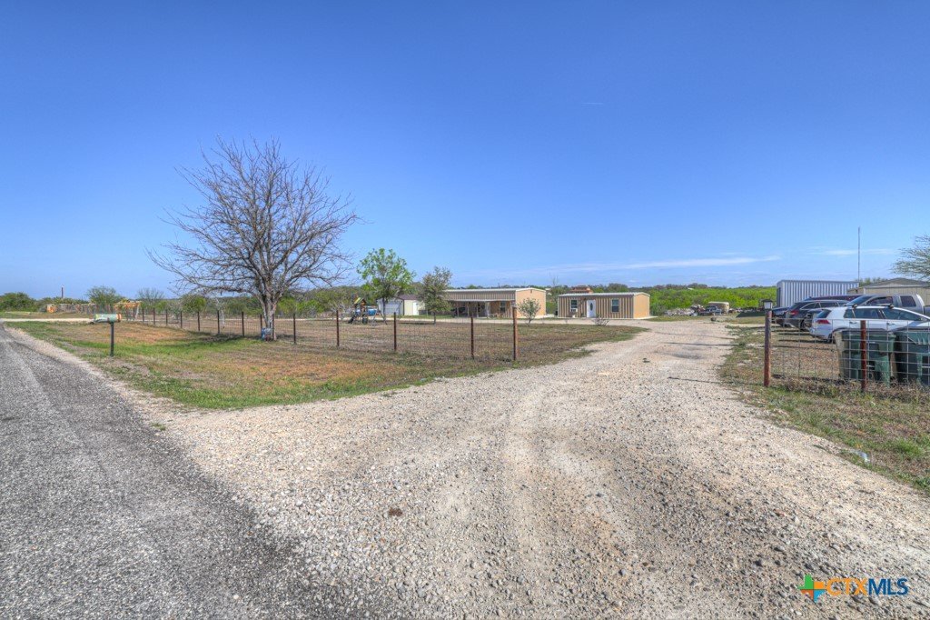 Discover 10 unrestricted acres offering exceptional access and dual residences—an ideal opportunity for those seeking space, flexibility, and scenic surroundings. The custom-built barndominium features durable 9-inch exterior insulated walls, with additional insulation in the attic and between interior walls for enhanced comfort and efficiency. The main home includes 1500 sq ft., four bedrooms, and an open-concept design, allowing for versatile living arrangements. The absence of built-in closets provides the freedom to customize storage solutions, whether through armoires or the addition of tailored closet spaces. The guest house is 750 sq ft, equally well-constructed and offers a spacious bedroom and bath, along with an inviting open layout that seamlessly connects the living, dining, and kitchen areas—perfect for extended family or guests. Step outside either residence to enjoy consistent breezes, as the property is situated along one of the highest elevations in the county. Take in expansive views stretching toward San Marcos, Seguin, and the surrounding countryside. The front portion of the property features a 24x30 garage suitable for multiple vehicles, as well as a five-bay 20 x 60 workshop with 10' roll-up doors, and is ideal for projects, storage, or business use. Additional amenities include two RV hookups and full perimeter fencing. With abundant space and flexibility, the property offers endless potential—whether continuing the established wildlife sanctuary or creating your own outdoor retreat.