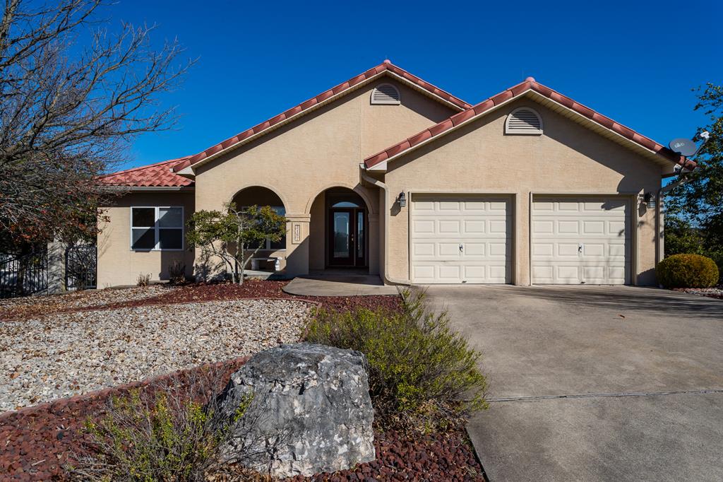 Exceptional View from this Hill Country style home featuring stucco exterior, tile roof, and attractive curb appeal with low maintenance zeroscaped yard. Open Concept floorplan with foyer leading to spacious great groom with gas fireplace, large windows allowing lots of natural light with beautiful Hill Country Views. Pine floors in Foyer extending to Dining Room, Kitchen, and Breakfast Area. Private master suite with sitting area with full bath and walk in shower. Main Level Features 3 bedrooms and 2 bathroom. Second Level Features 2 additional bedrooms and a bathroom, Family Room that could be used as Office or even a 6th bedroom has it's own private entry. Lots possibilities with rooms and space! 2 TREX Decks off upper and lower levels with outstanding views!